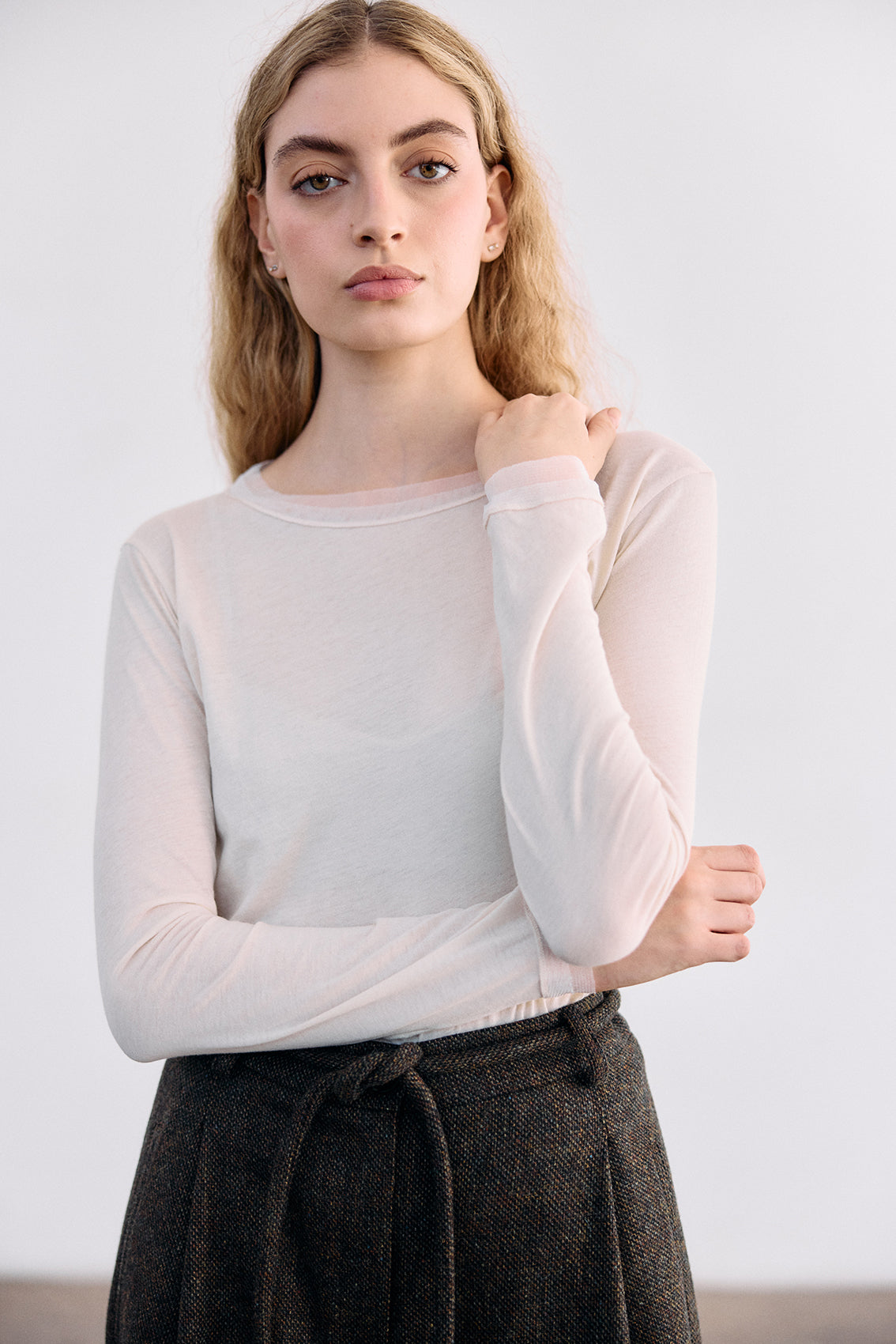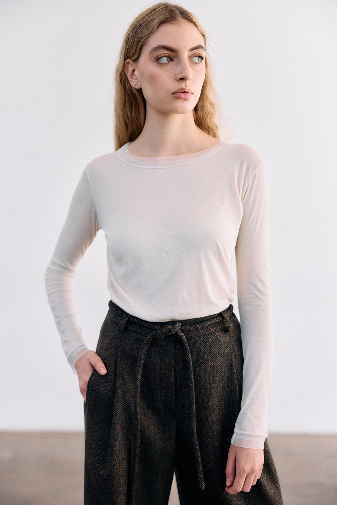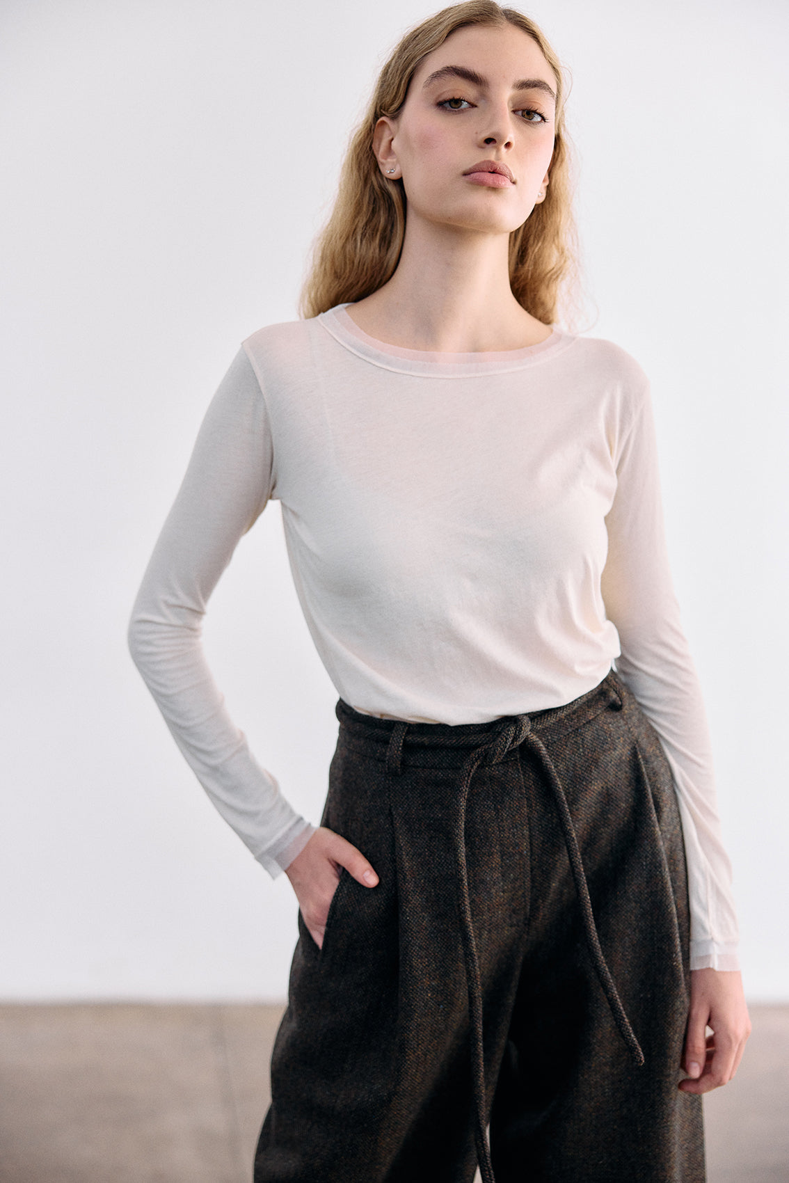 Essential long-sleeve top, made in 100% pima cotton. This thin woven basic features a classic crew neck and is finished with 100% silk trim edges. A high-quality essential first layer for autumn and winter.