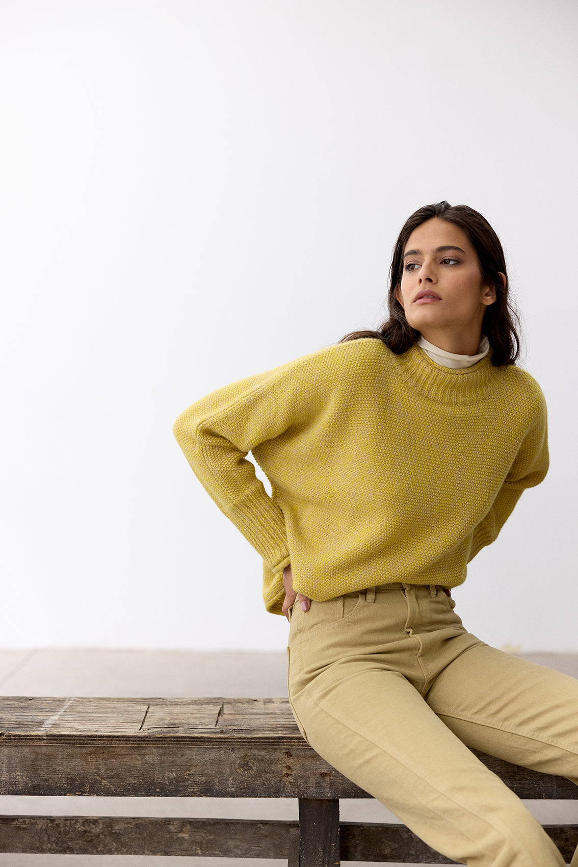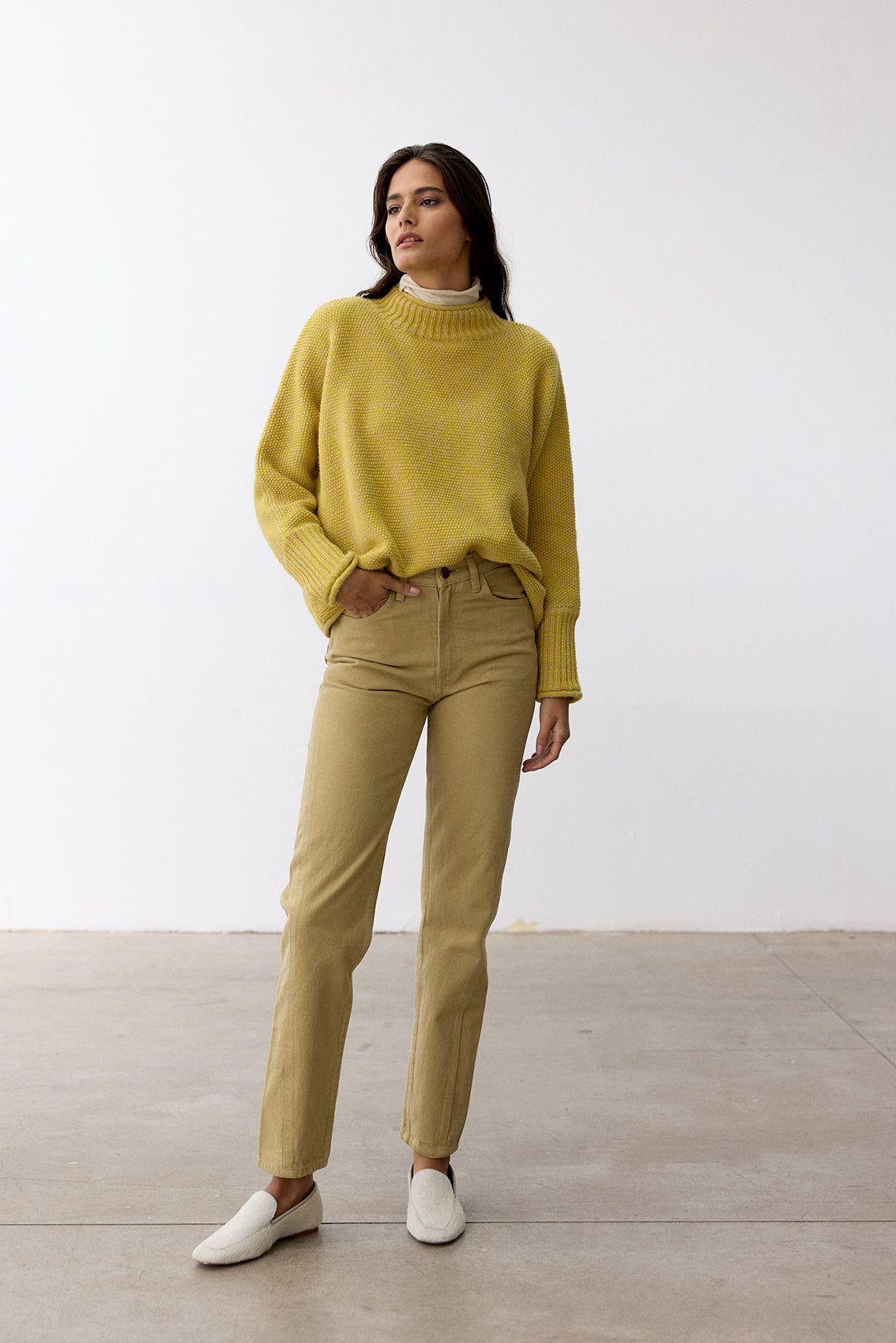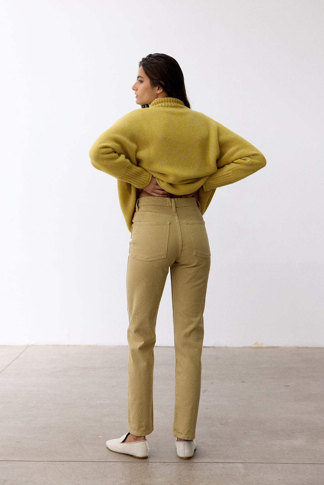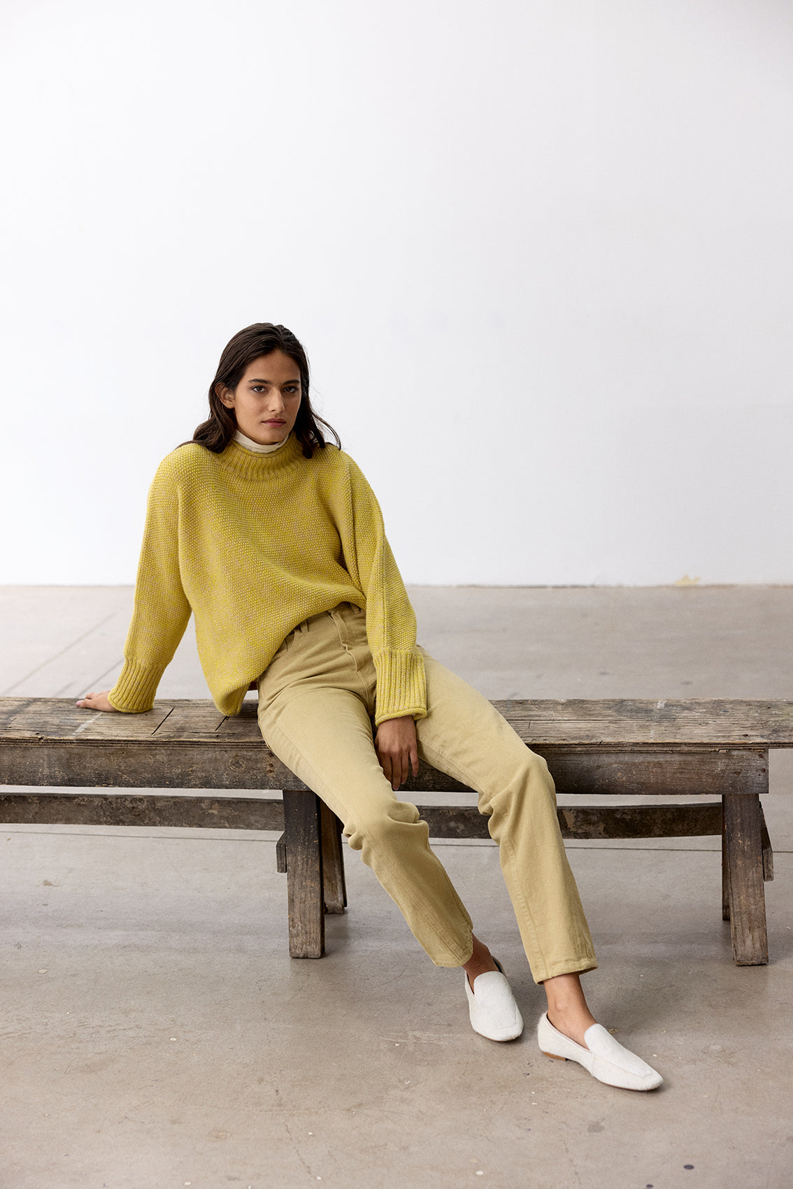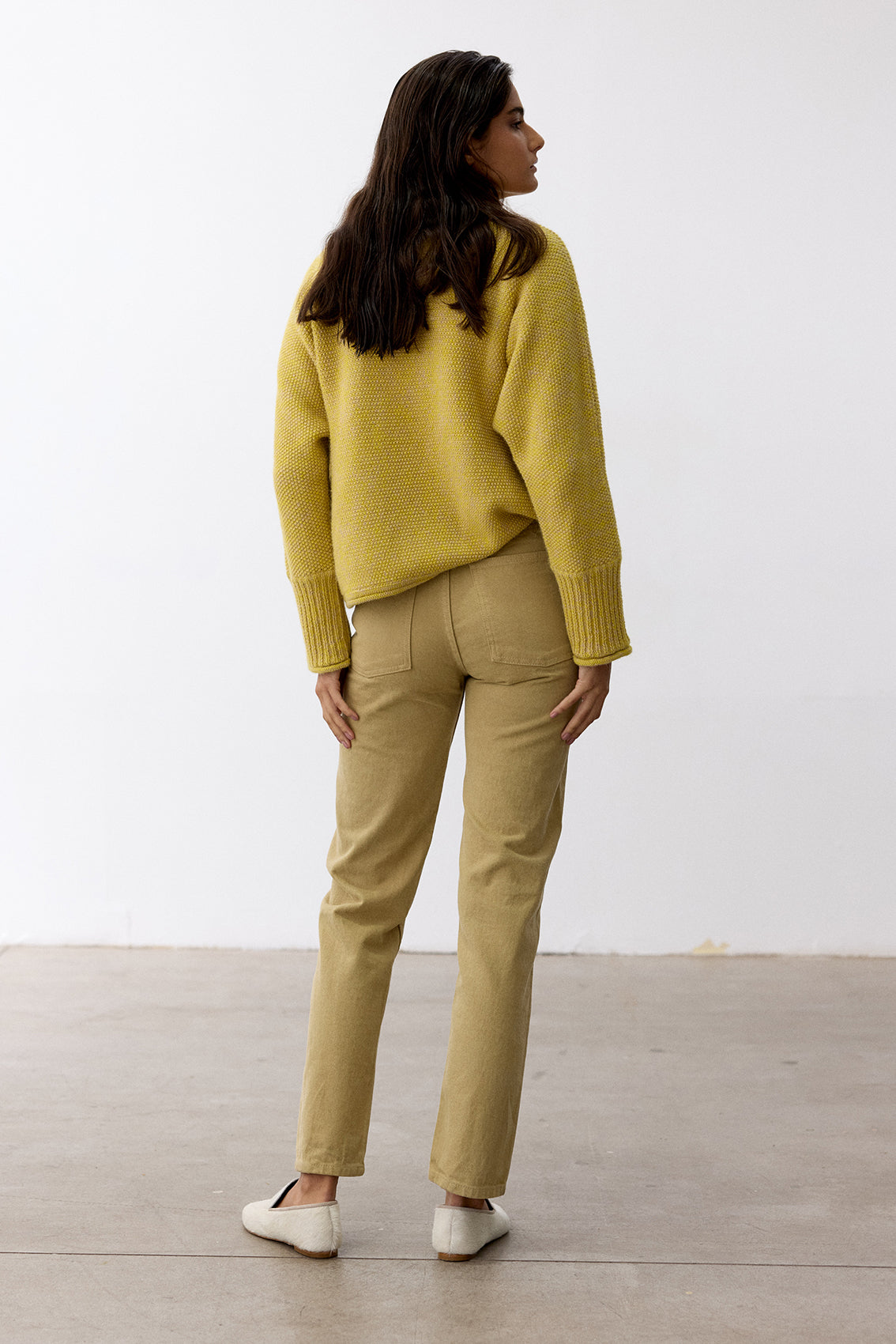The upcycled denim material is crafted through a circular system from all-natural fibers. Made from 70% recycled denim and 30% virgin cotton. Non-stretch.