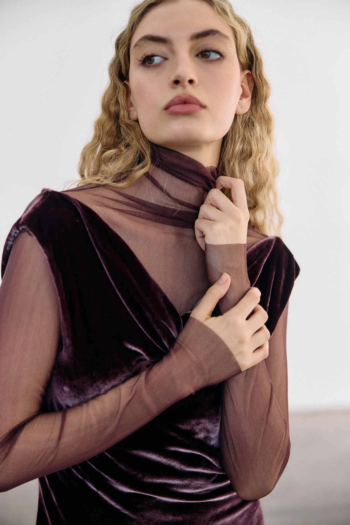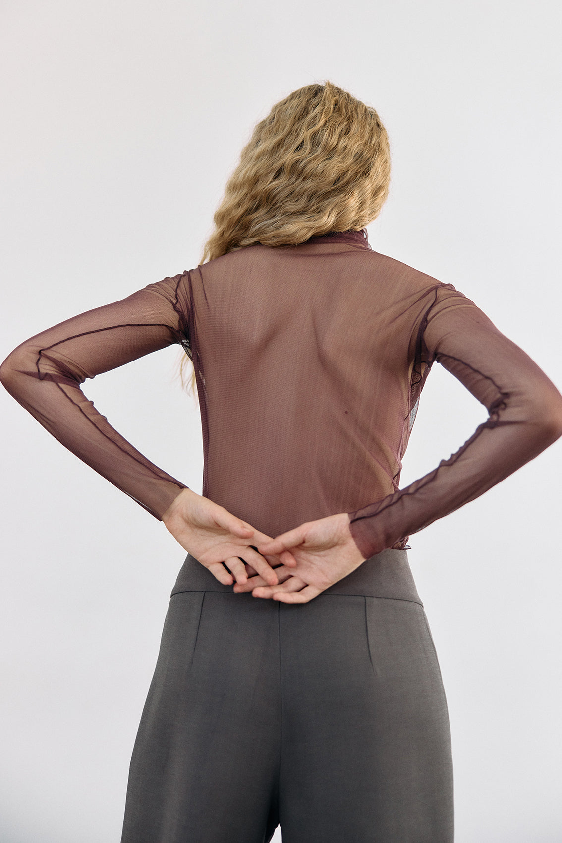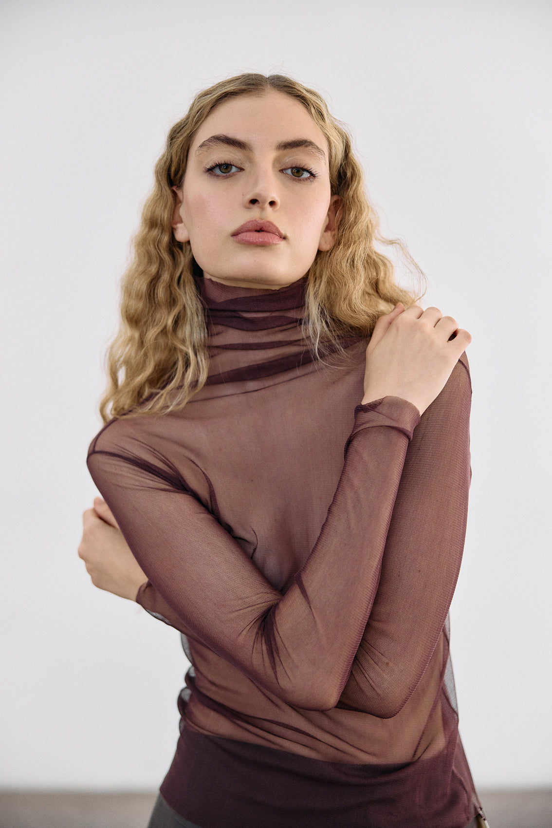 Sheer turtleneck long-sleeve top, made in knitted. This ideal layering top features a continuous neck. A delicate piece for various occasions.