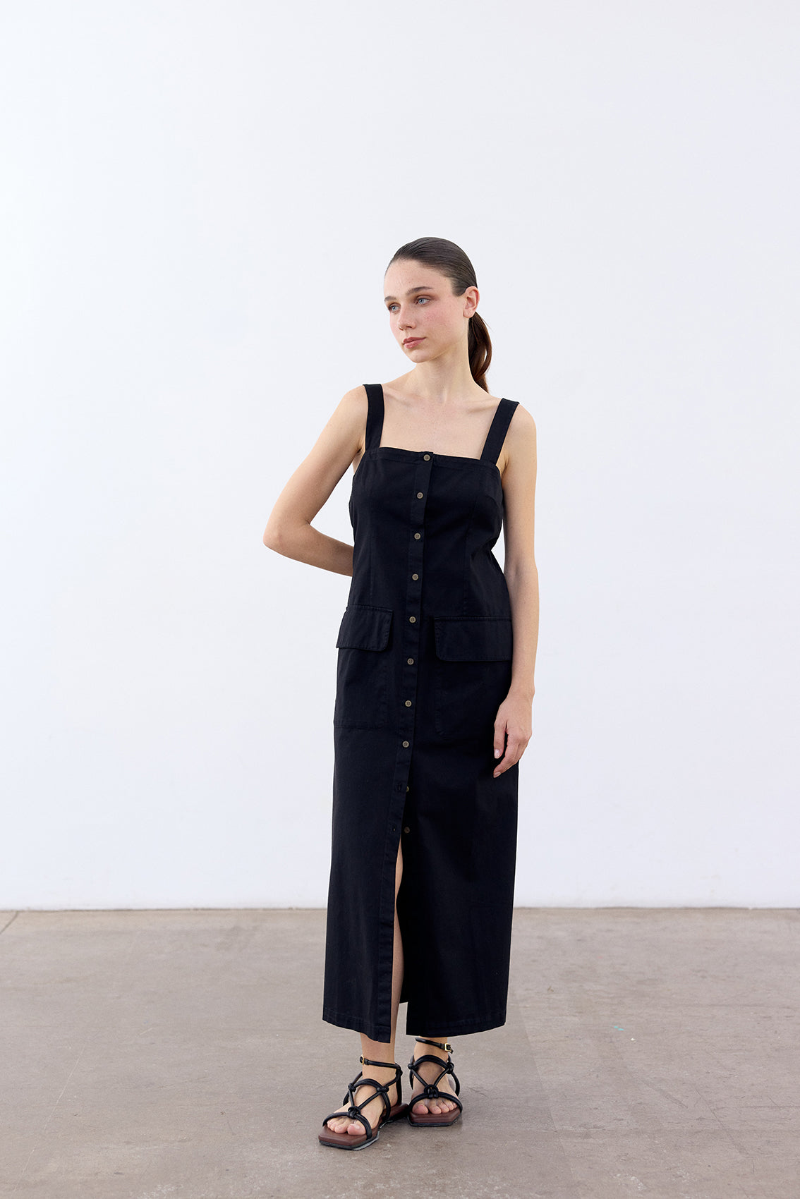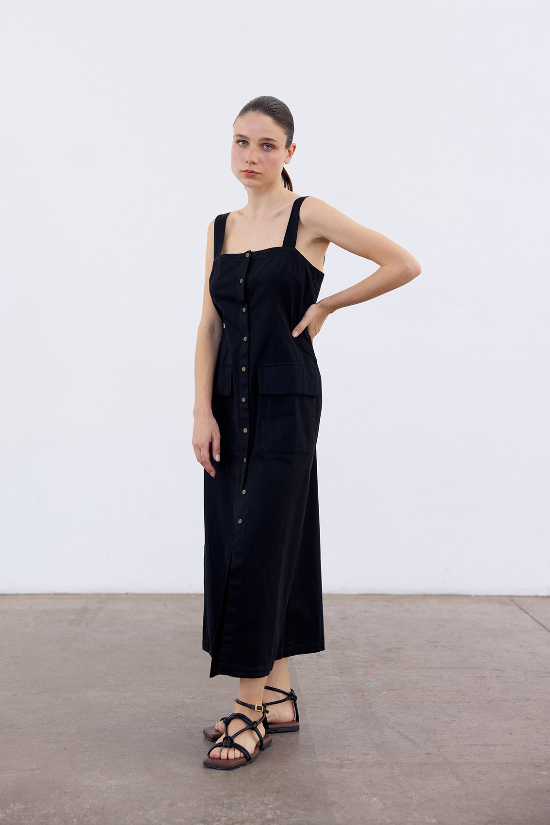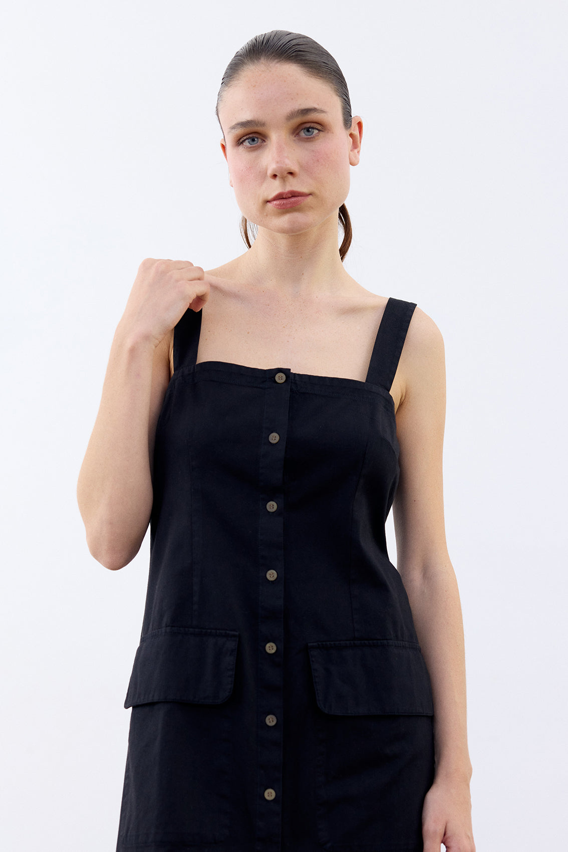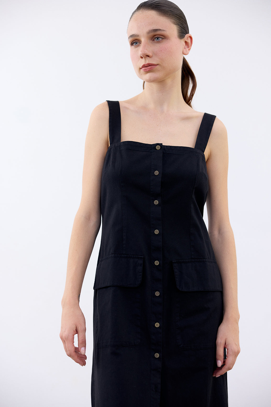 Long sleeveless dress with a buttoned front and squared neckline. Crafted in docile Peruvian cotton. It features two straps, a flattering and comfortable waist, and a slightly A-line cut at the bottom. With functional pockets. A highly wearable summer piece.
