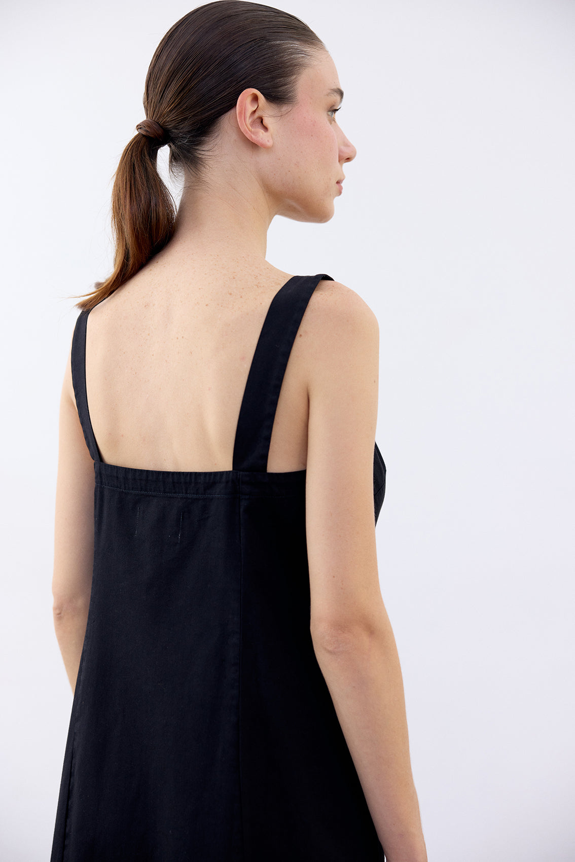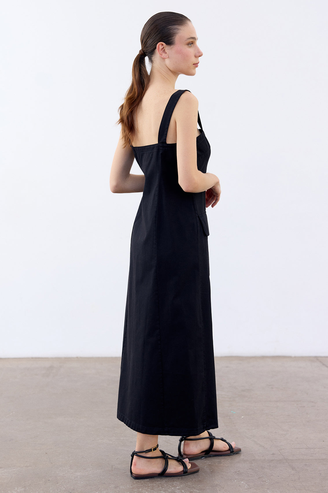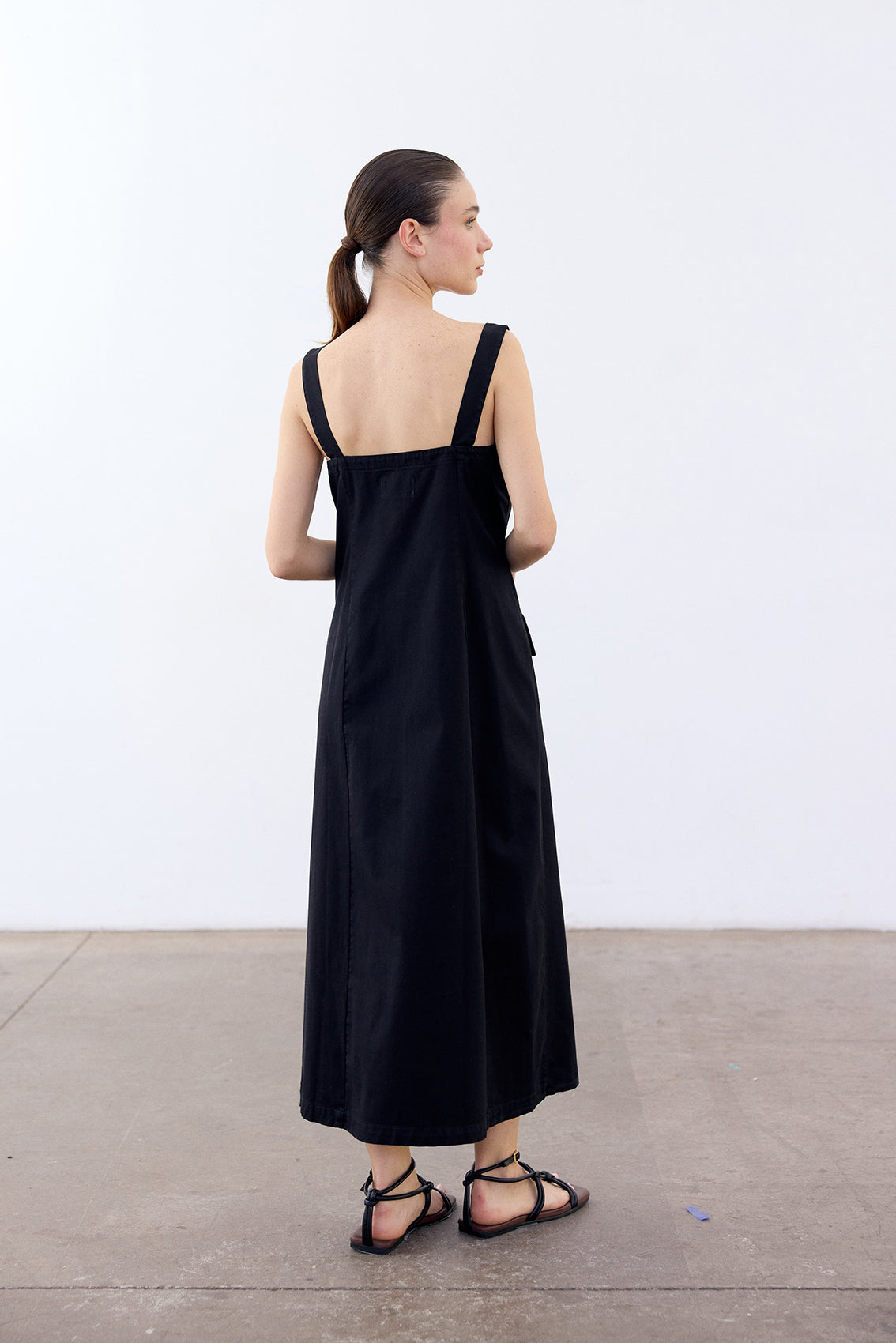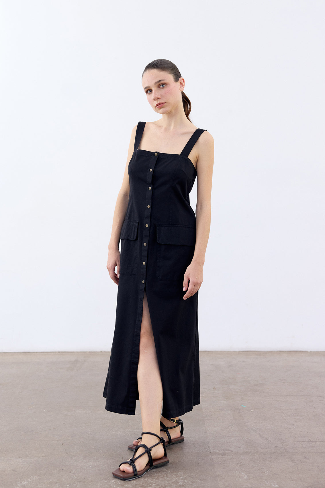 Long sleeveless dress with a buttoned front and squared neckline. Crafted in docile Peruvian cotton. It features two straps, a flattering and comfortable waist, and a slightly A-line cut at the bottom. With functional pockets. A highly wearable summer piece.