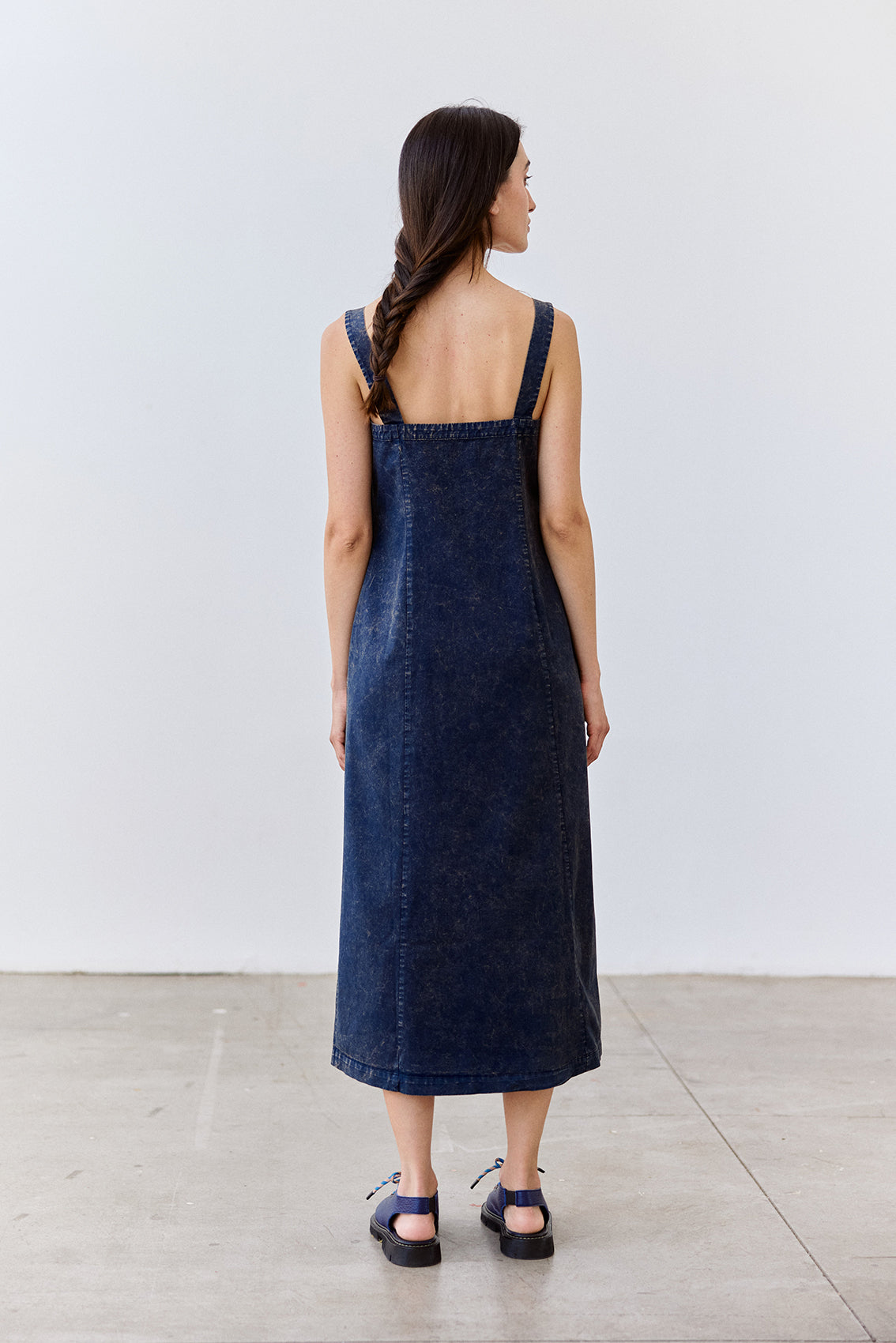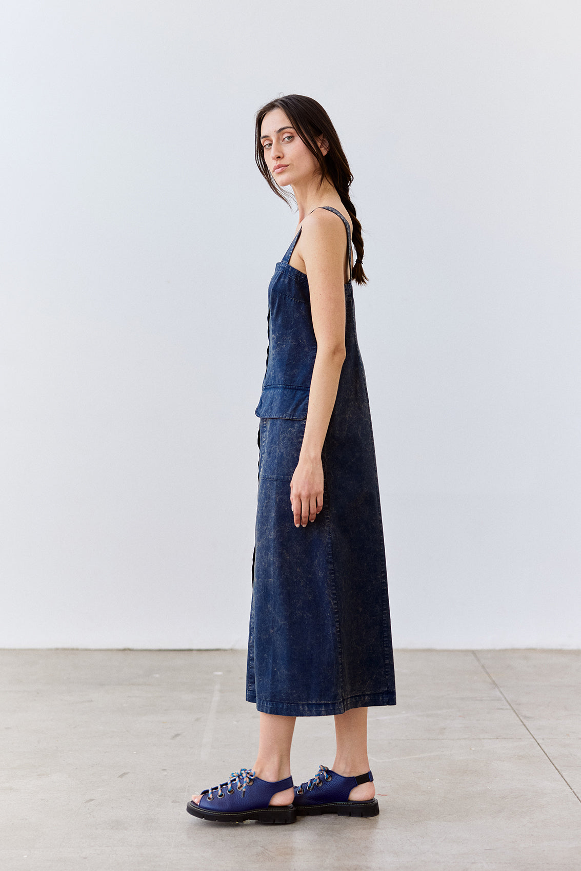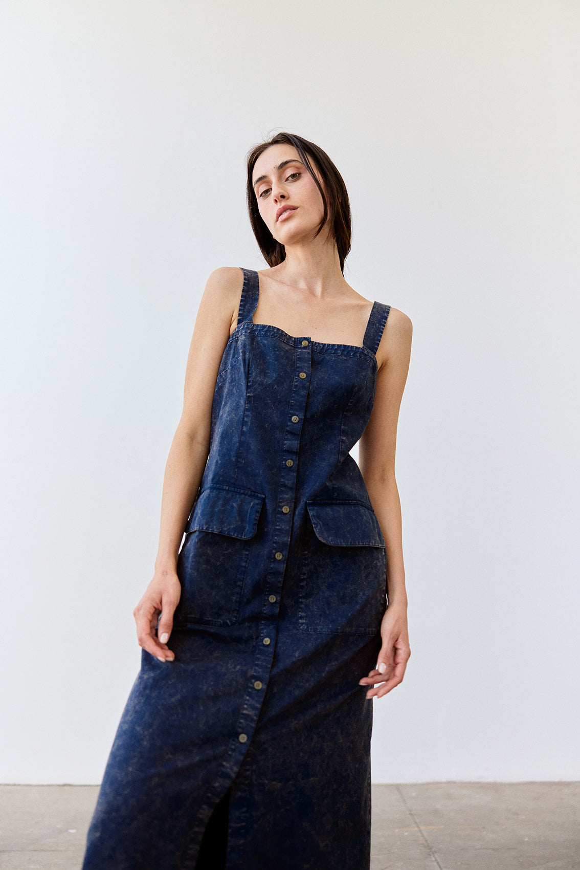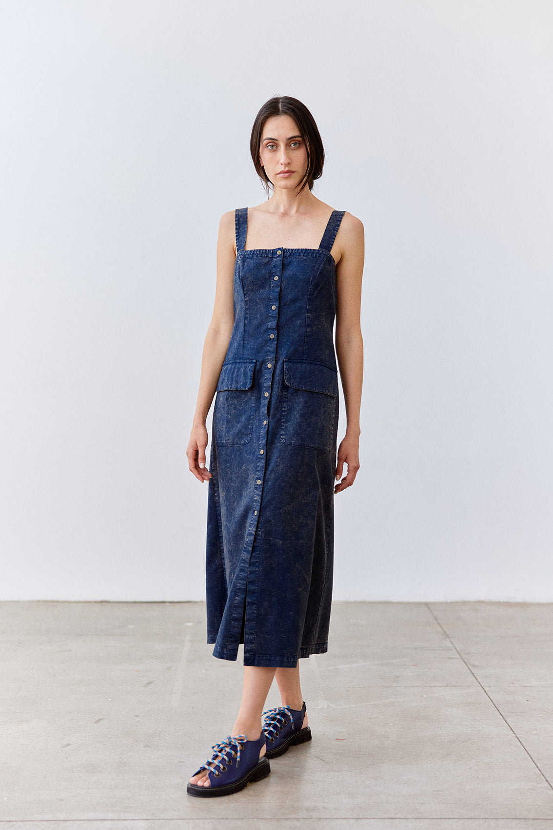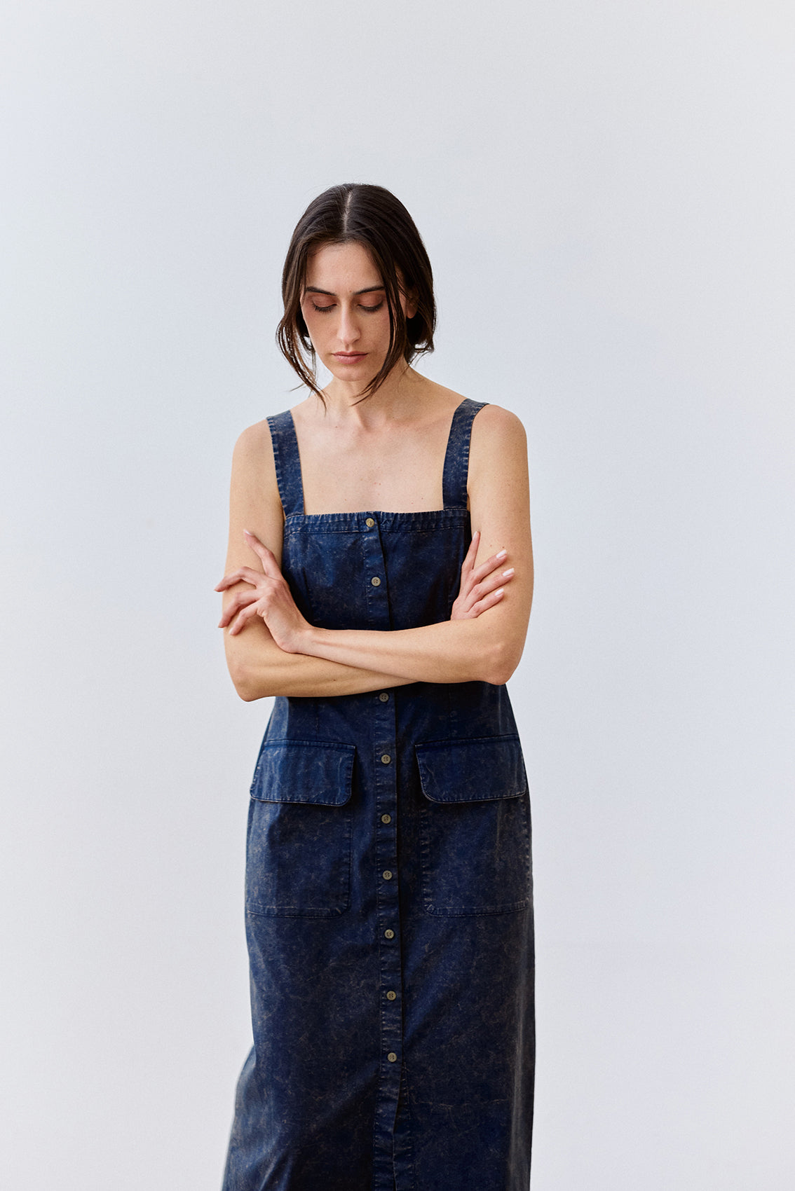 Long sleeveless dress with a buttoned front and squared neckline. Crafted in docile Peruvian cotton. It features two straps, a flattering and comfortable waist, and a slightly A-line cut at the bottom. With functional pockets. A highly wearable summer piece.
