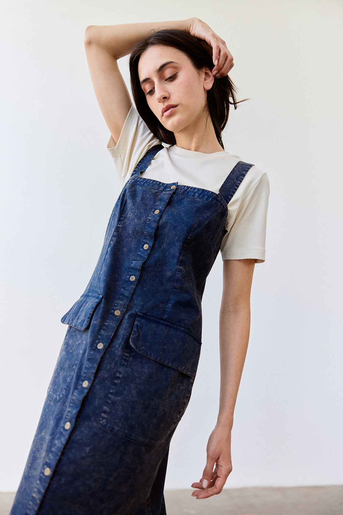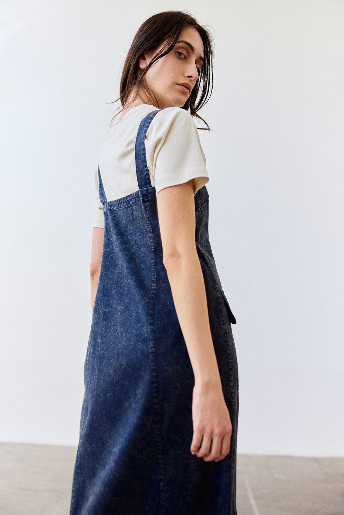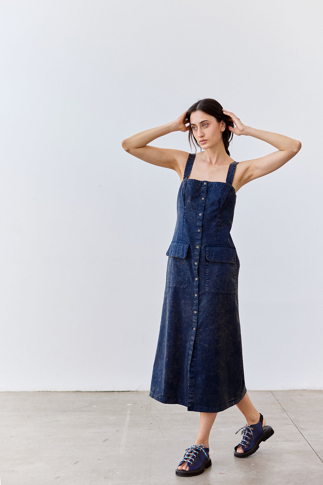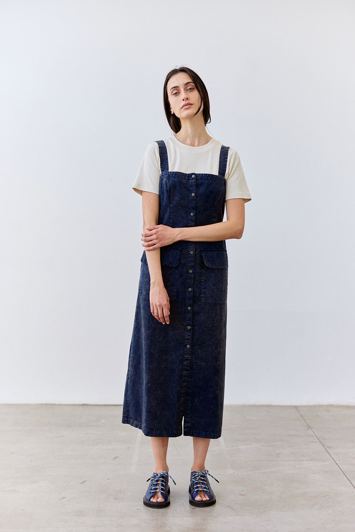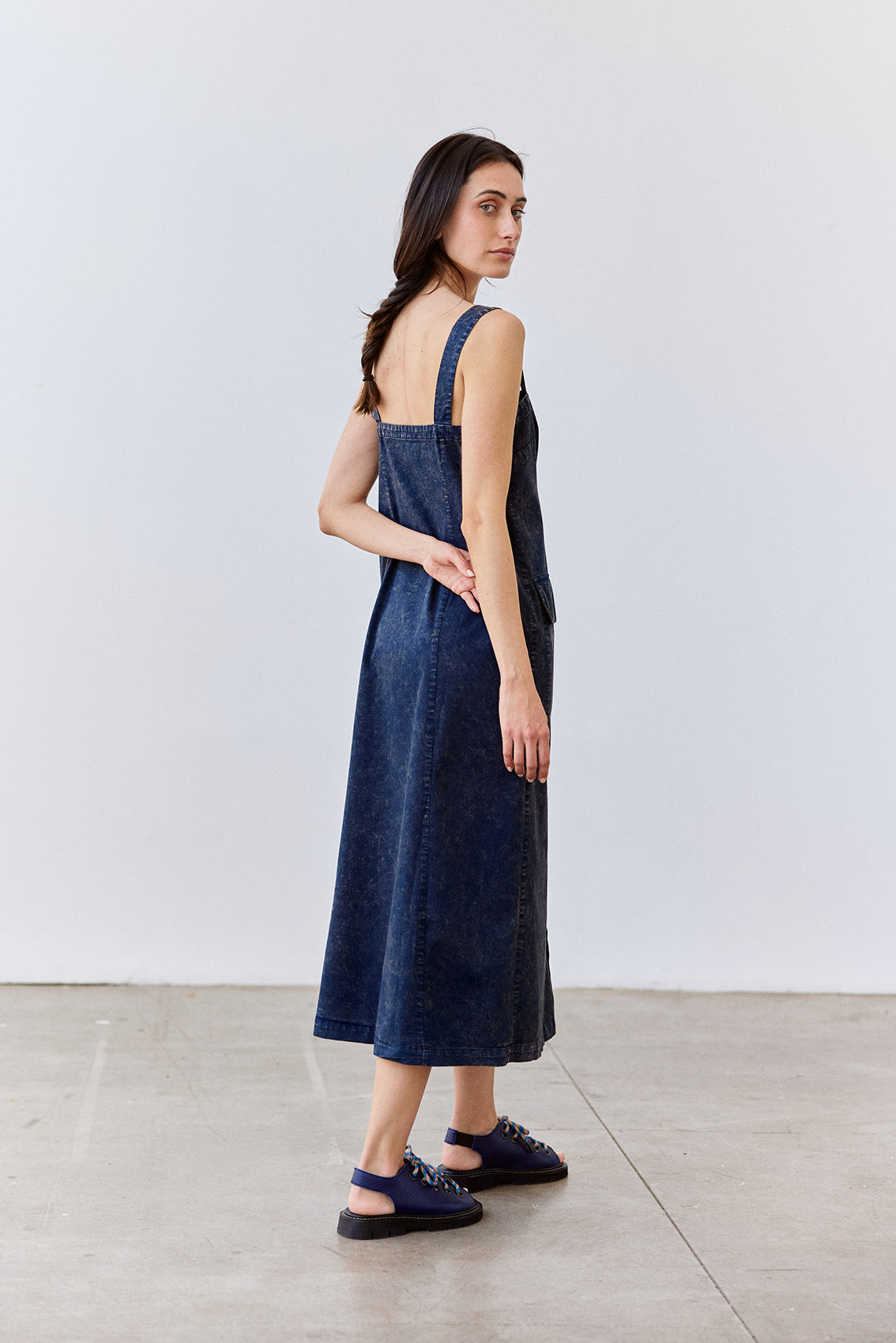 Long sleeveless dress with a buttoned front and squared neckline. Crafted in docile Peruvian cotton. It features two straps, a flattering and comfortable waist, and a slightly A-line cut at the bottom. With functional pockets. A highly wearable summer piece.