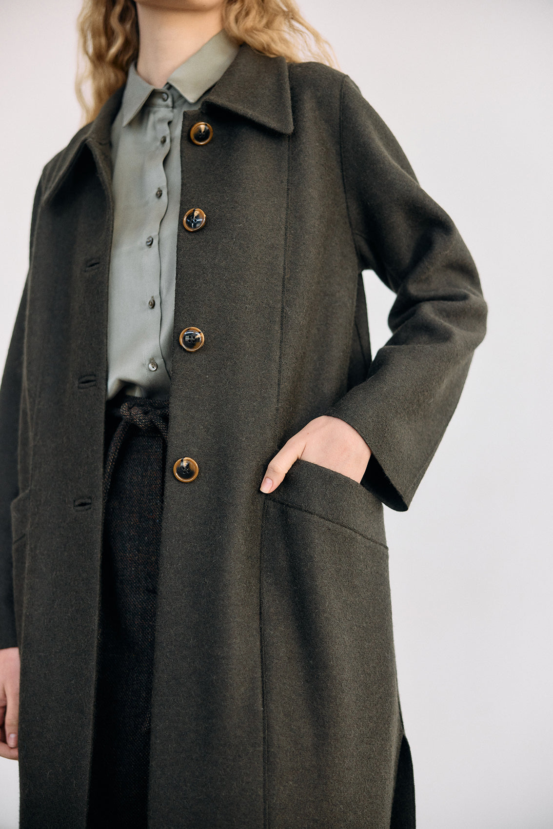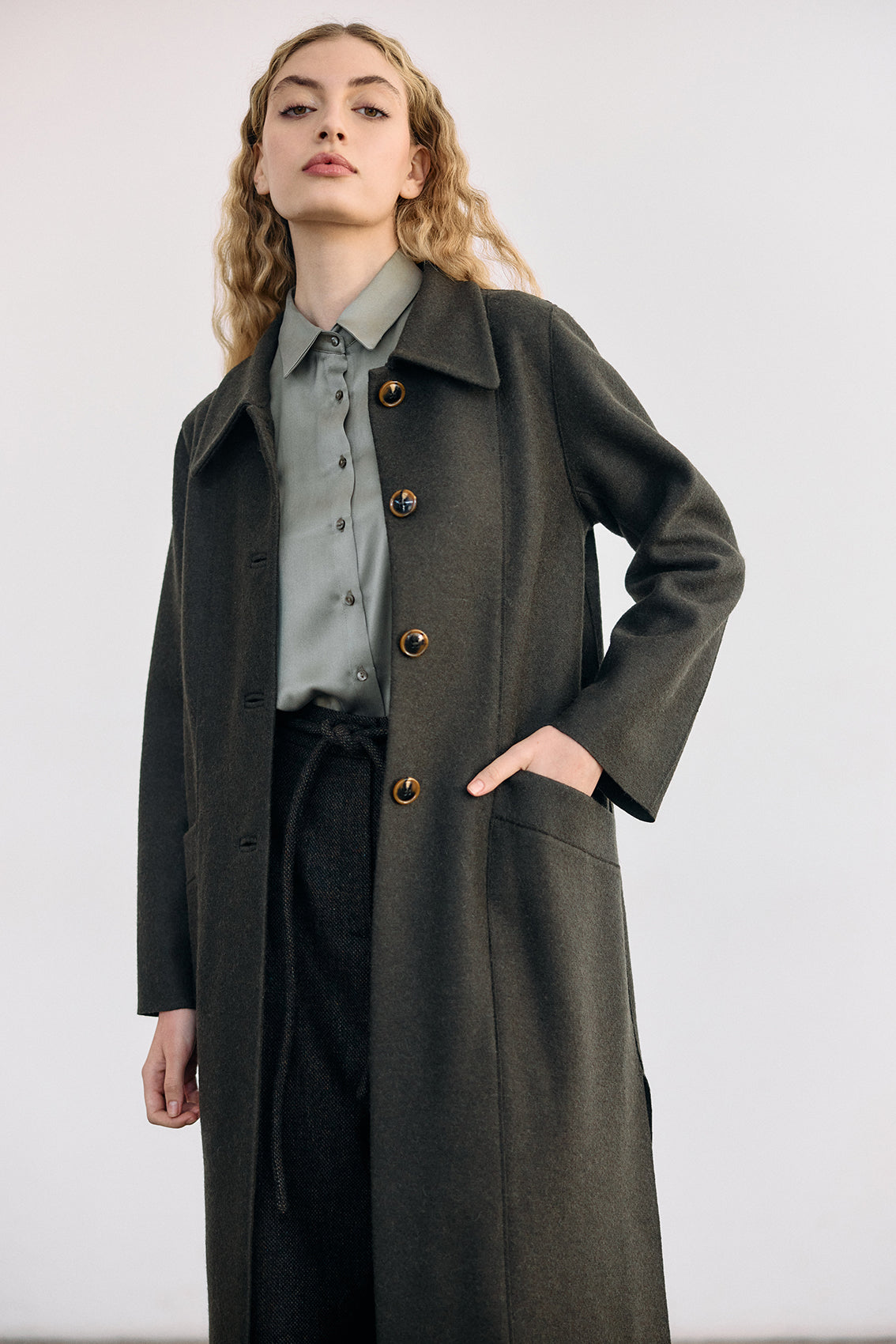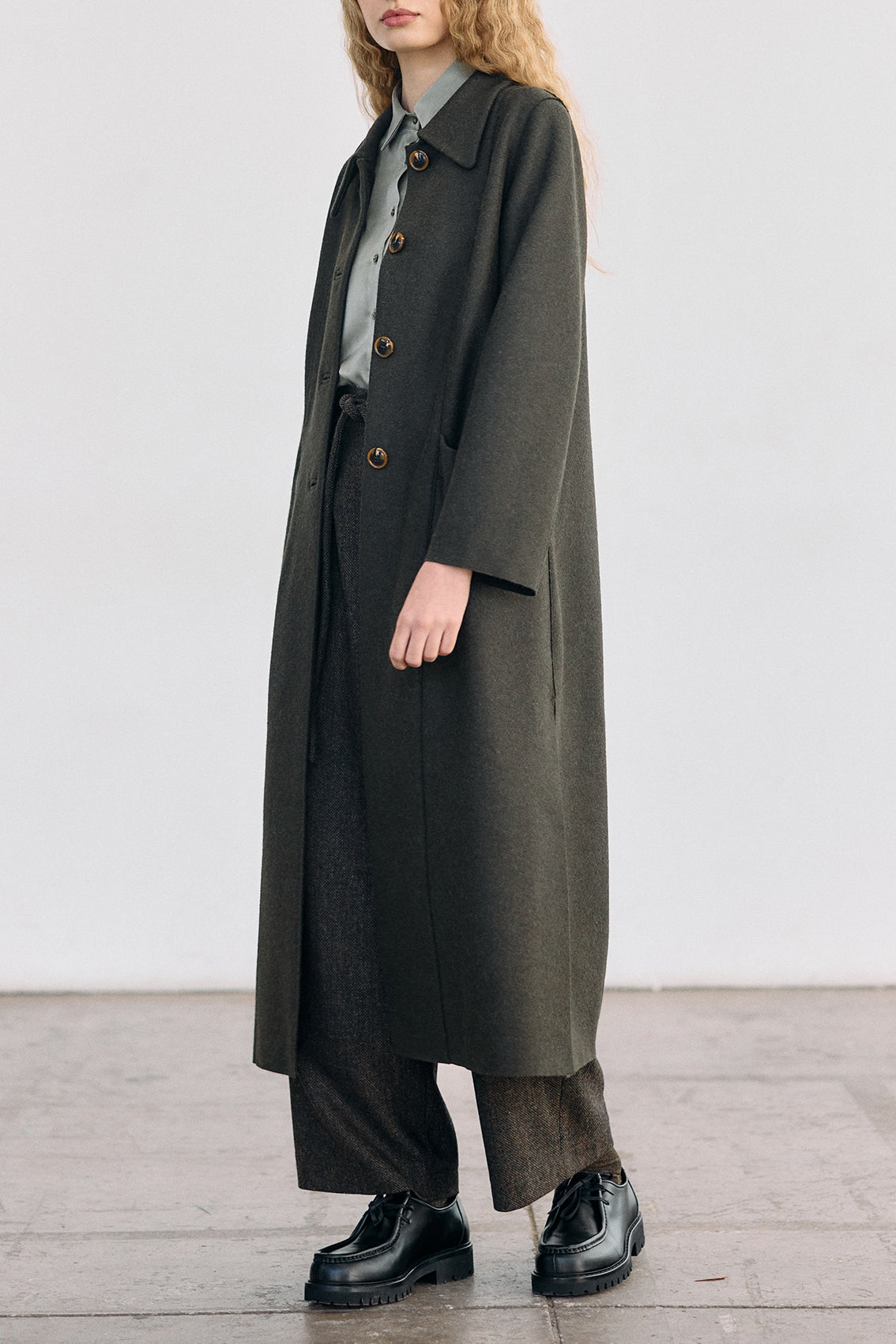 Long coat, crafted in a luxurious alpaca and wool blend. It has been treated with a special felting process (professionally boiled in hot water and dried on high heat). The result is a substantial double-faced yet lightweight and warm natural material.