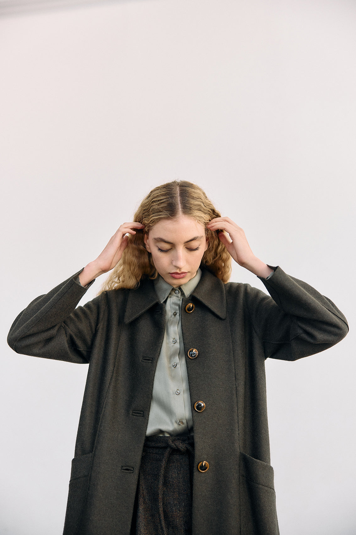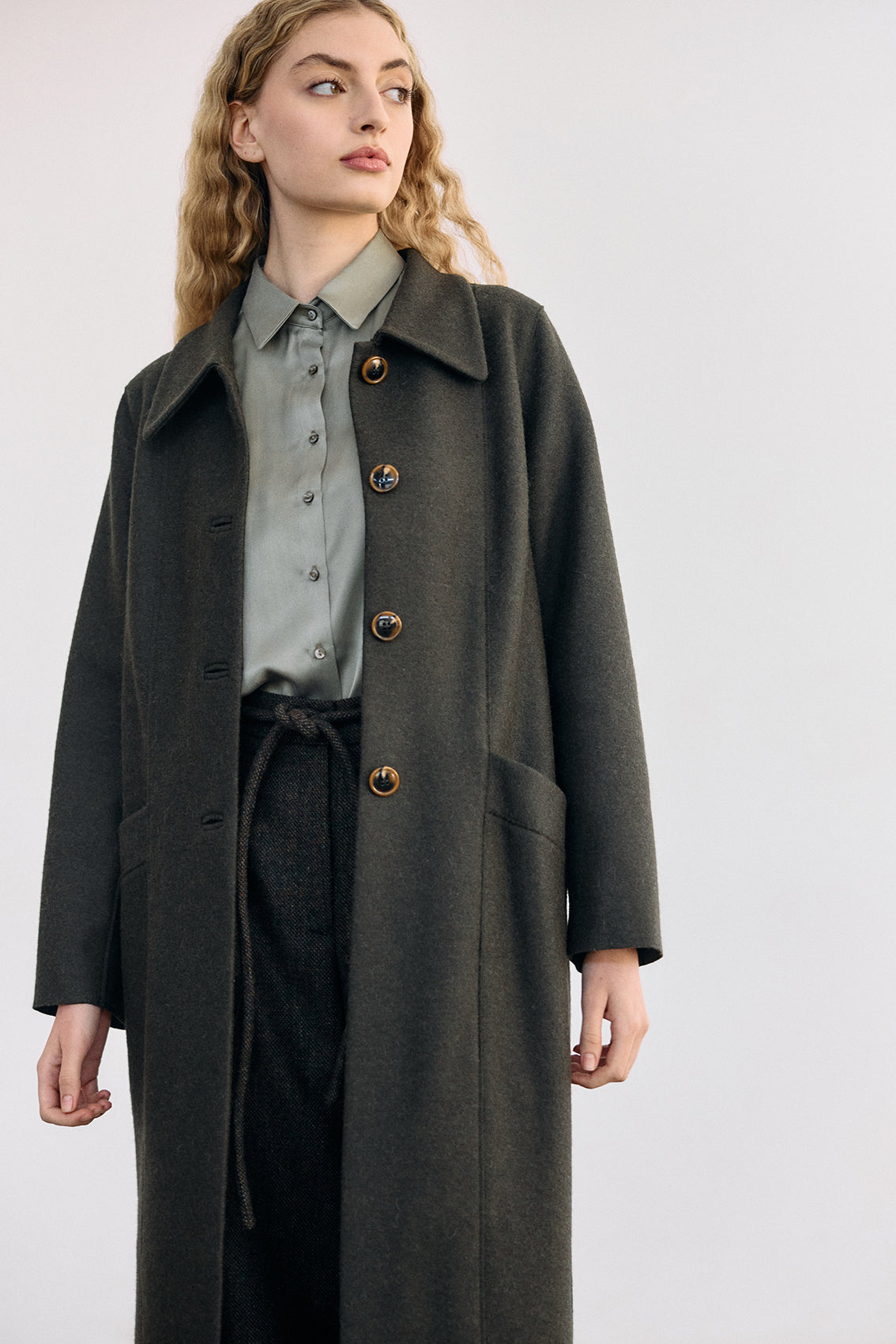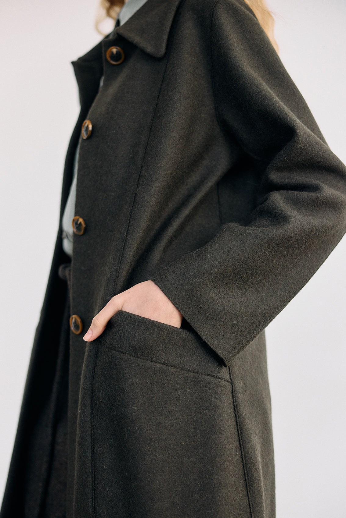 Long coat, crafted in a luxurious alpaca and wool blend. It has been treated with a special felting process (professionally boiled in hot water and dried on high heat). The result is a substantial double-faced yet lightweight and warm natural material.