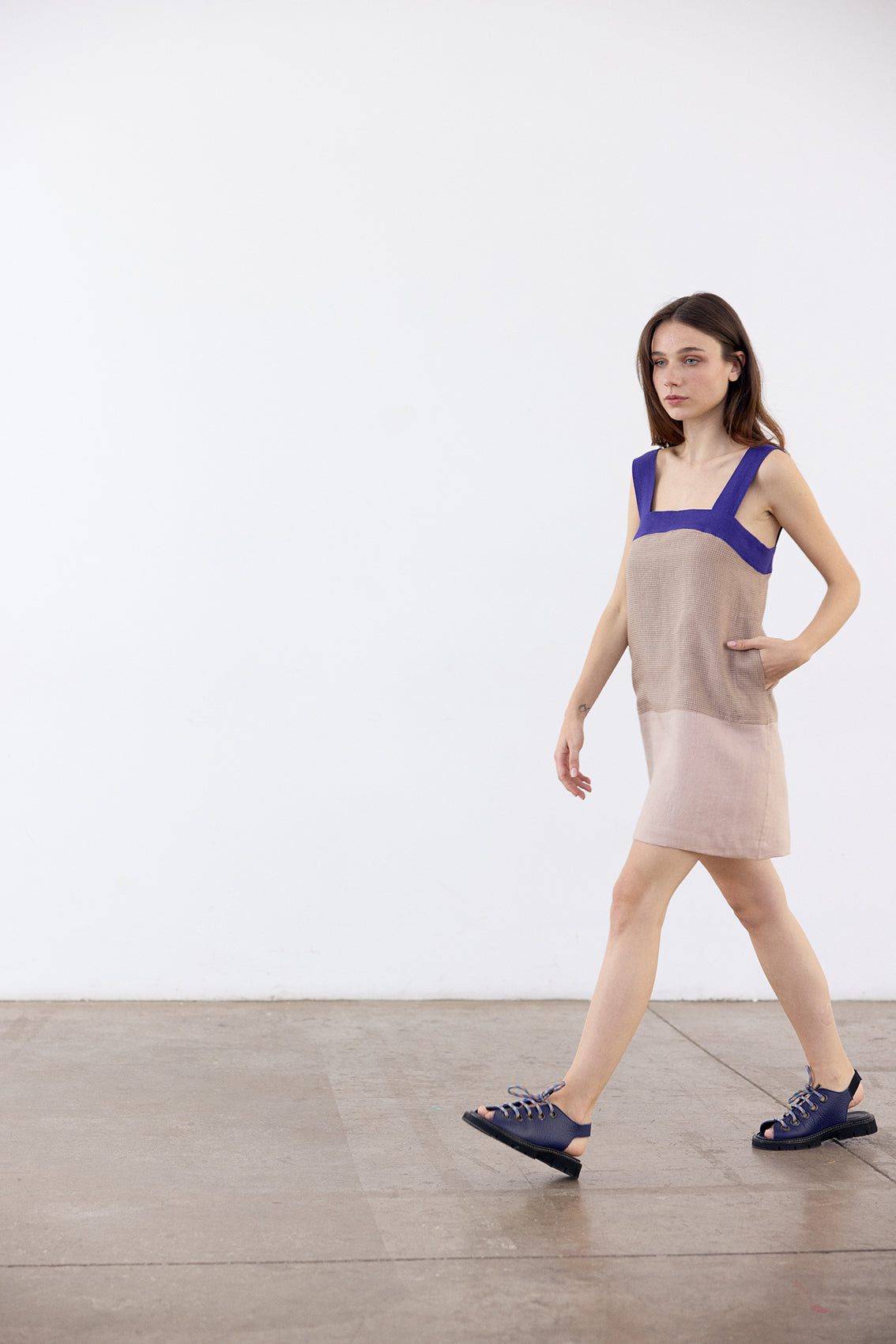 Relaxed short dress with three horizontal panels in original color combinations. Made in 100% stone-washed linen. A versatile and comfortable piece for warmer months.