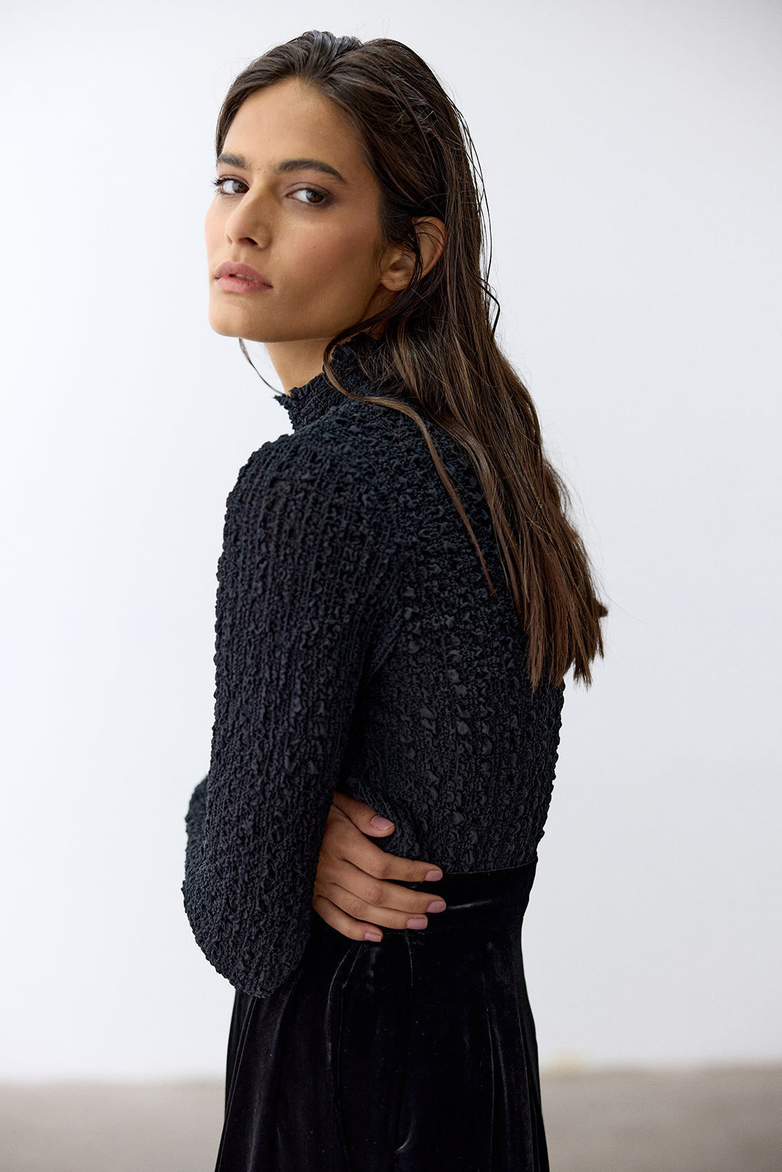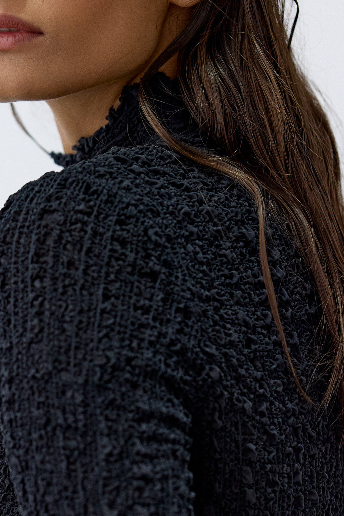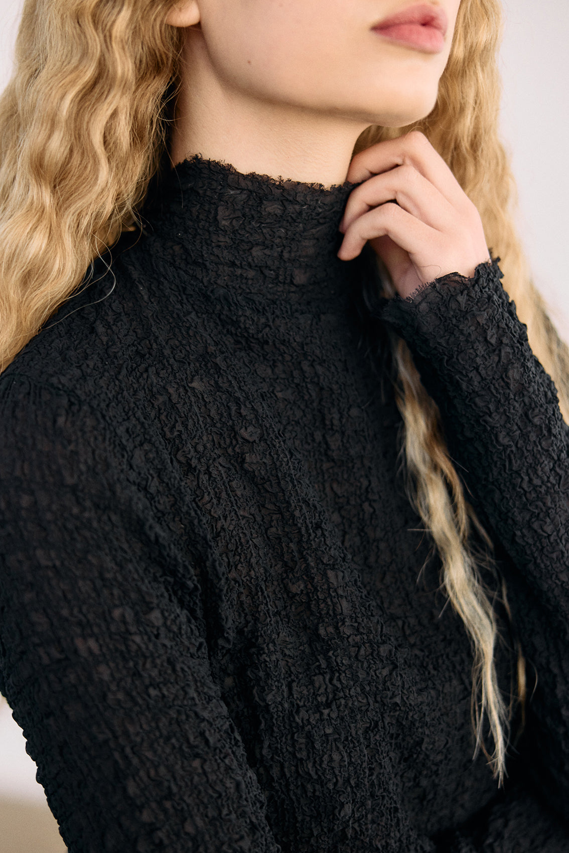Long-sleeve stretchy turtleneck top made in delicately elasticated silk, featuring an intricate gathered texture.