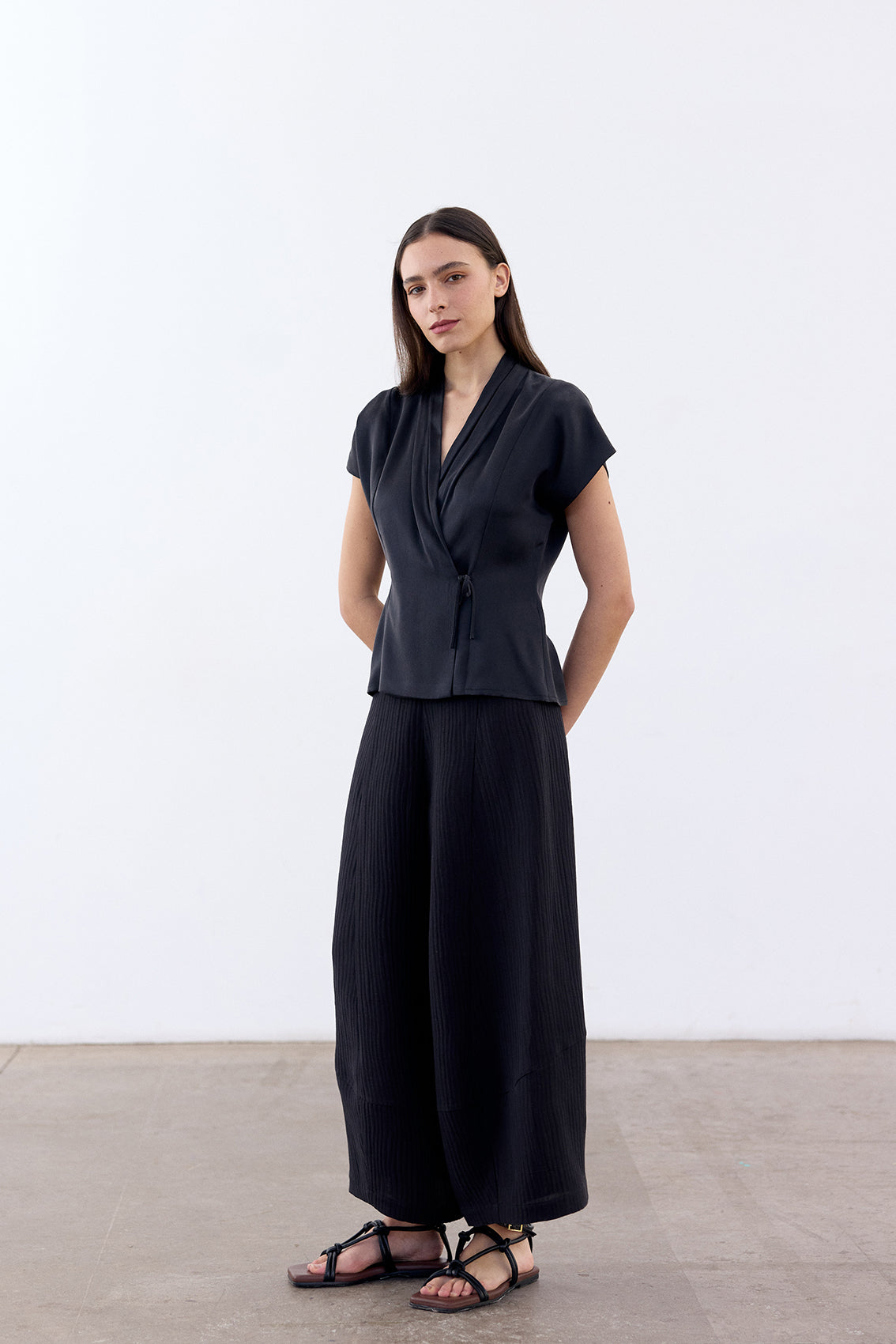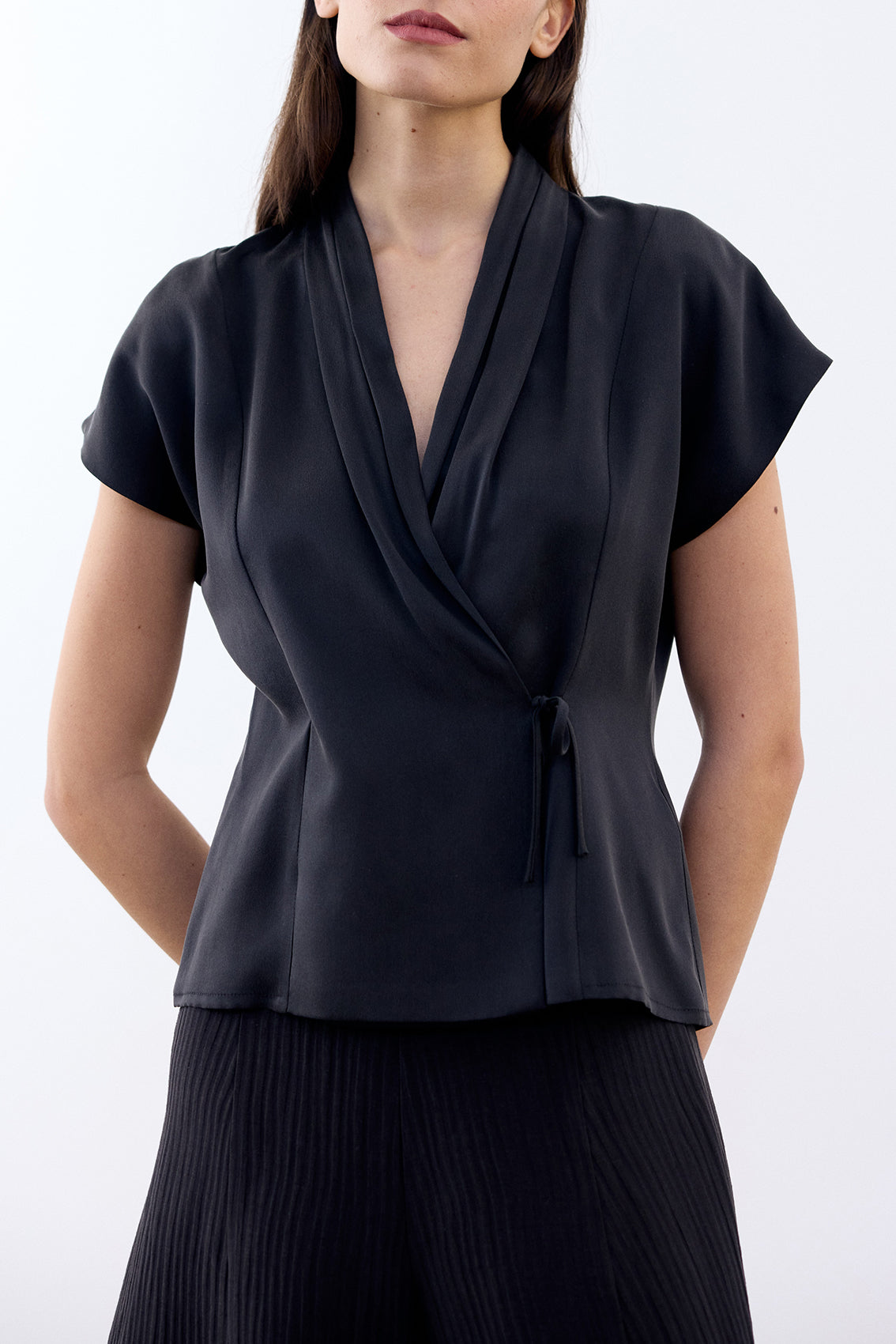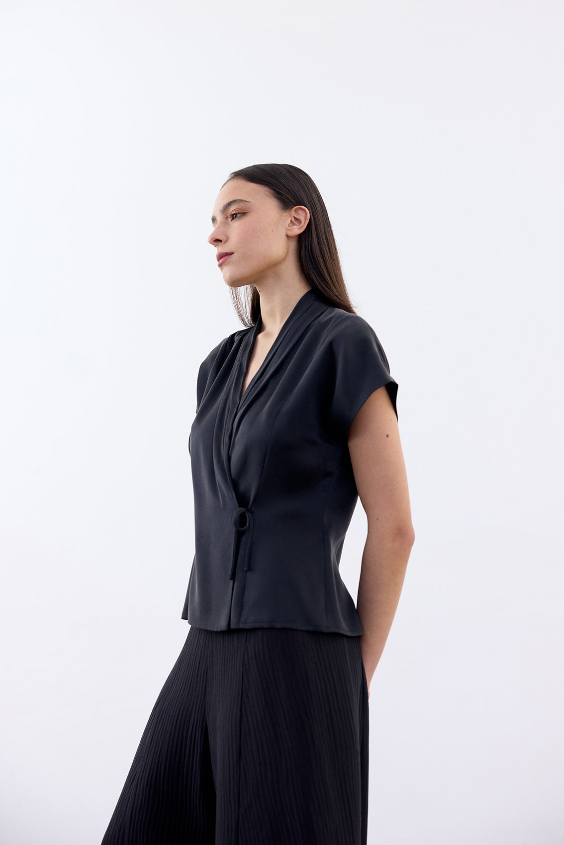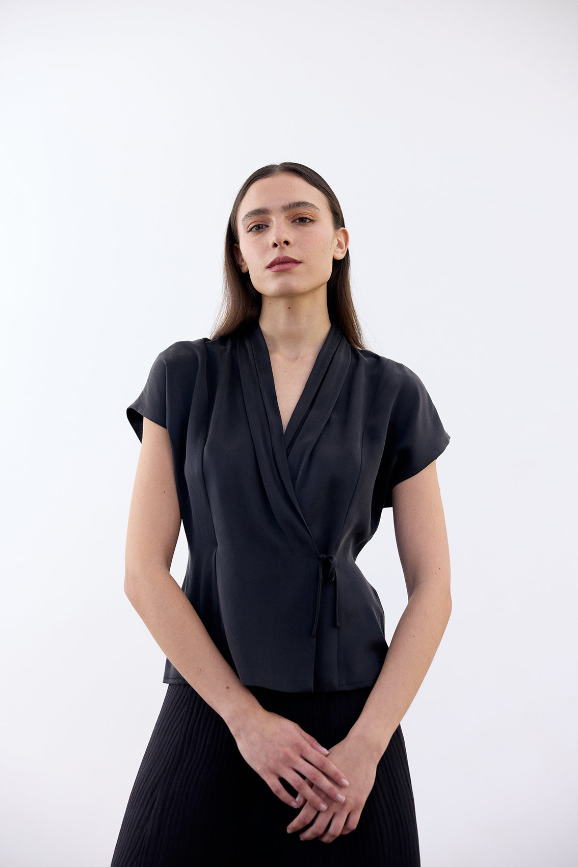 An elevated silk top with a cross-over tie detail, featuring a beautifully draped neckline. Crafted in 100% silk. A special piece for special occasions.