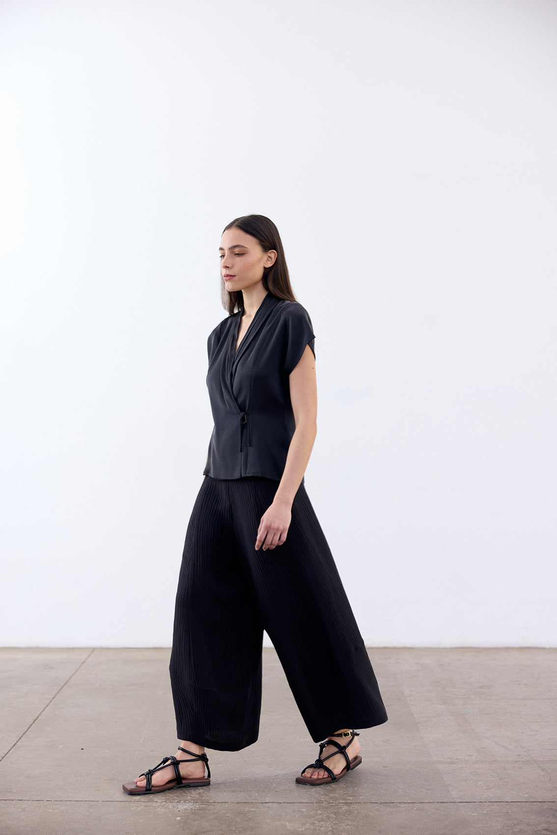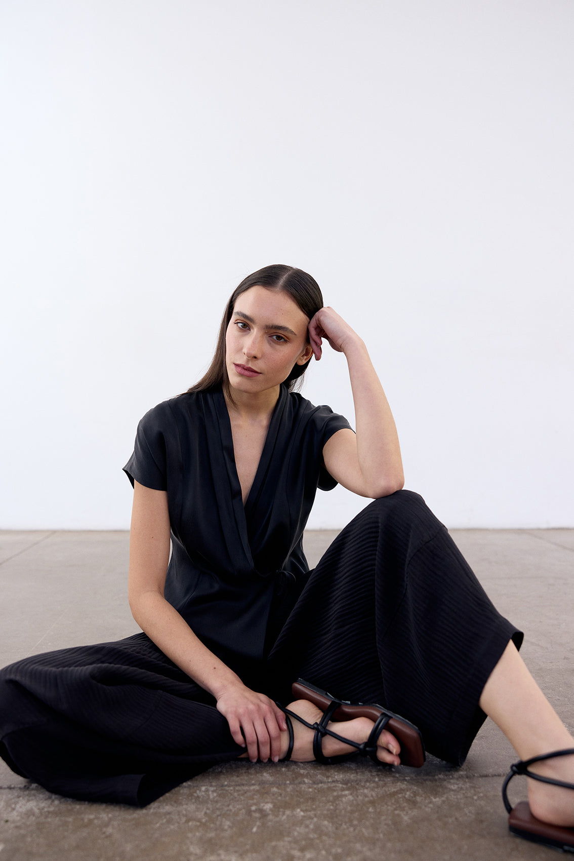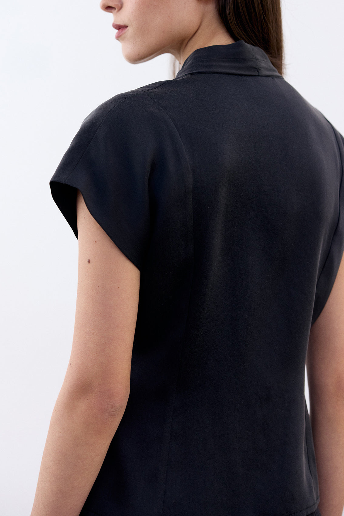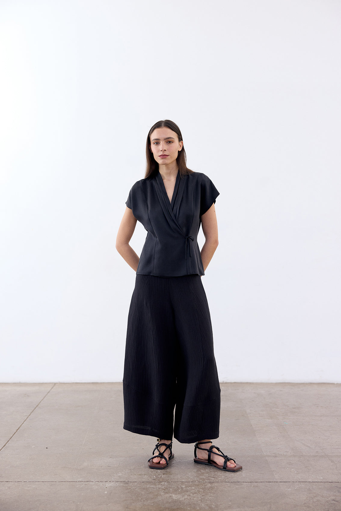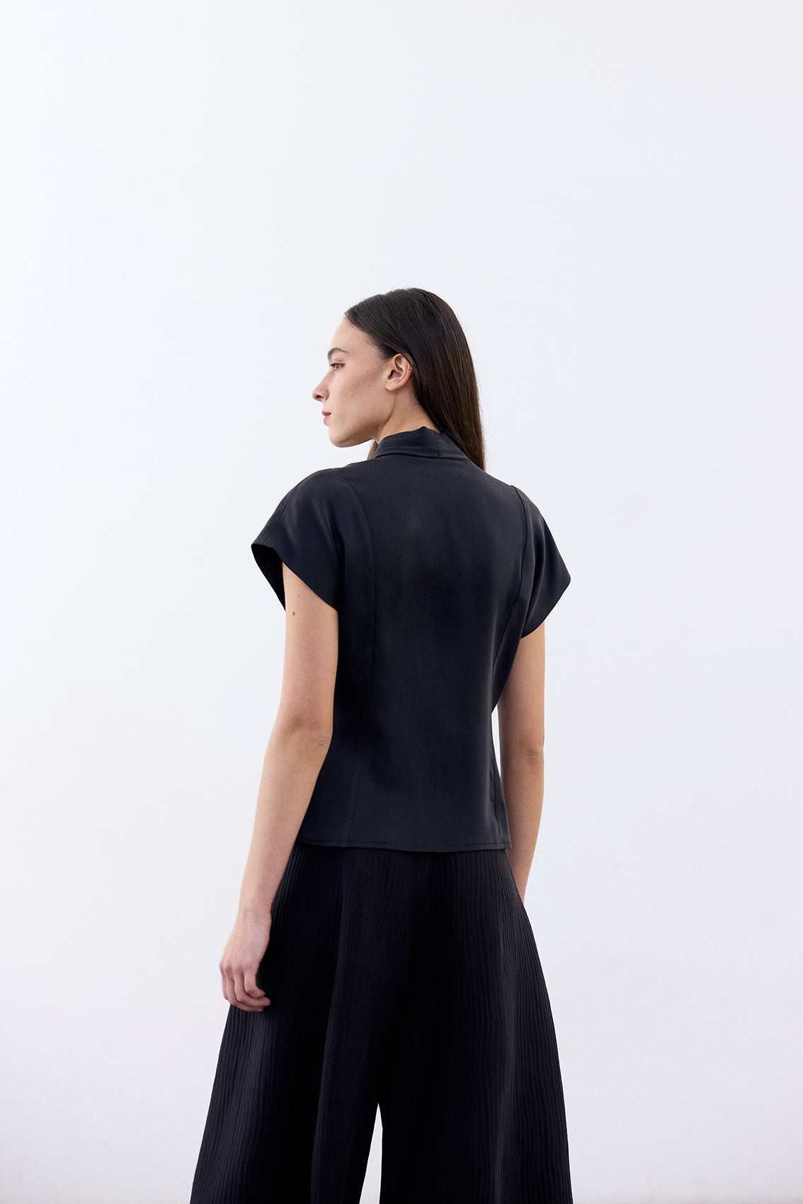 An elevated silk top with a cross-over tie detail, featuring a beautifully draped neckline. Crafted in 100% silk. A special piece for special occasions.