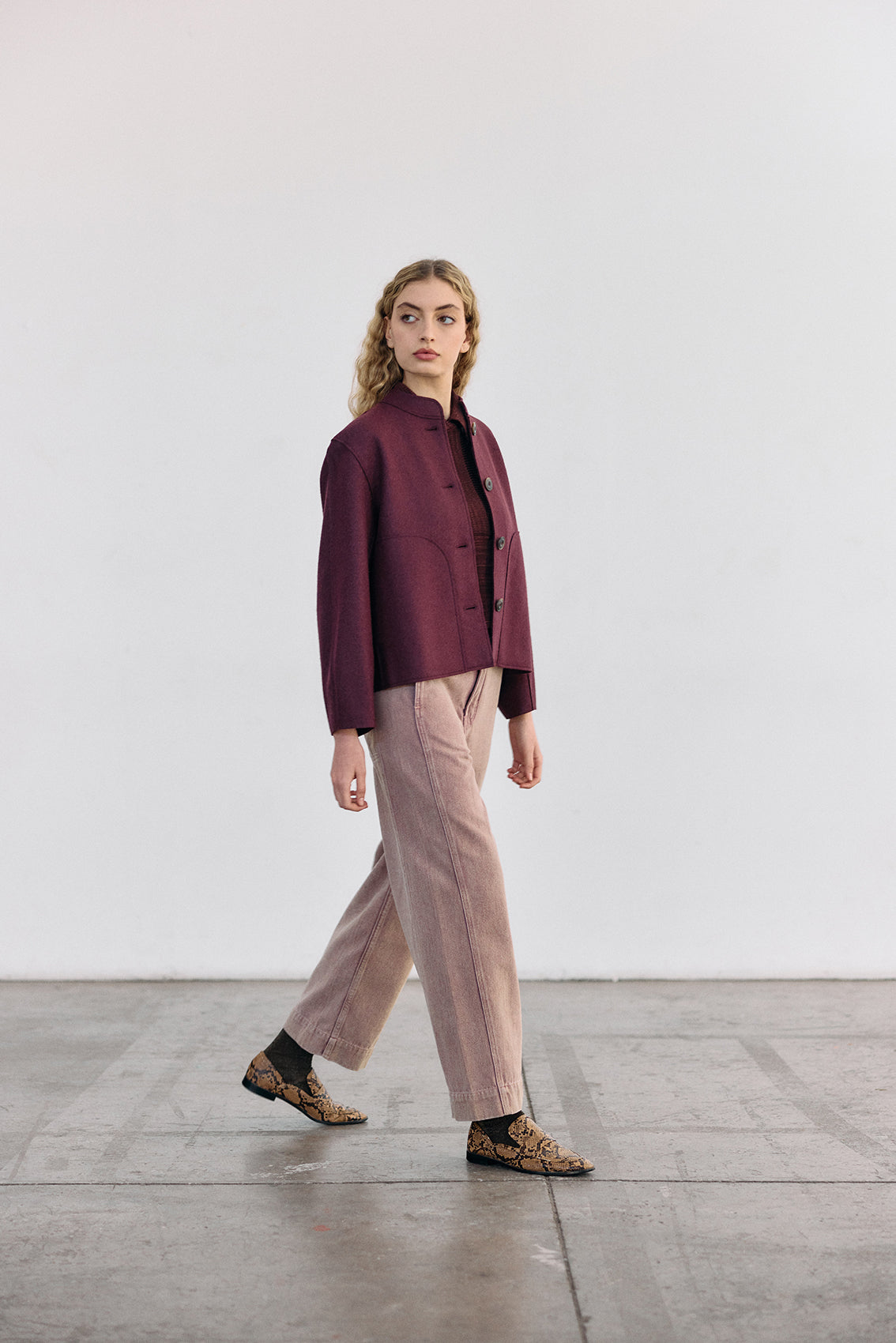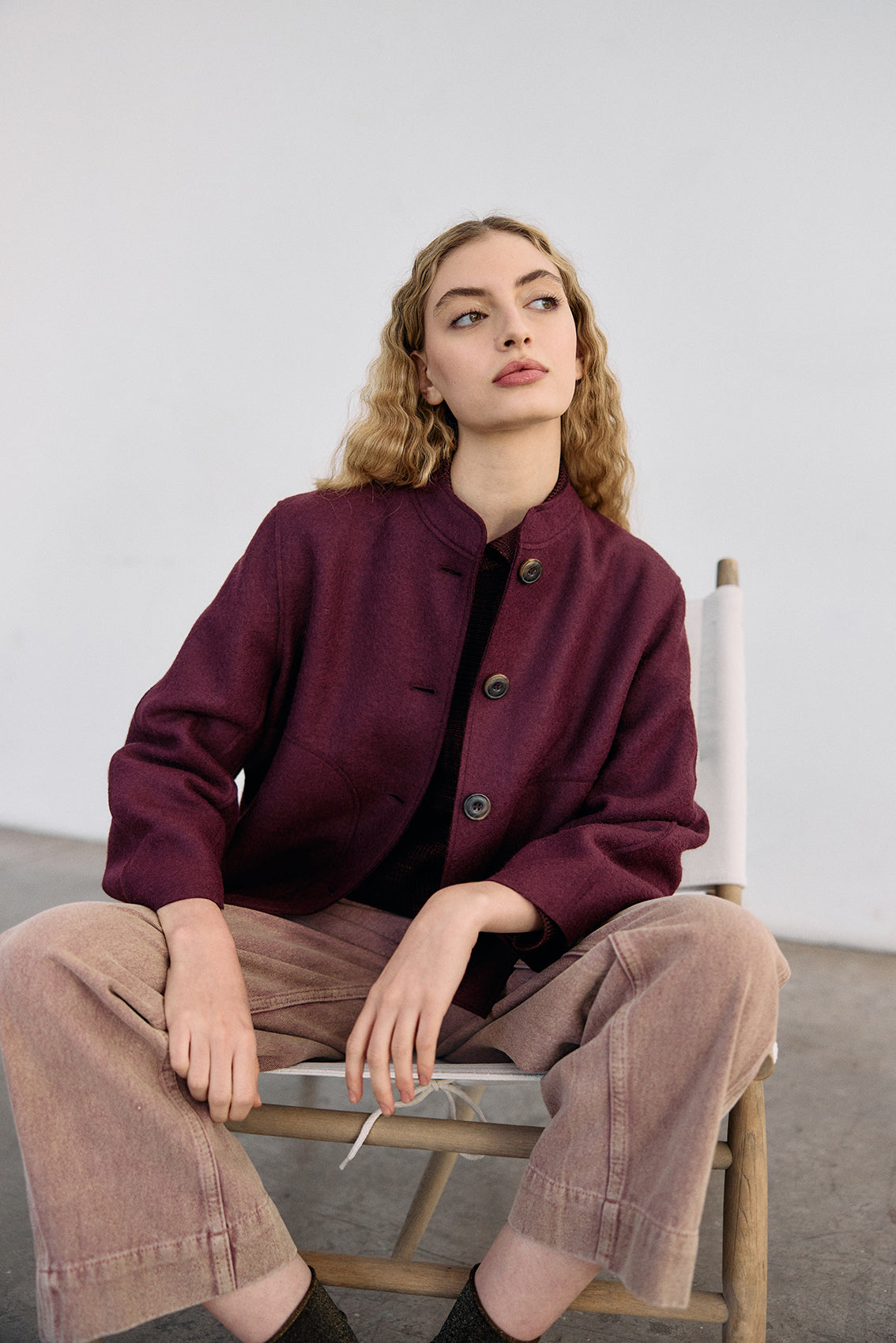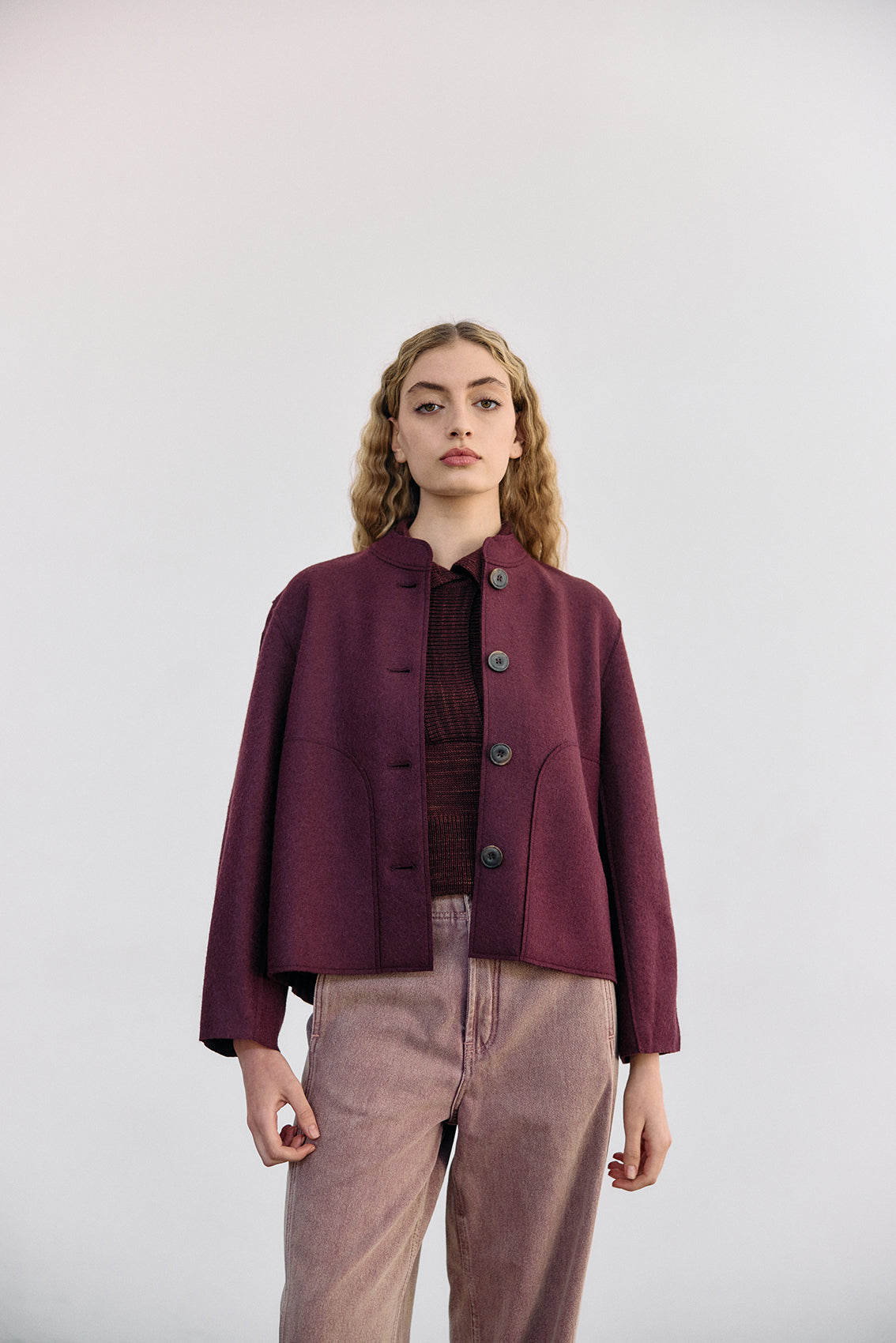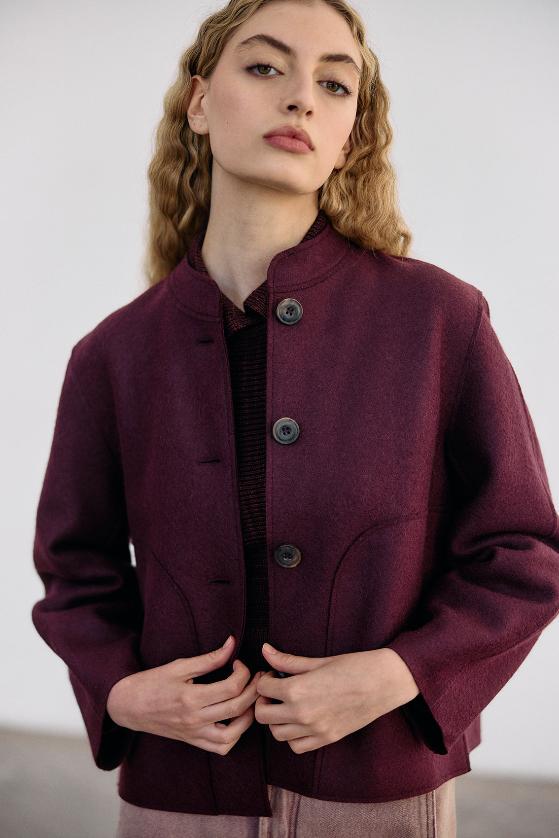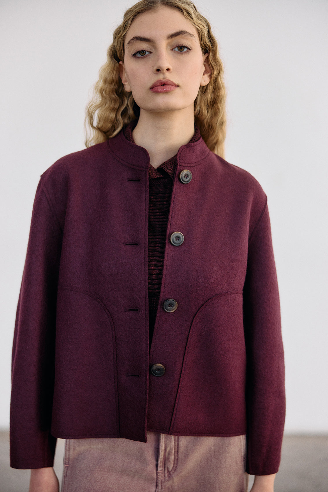 Buttoned short jacket, crafted in a high-quality alpaca and wool blend. It has been treated with a special felting process (professionally boiled in hot water and dried on high heat). The result is a thick yet lightweight and warm natural material.