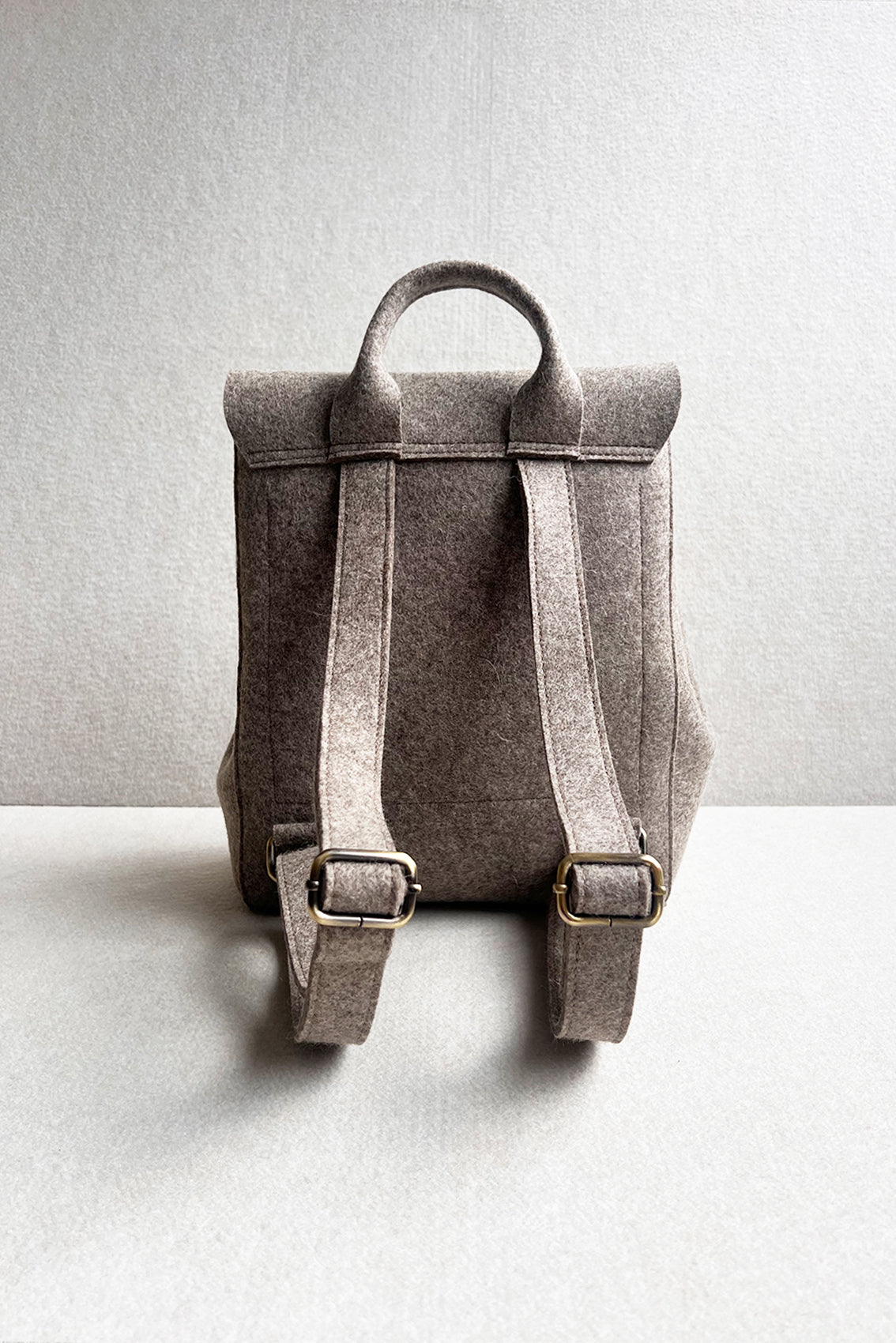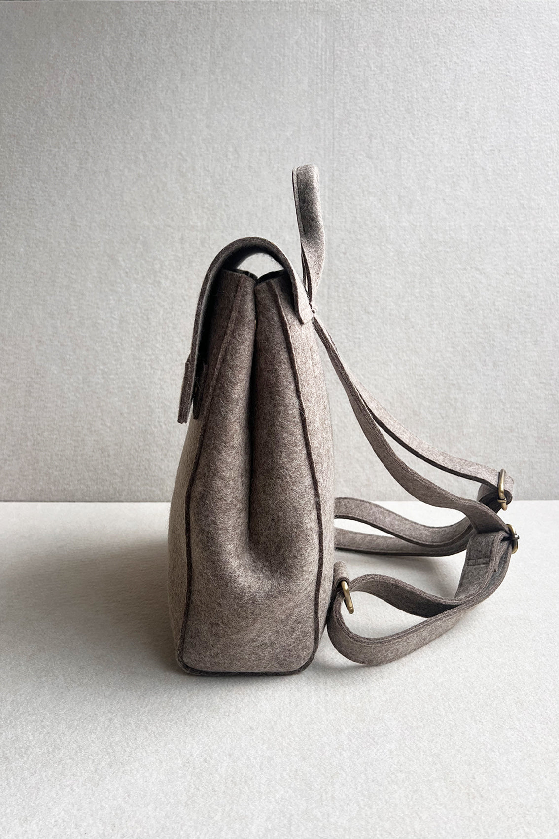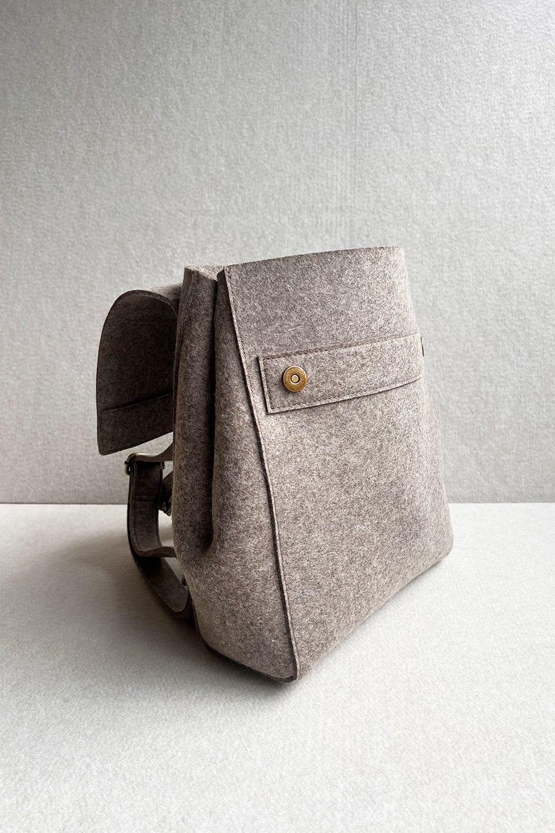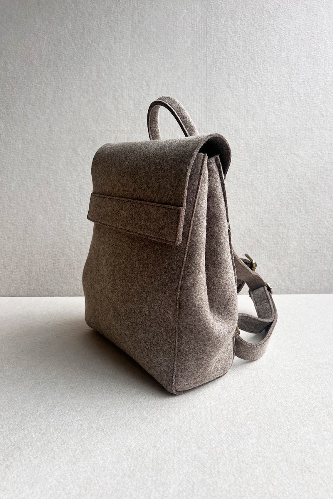 A limited-edition backpack, entirely crafted in a felted material composed of a luxurious alpaca and wool blend. It features bronze metal details, magnet closure, adjustable straps, and a functional upper handle.