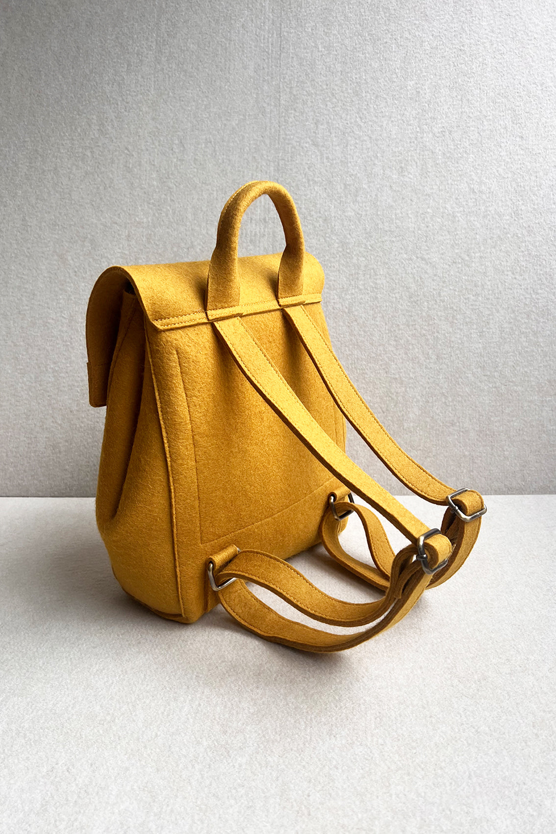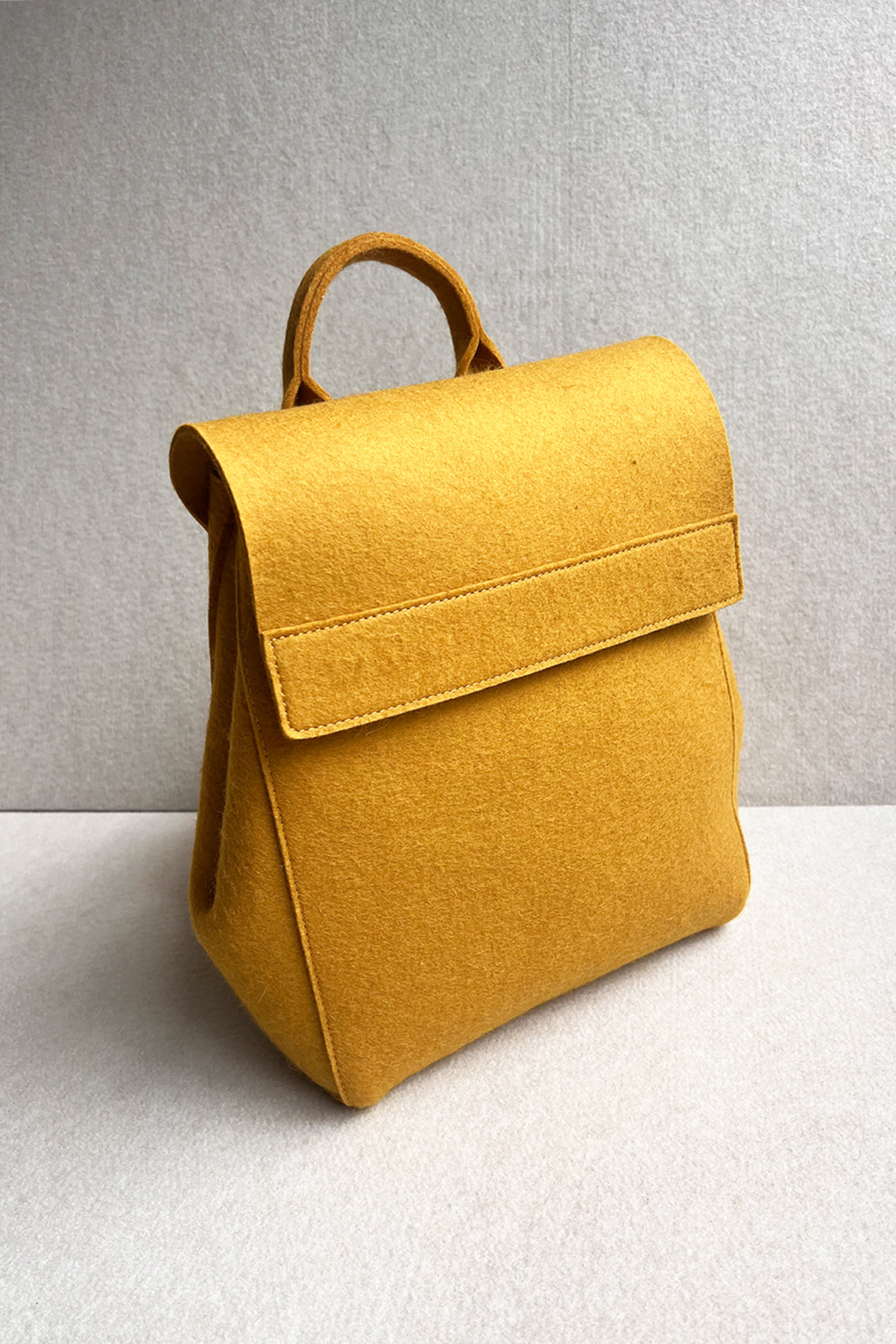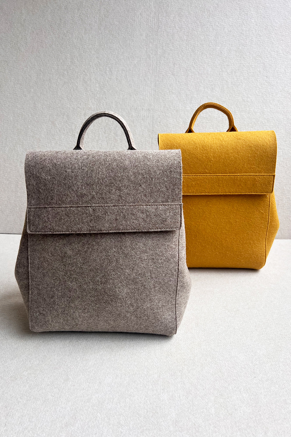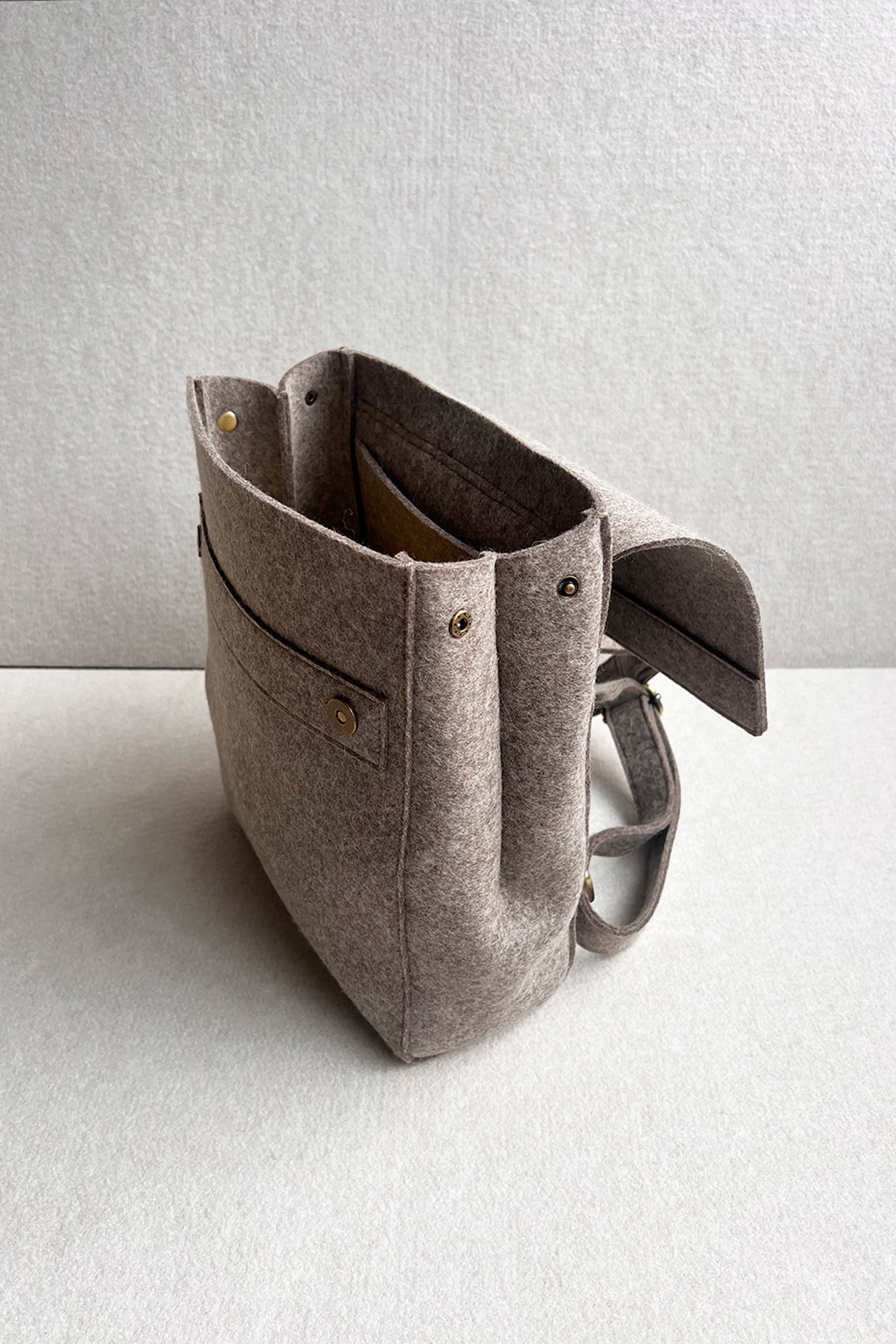 A limited-edition backpack, entirely crafted in a felted material composed of a luxurious alpaca and wool blend. It features bronze metal details, magnet closure, adjustable straps, and a functional upper handle.