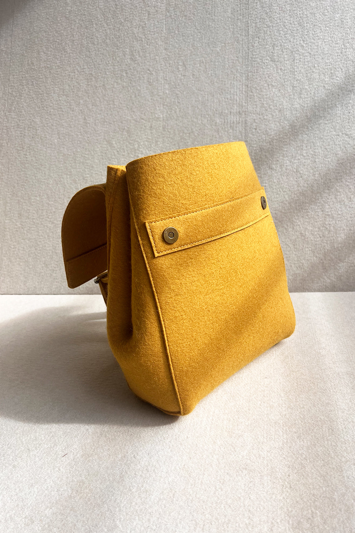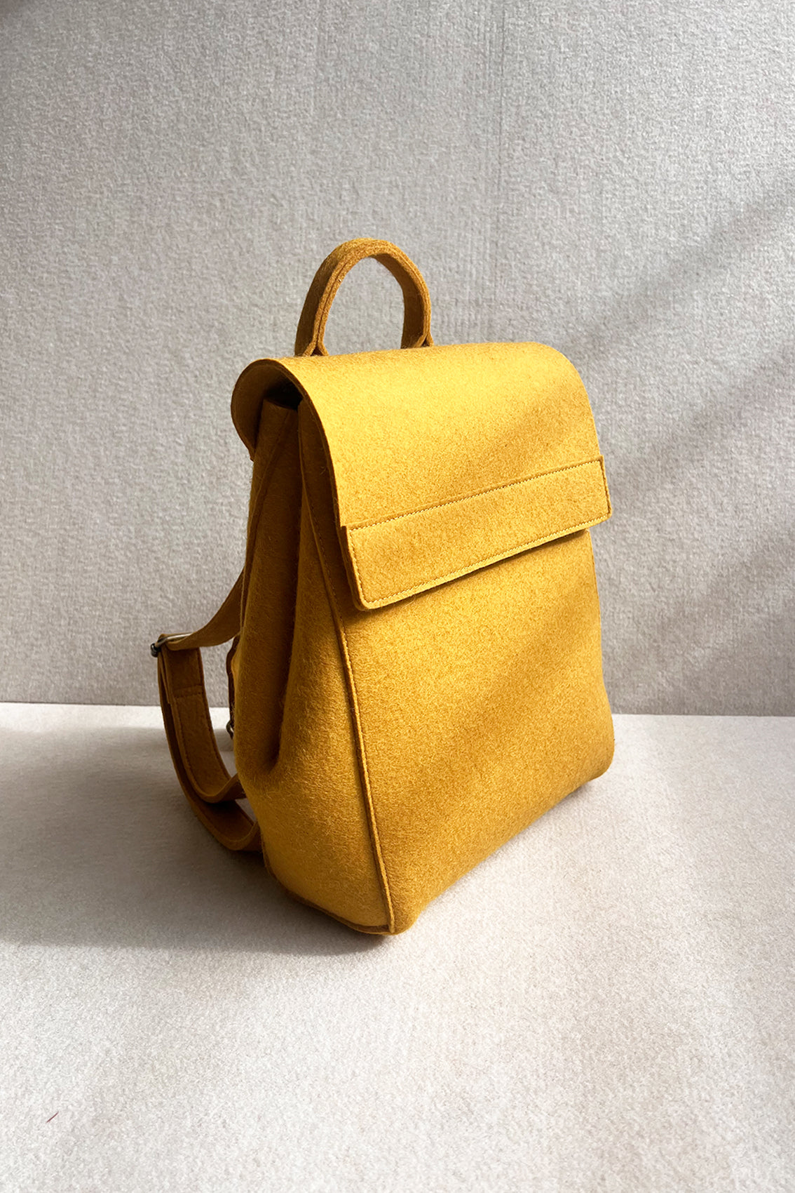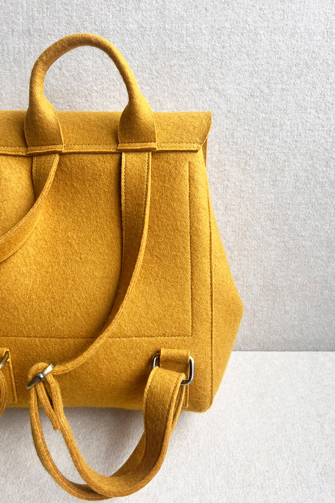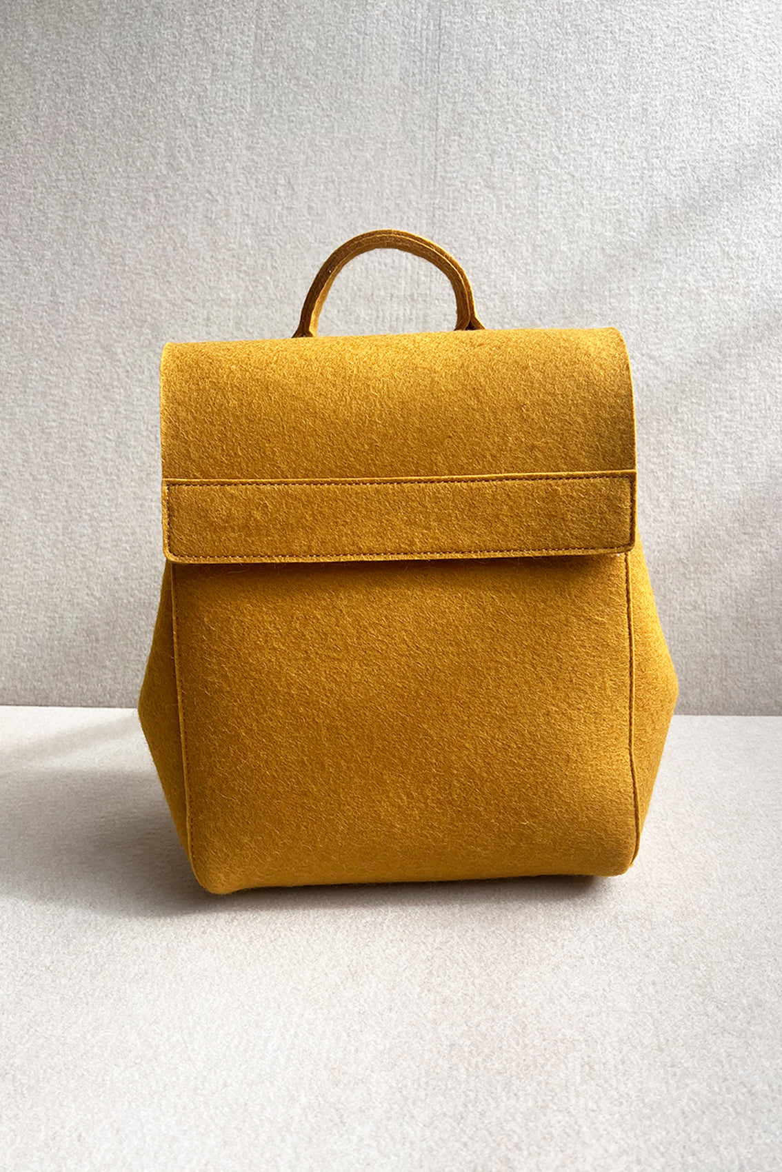 A limited-edition backpack, entirely crafted in a felted material composed of a luxurious alpaca and wool blend. It features bronze metal details, magnet closure, adjustable straps, and a functional upper handle.