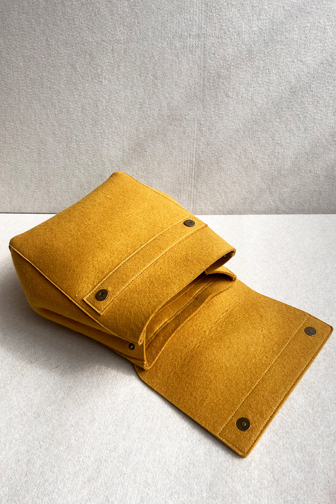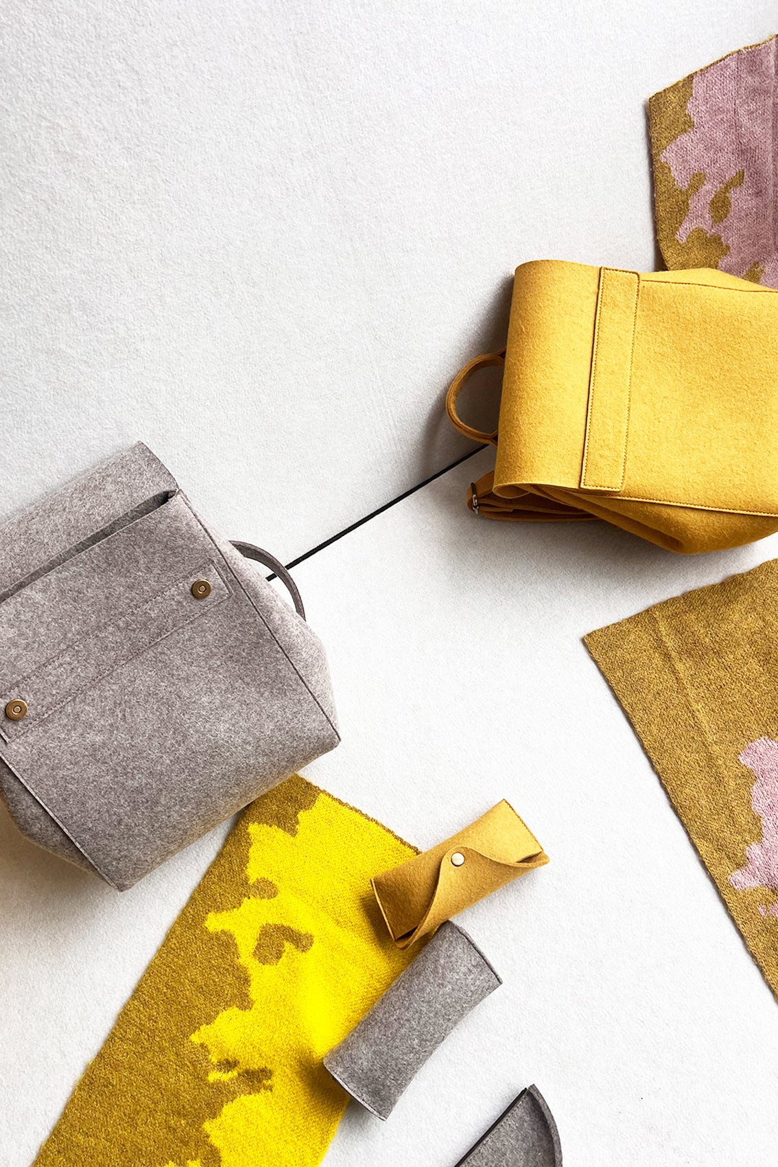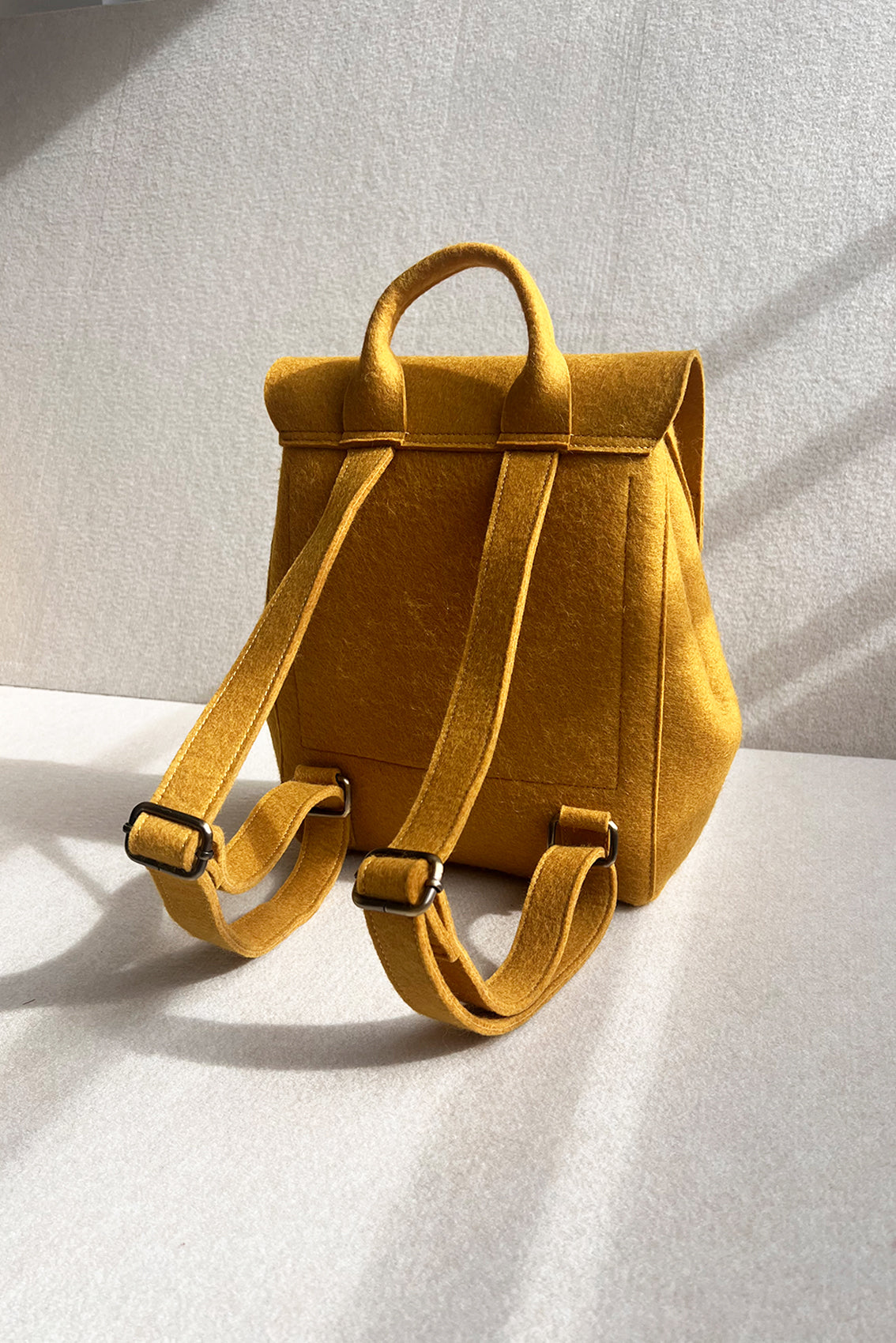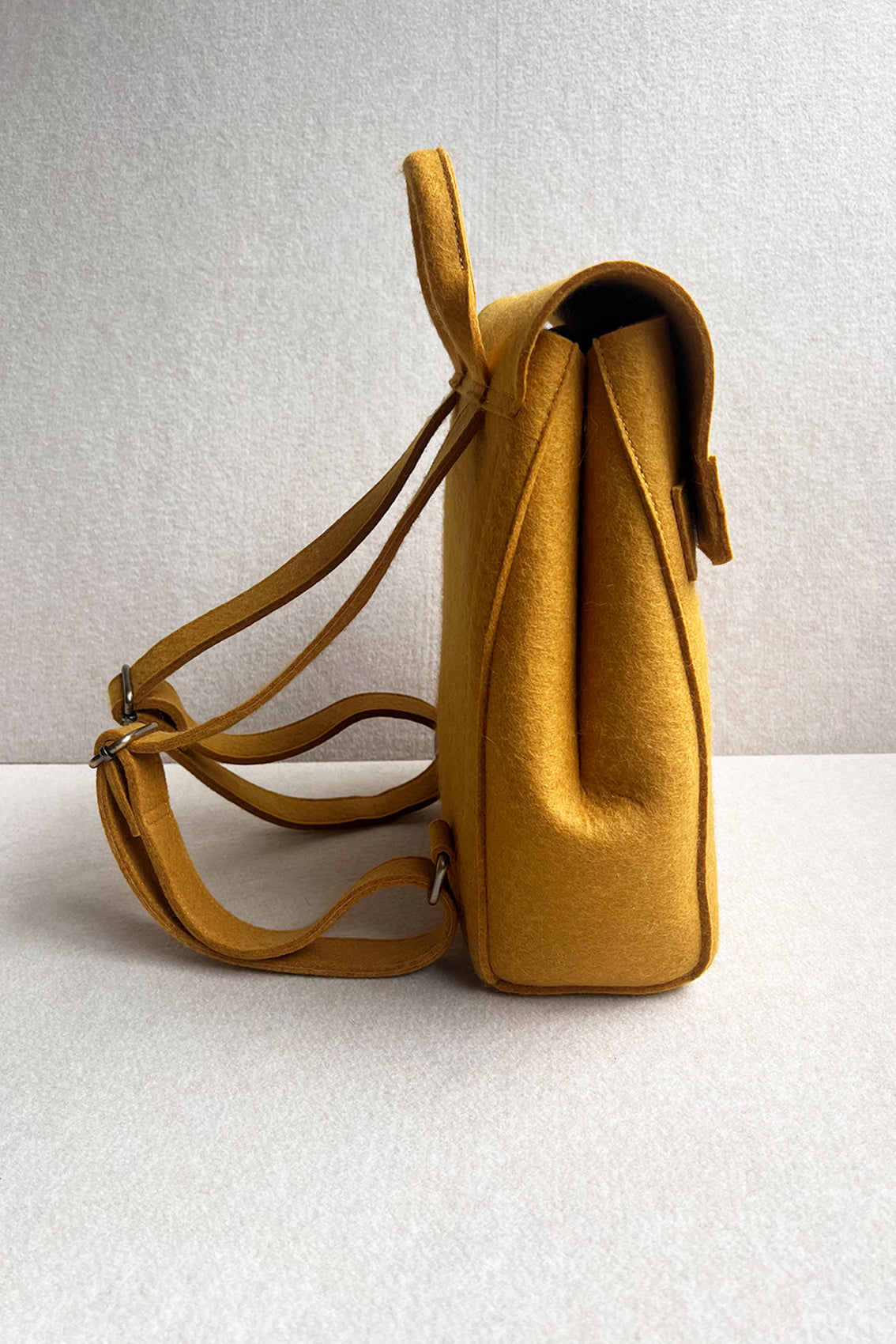 A limited-edition backpack, entirely crafted in a felted material composed of a luxurious alpaca and wool blend. It features bronze metal details, magnet closure, adjustable straps, and a functional upper handle.