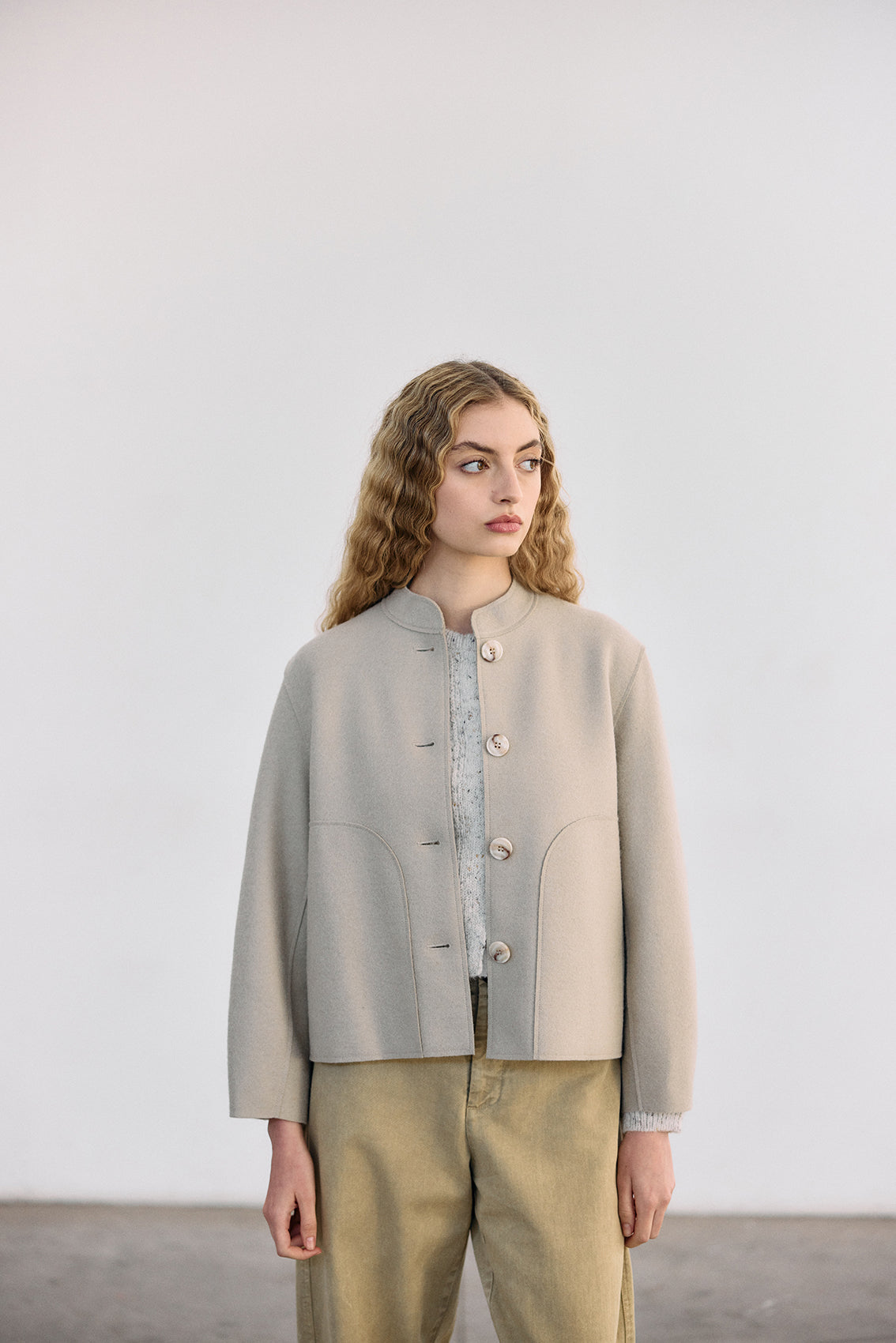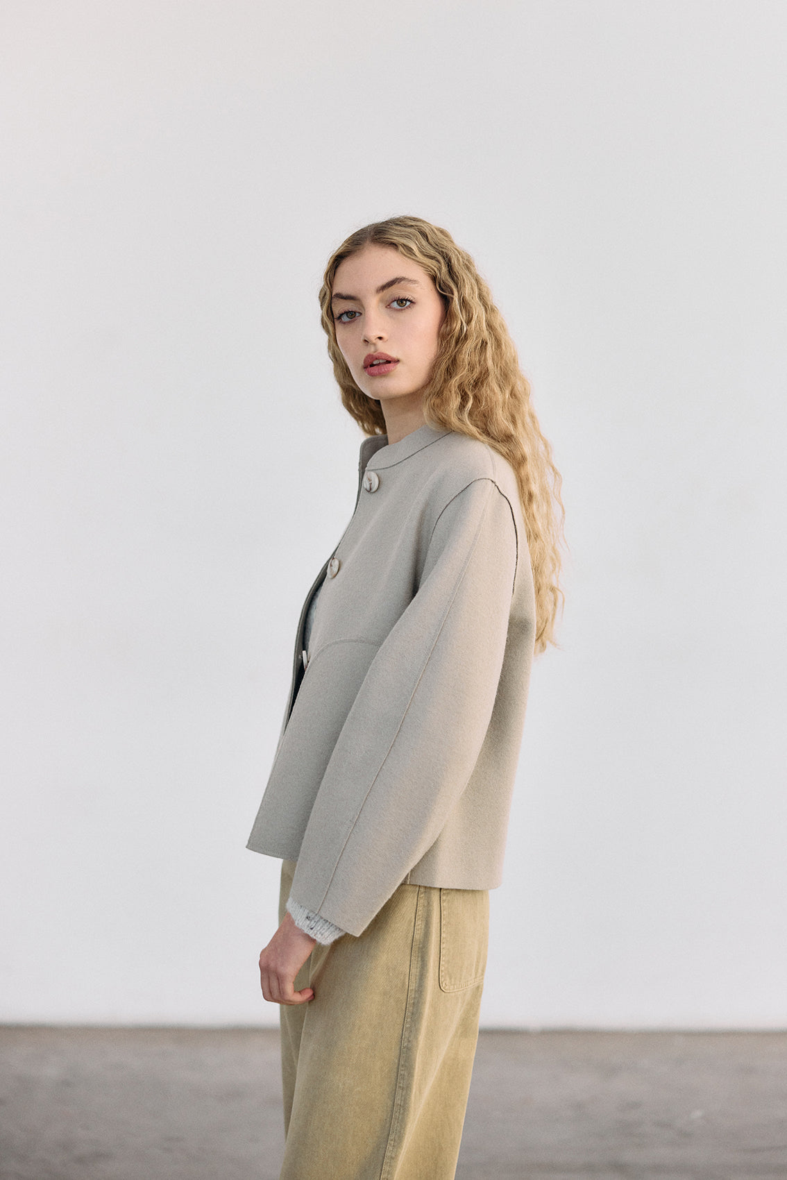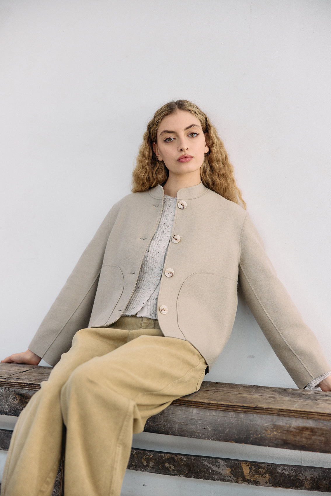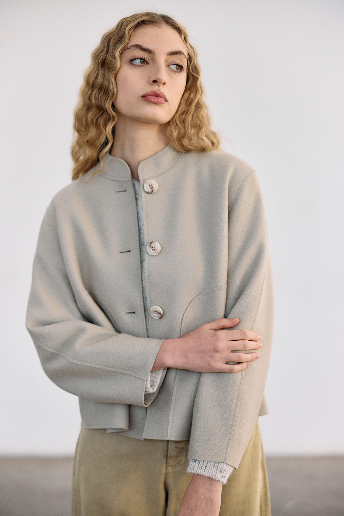 Buttoned short jacket, crafted in a high-quality alpaca and wool blend. It has been treated with a special felting process (professionally boiled in hot water and dried on high heat). The result is a thick yet lightweight and warm natural material.