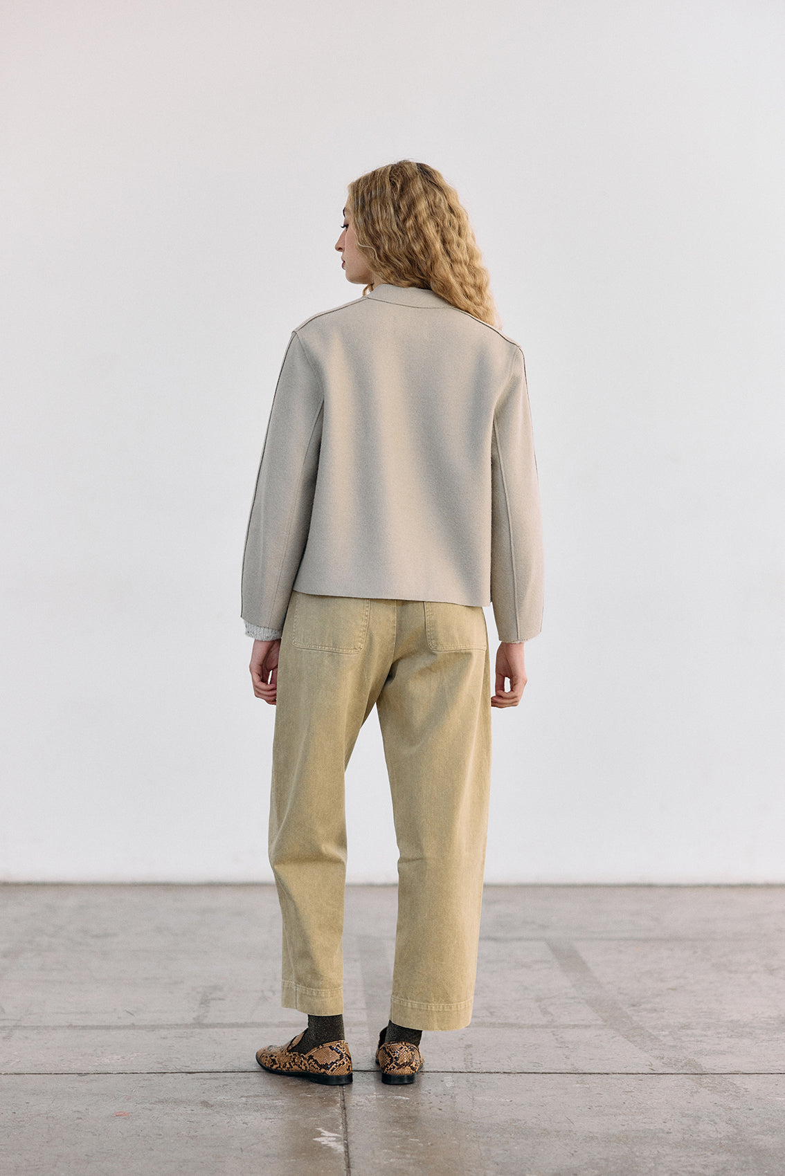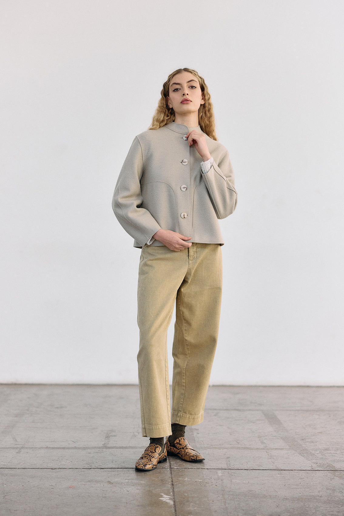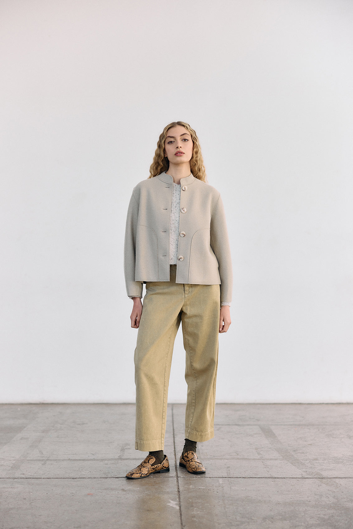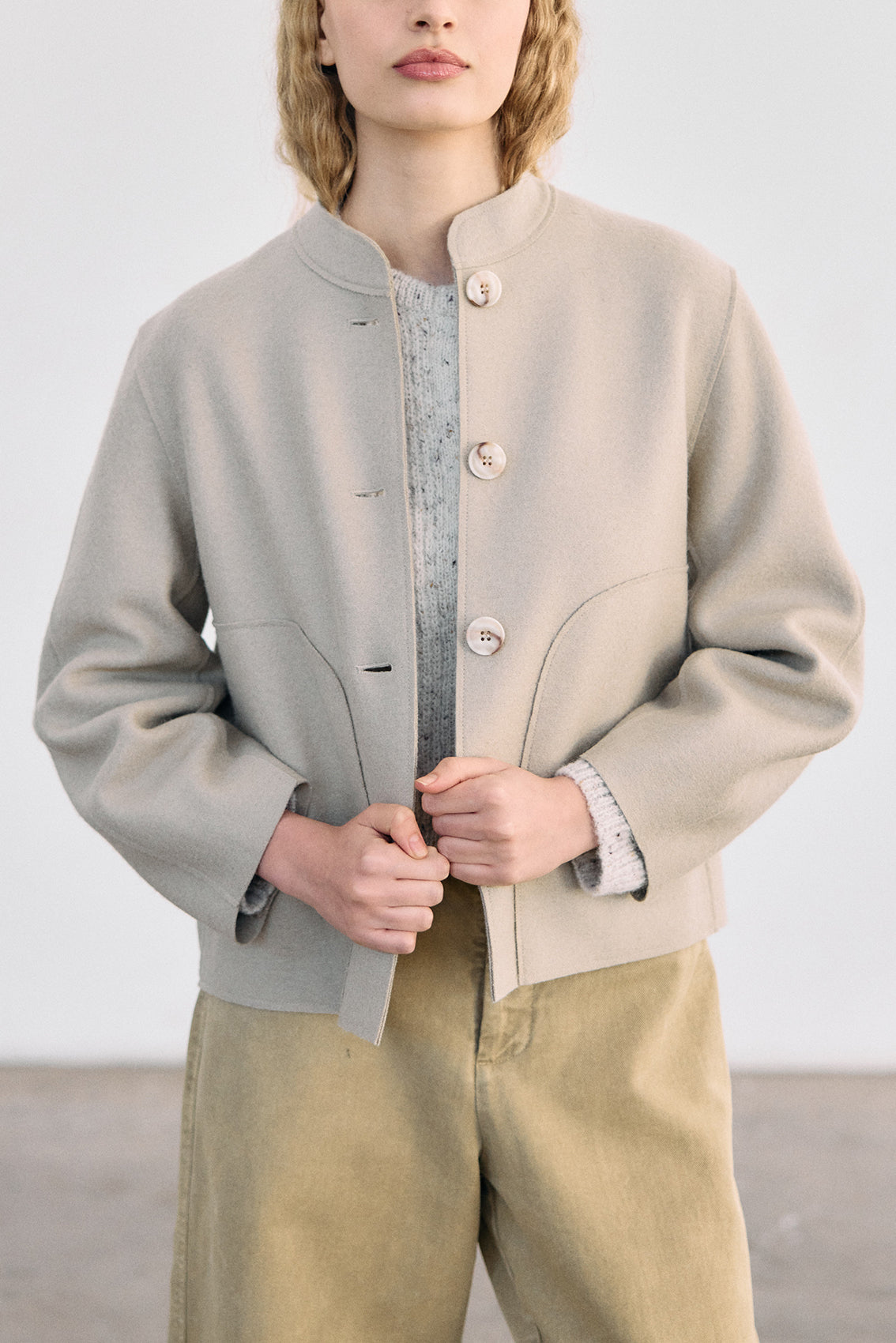 Buttoned short jacket, crafted in a high-quality alpaca and wool blend. It has been treated with a special felting process (professionally boiled in hot water and dried on high heat). The result is a thick yet lightweight and warm natural material.