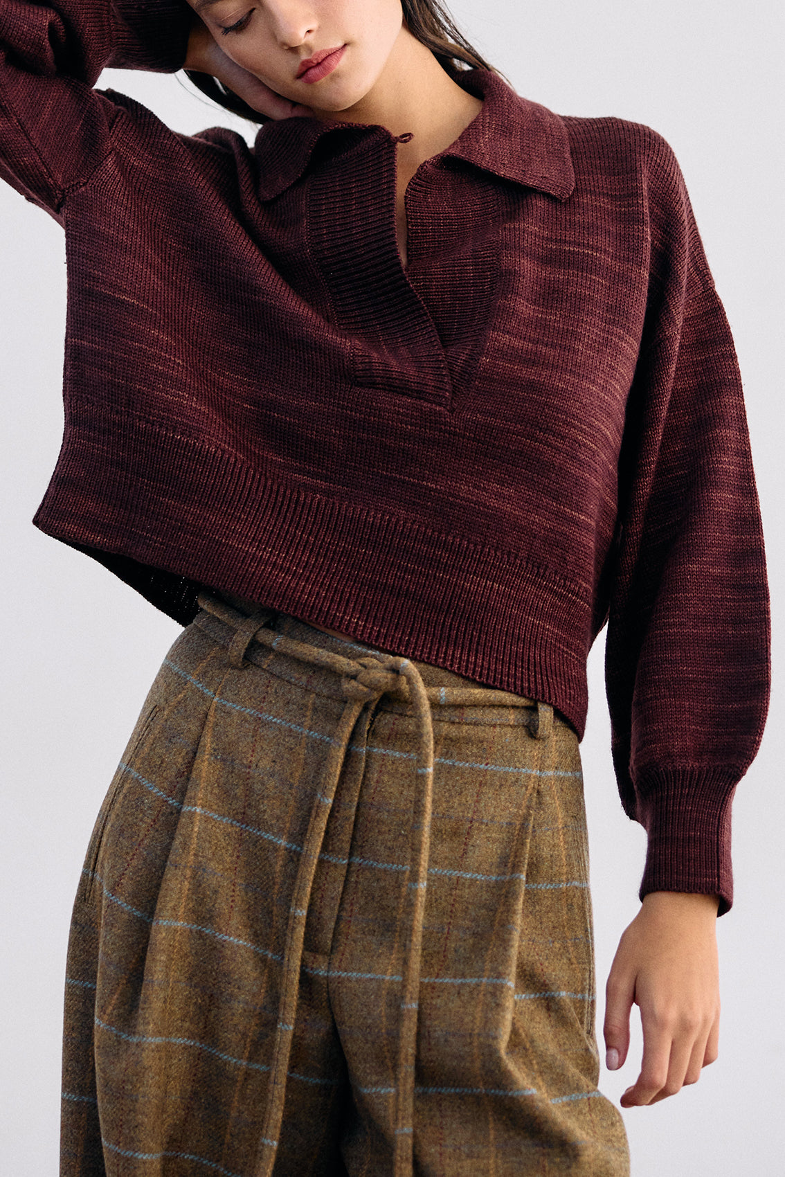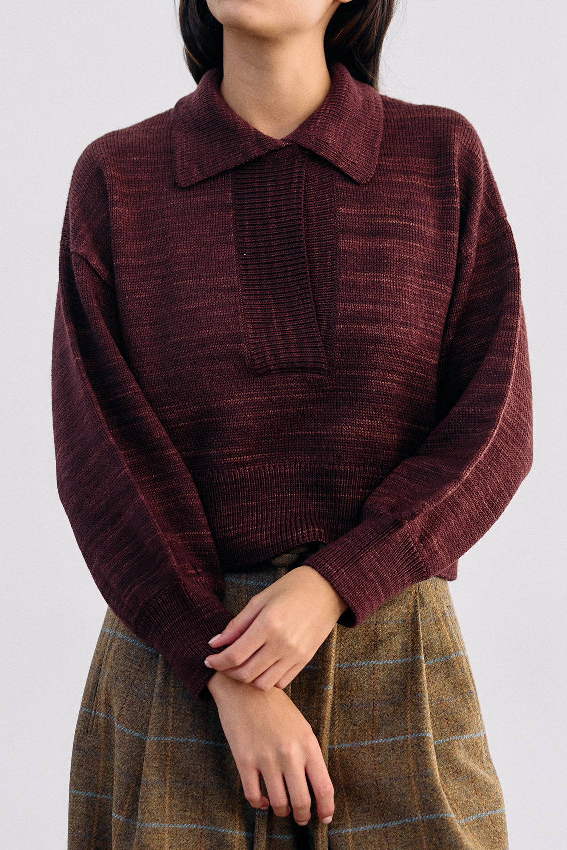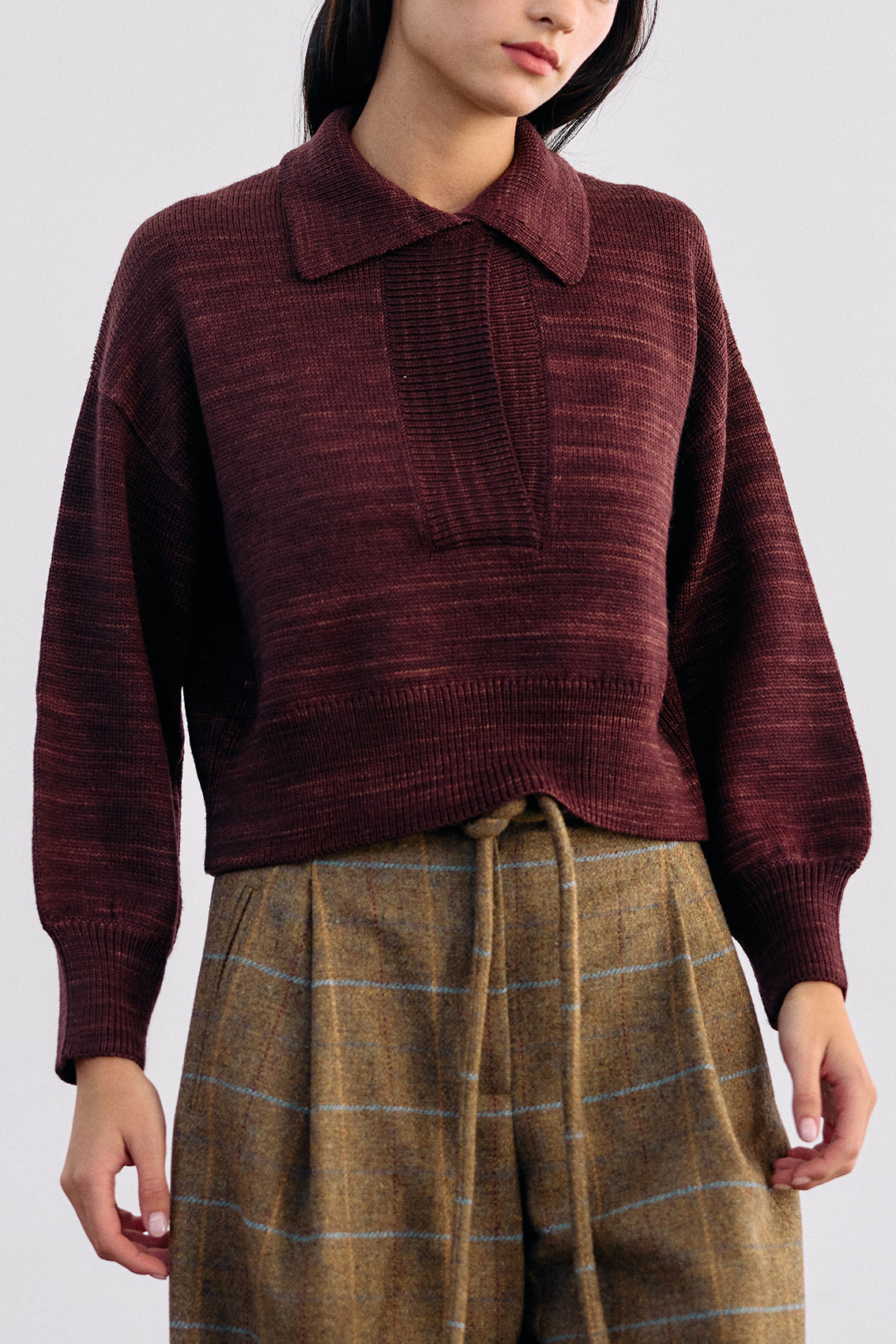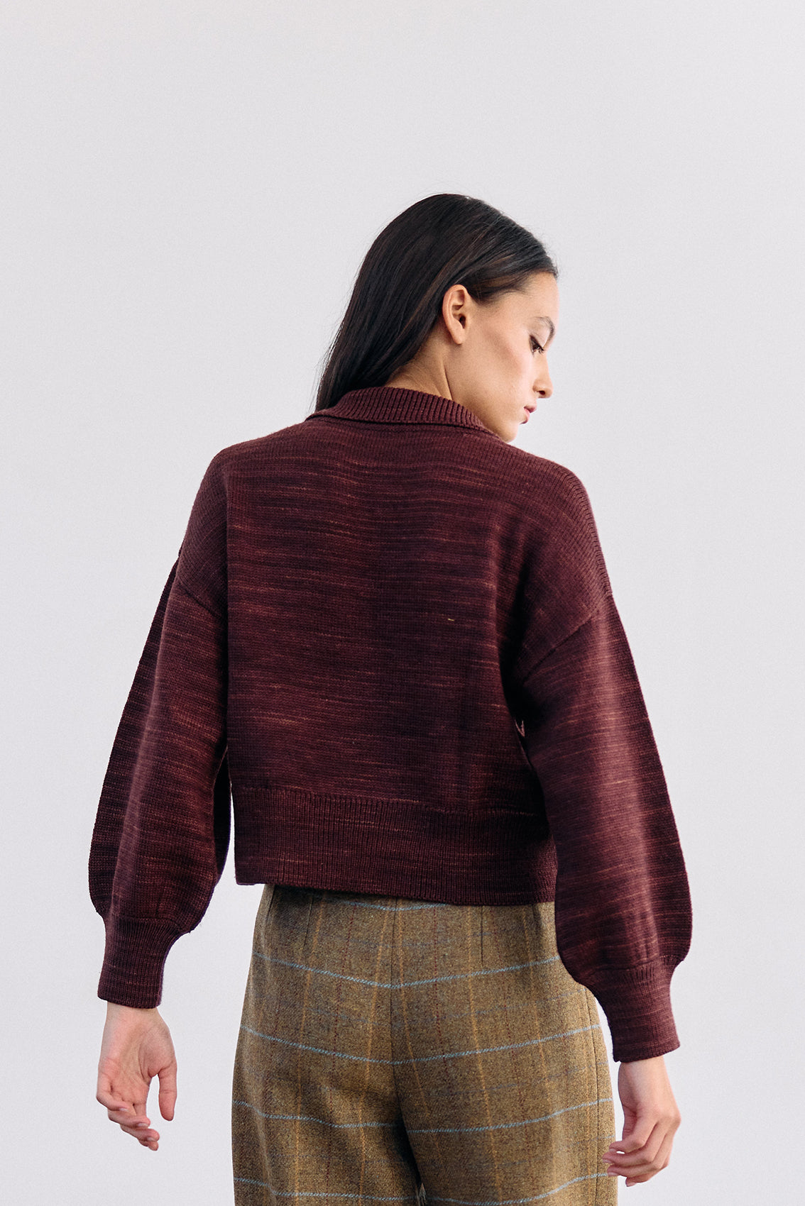 Cropped and collared knitted sweater, woven in hand-dyed 100% merino wool. Designed with speckled knitted techniques in a subtle artisanal mélange. It features slightly bulbed sleeves and a button under the neck for optional closure. A high-quality, carefully crafted, special knitted piece.