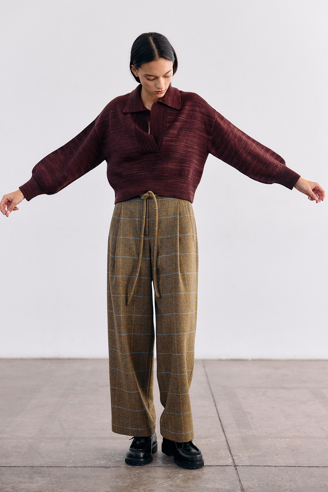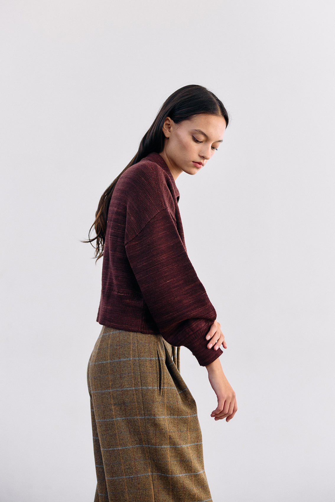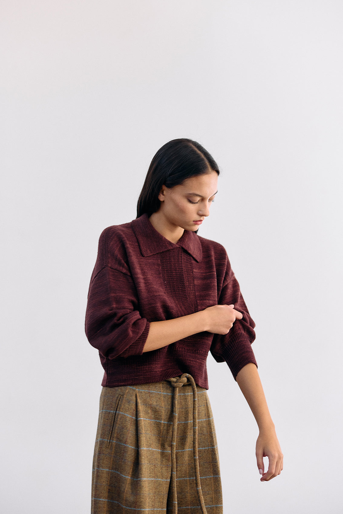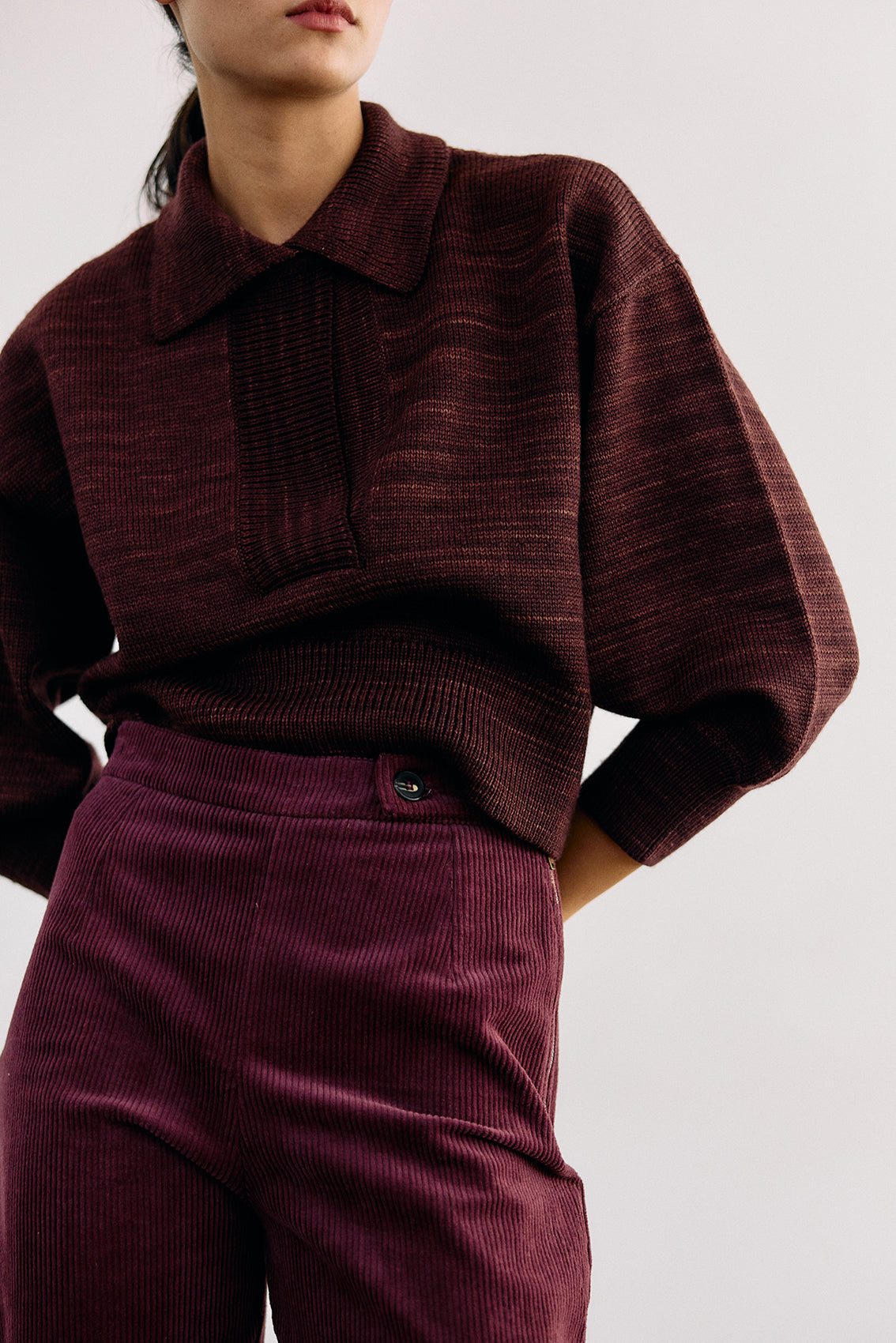 Cropped and collared knitted sweater, woven in hand-dyed 100% merino wool. Designed with speckled knitted techniques in a subtle artisanal mélange. It features slightly bulbed sleeves and a button under the neck for optional closure. A high-quality, carefully crafted, special knitted piece.