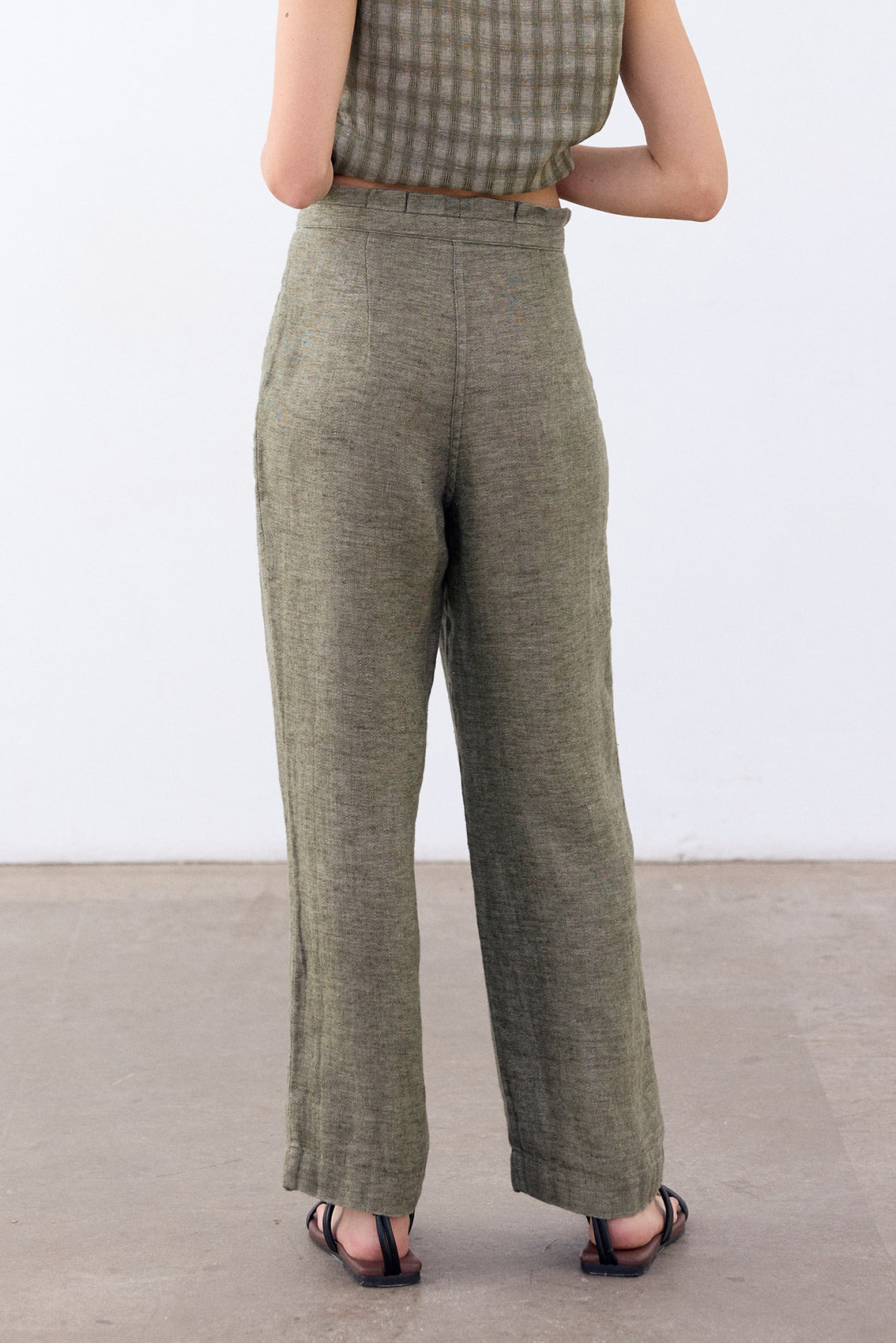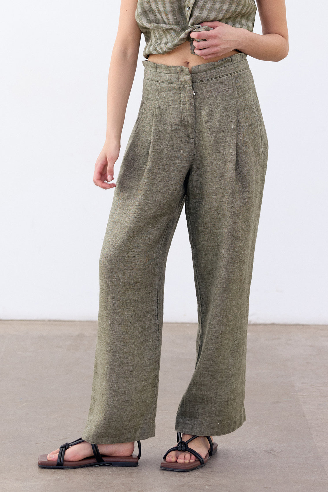 Lightweight high-waisted trousers made in 100% stone-washed linen. These full-length pants feature pleated details at the waist and a draped, relaxed silhouette.