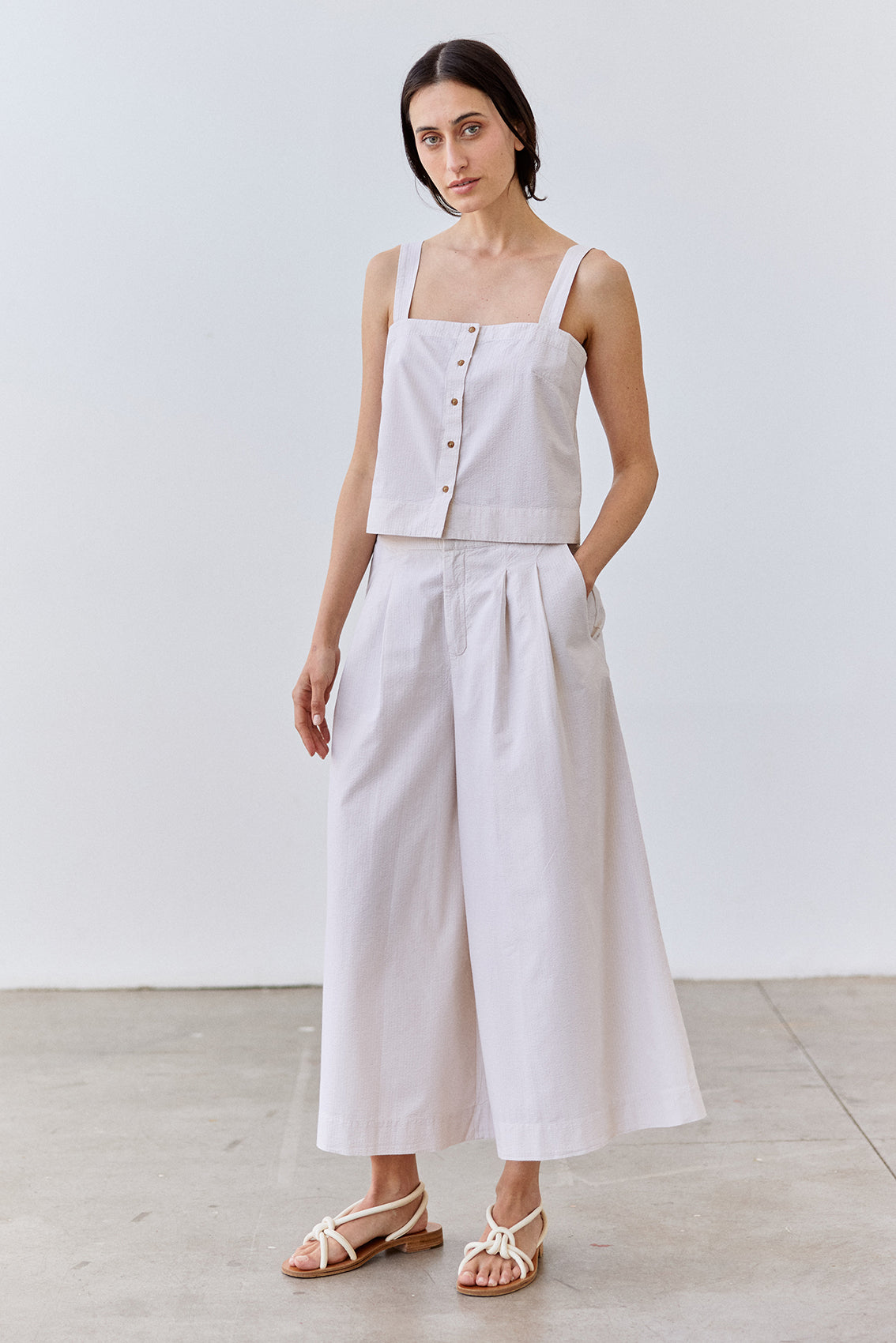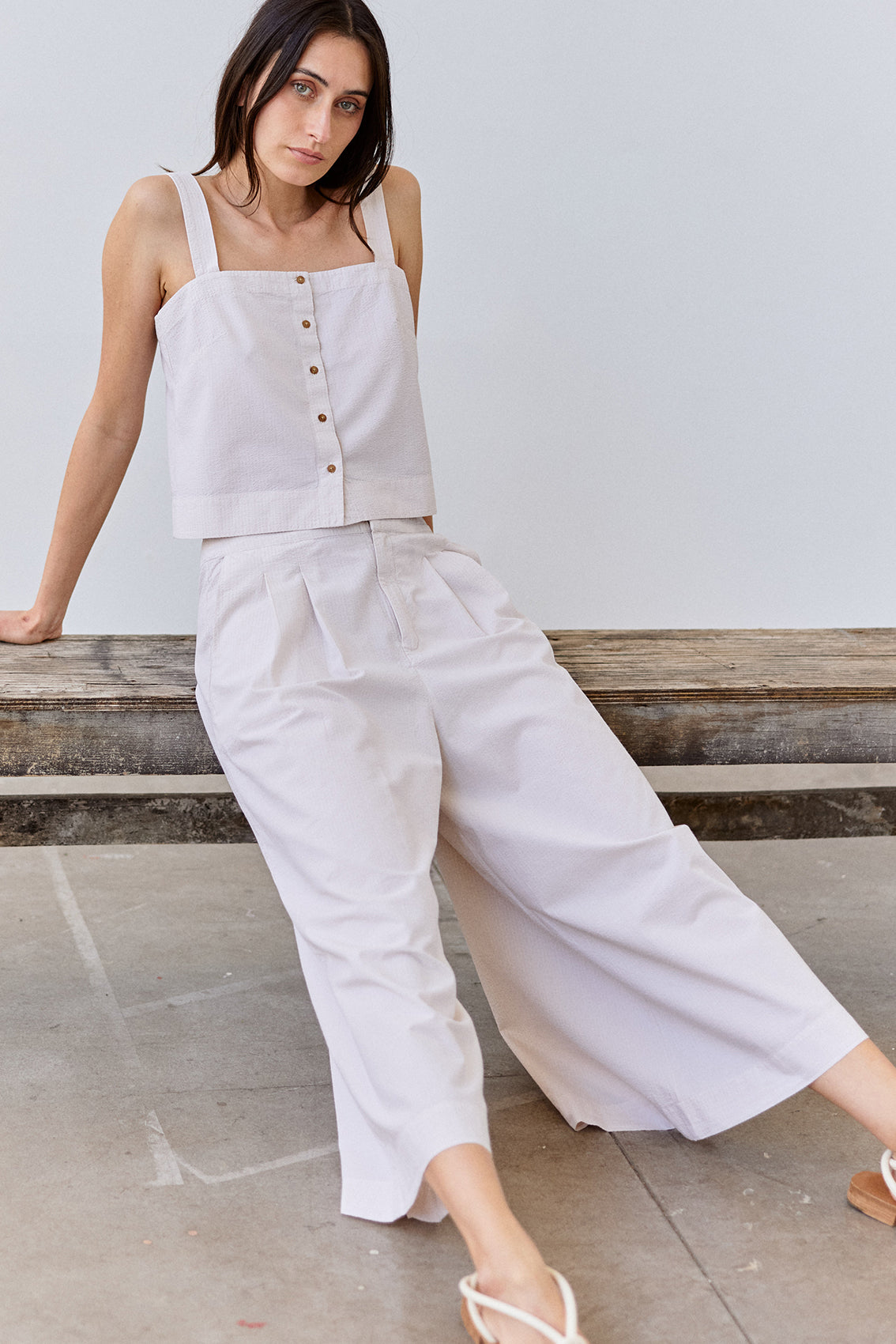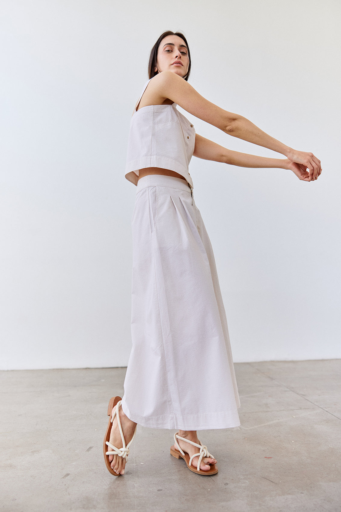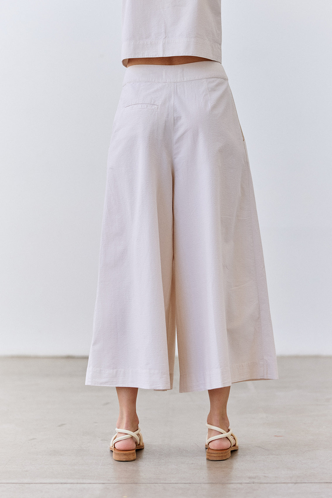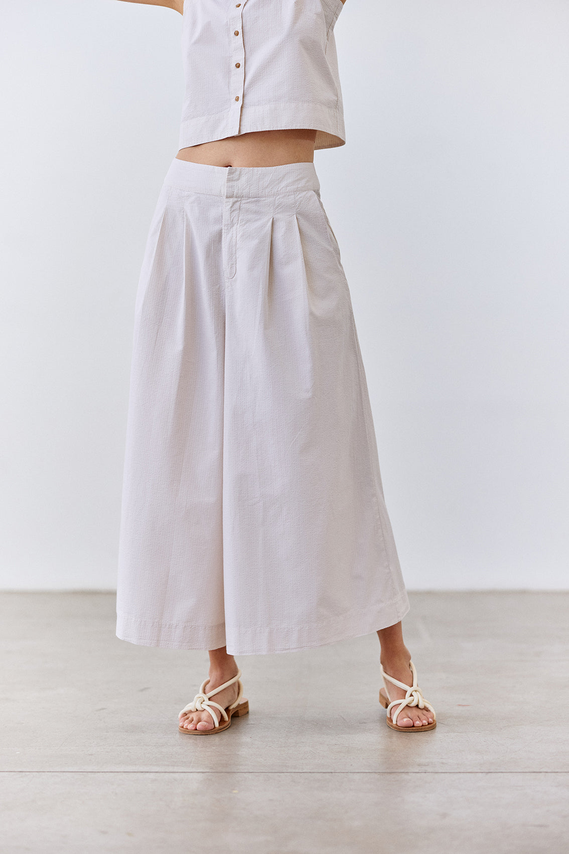 Wide-leg lightweight summer trousers made in 100% cotton with a soft seersucker effect. This high-waisted poplin pant features front pleats, functional side pockets, a wide comfortable waistband, and a single back pocket. A relaxed silhouette designed for every day.