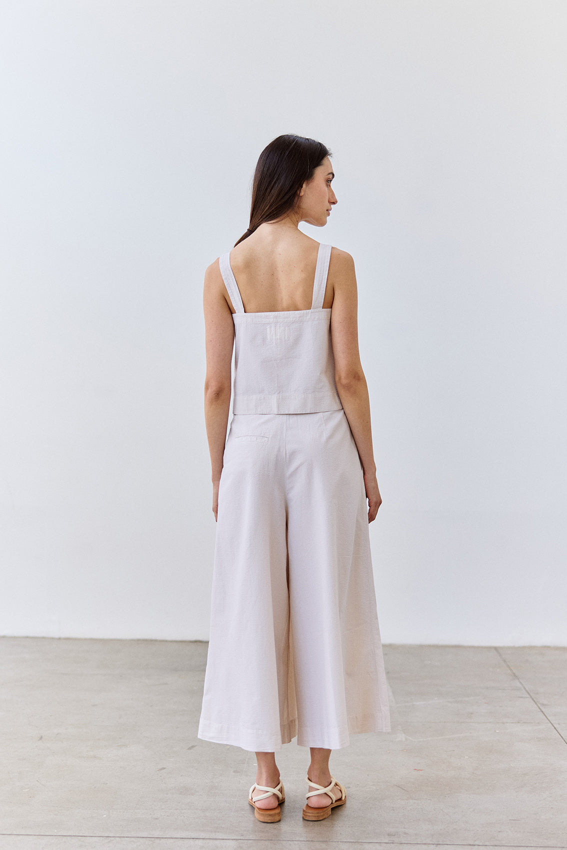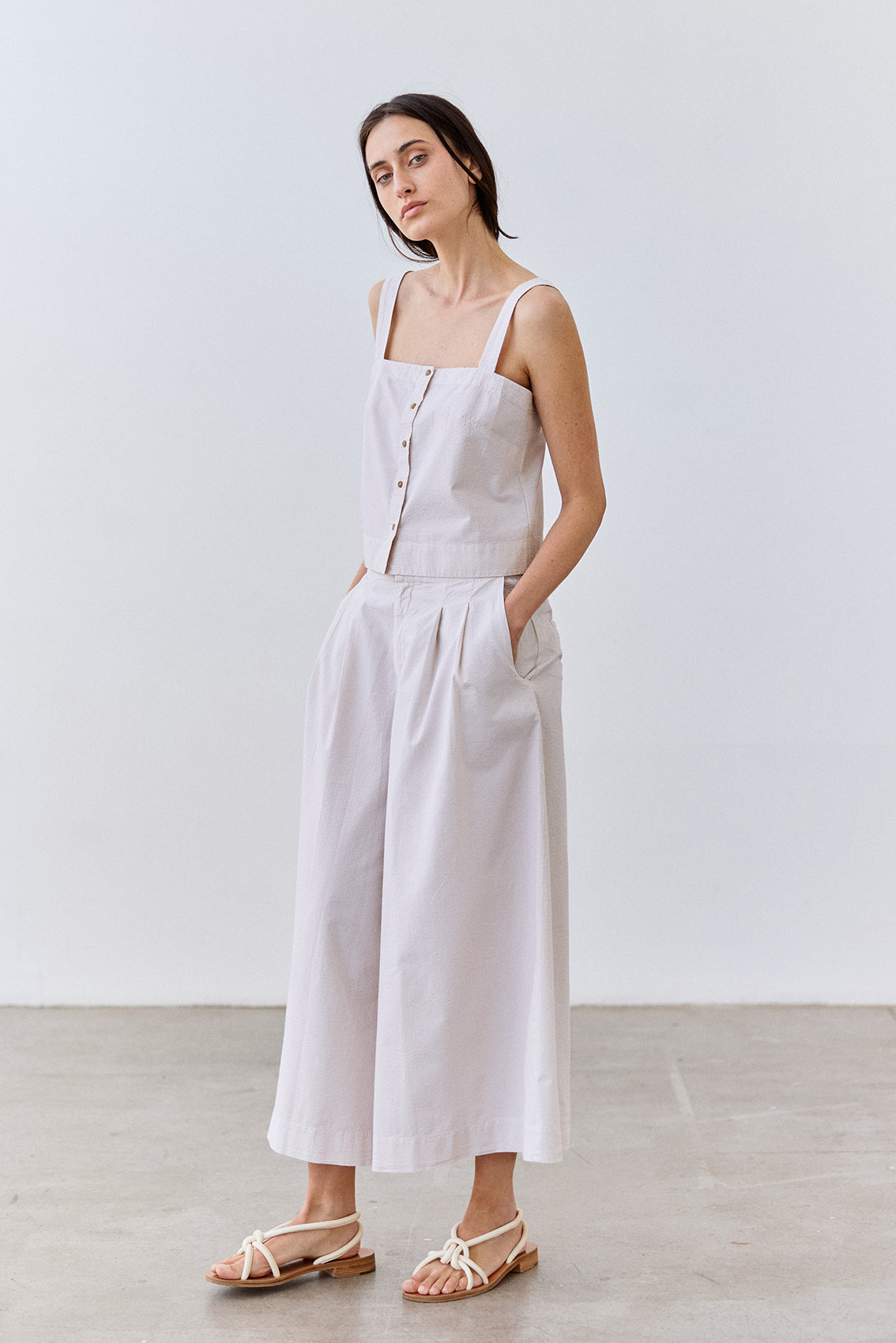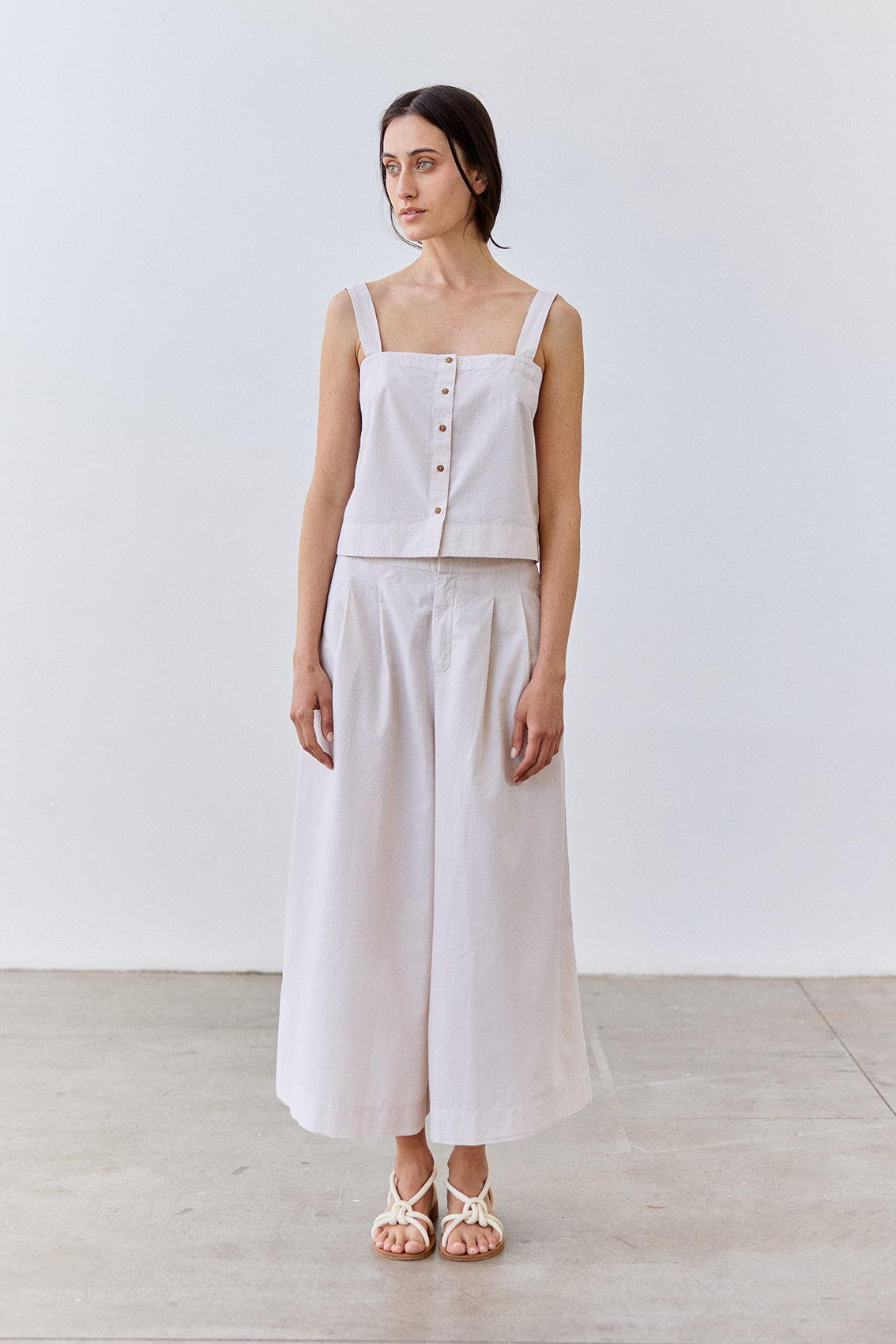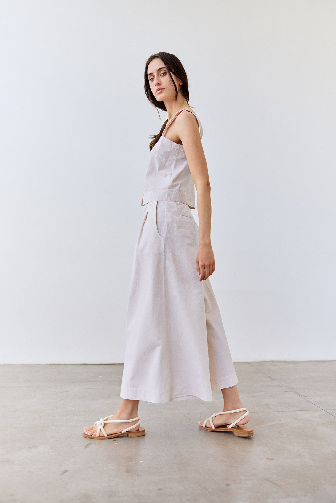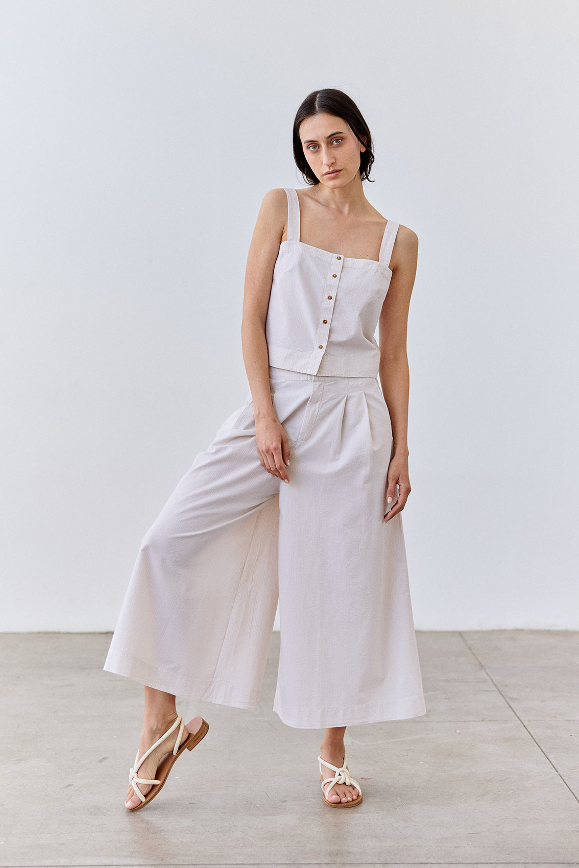 Wide-leg lightweight summer trousers made in 100% cotton with a soft seersucker effect. This high-waisted poplin pant features front pleats, functional side pockets, a wide comfortable waistband, and a single back pocket. A relaxed silhouette designed for every day.