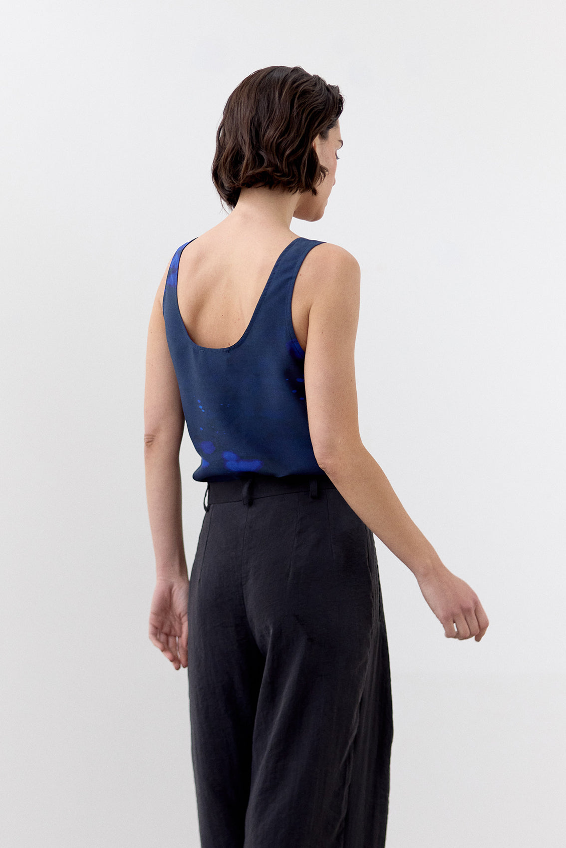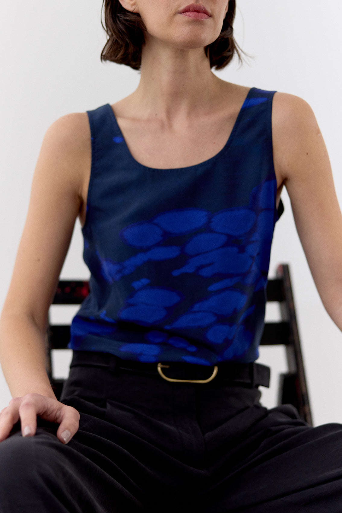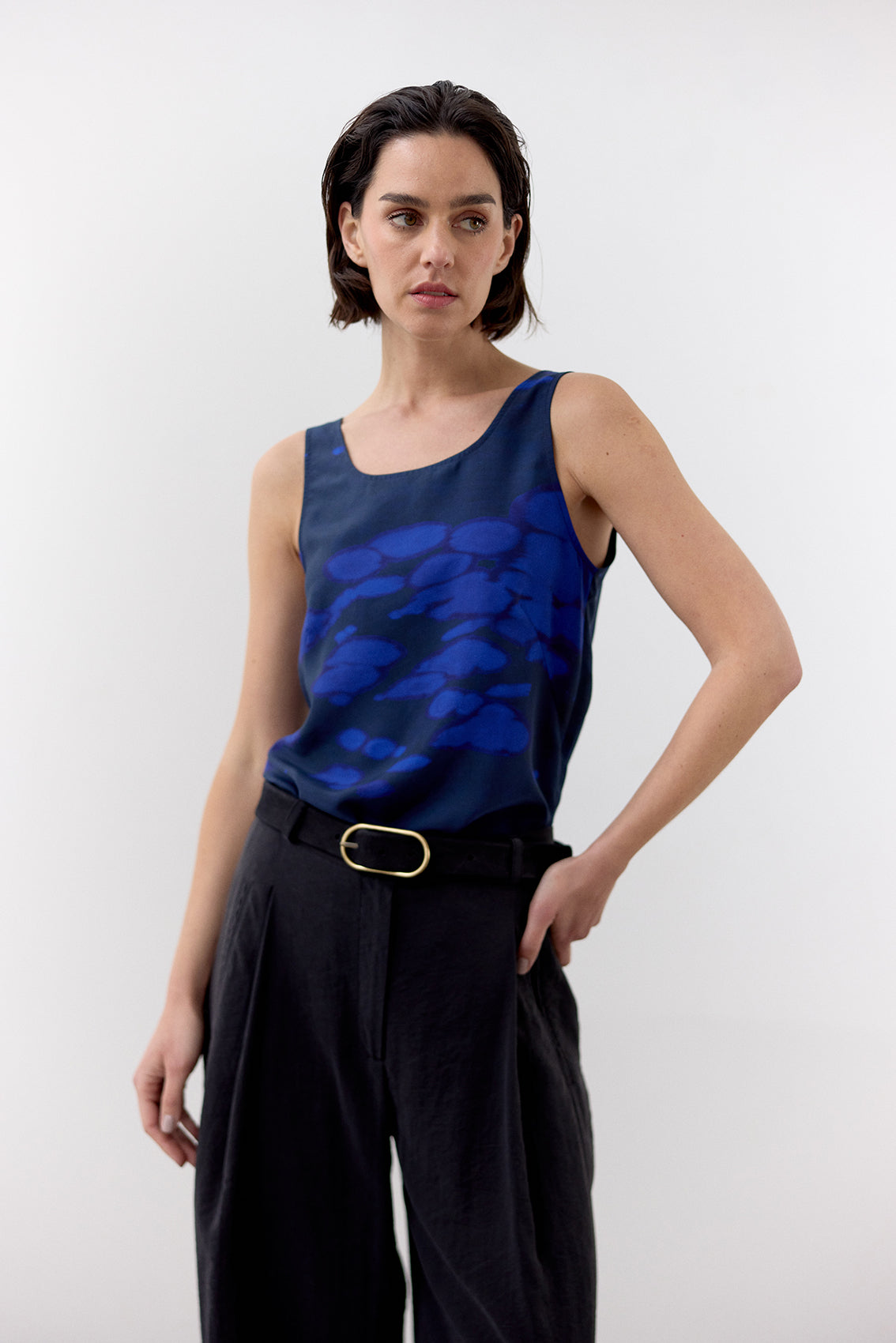 Essential sleeveless top, printed in 100% habotai sandwashed silk.