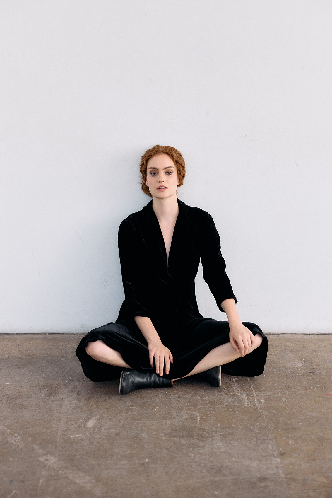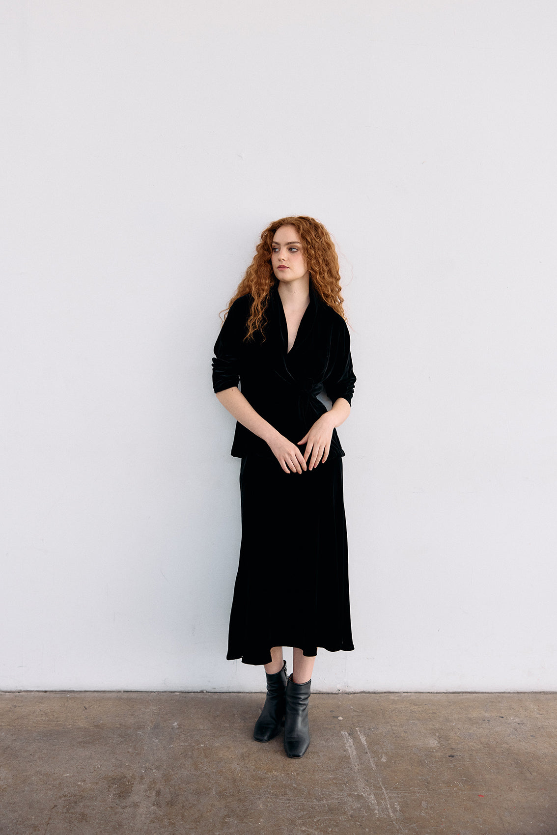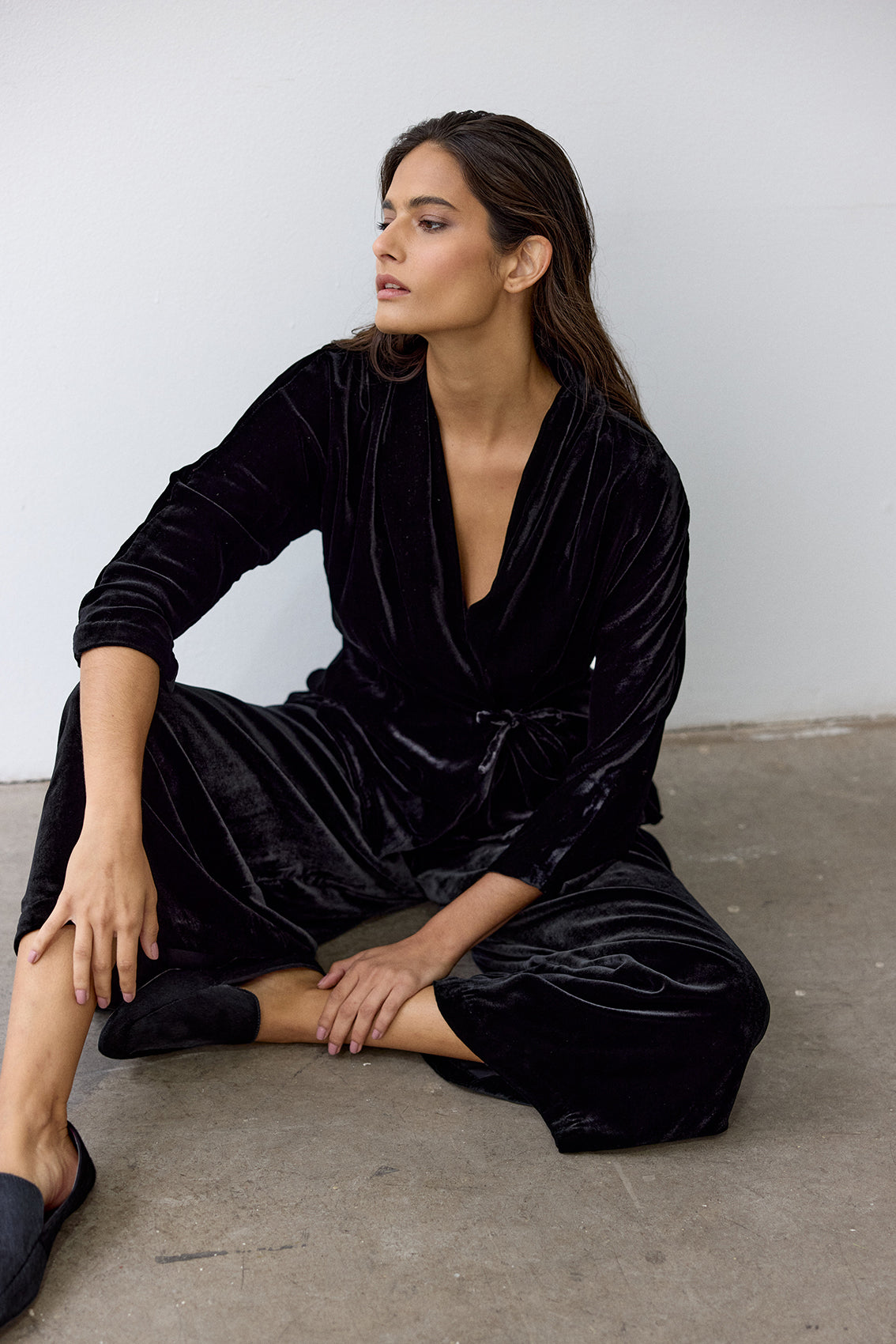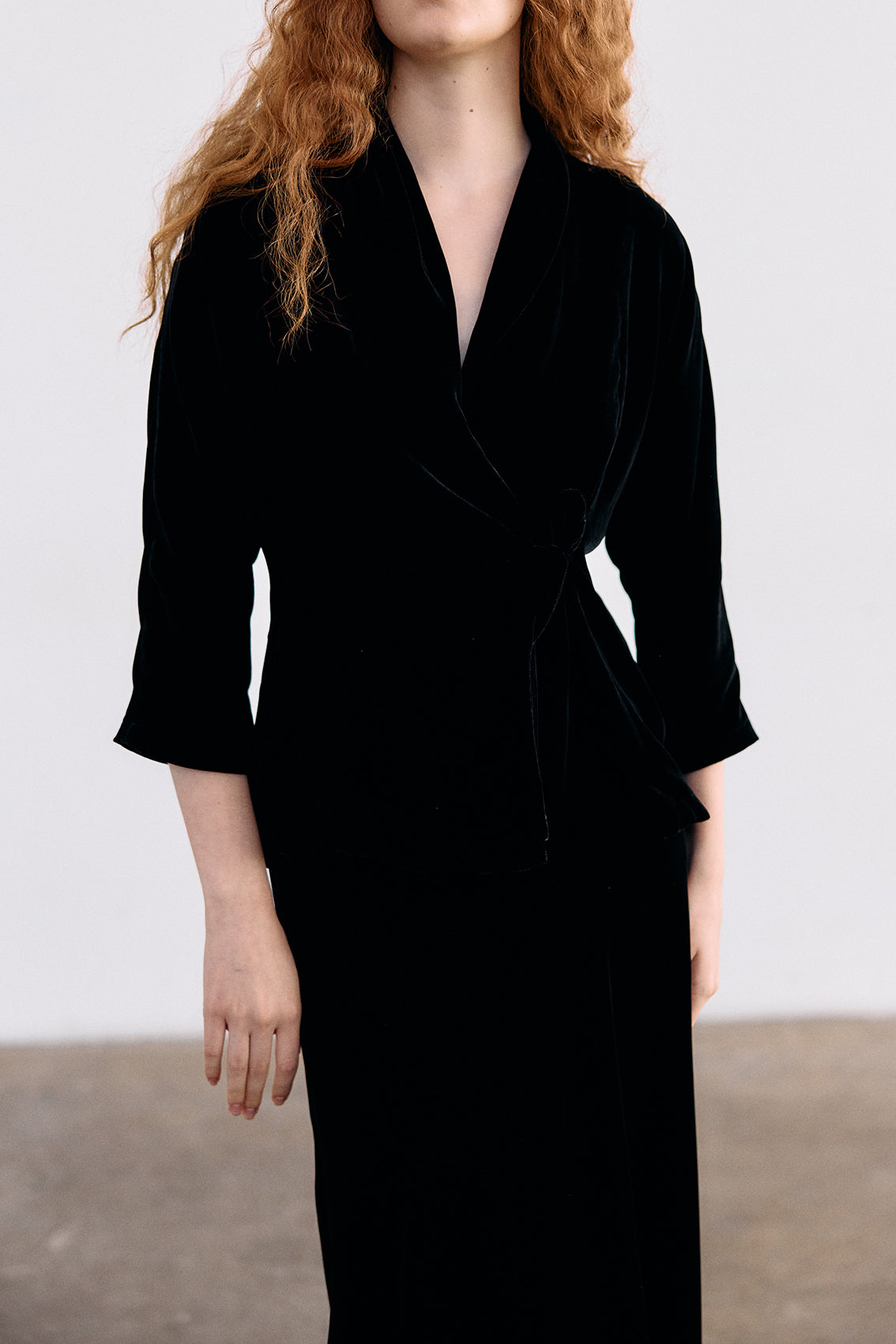 An elevated velvet jacket with a double-breasted crossover tie detail, featuring a beautifully draped collar. Crafted in a supple silk and rayon blend that subtly catches the light. A special piece for fall and winter. Limited production.