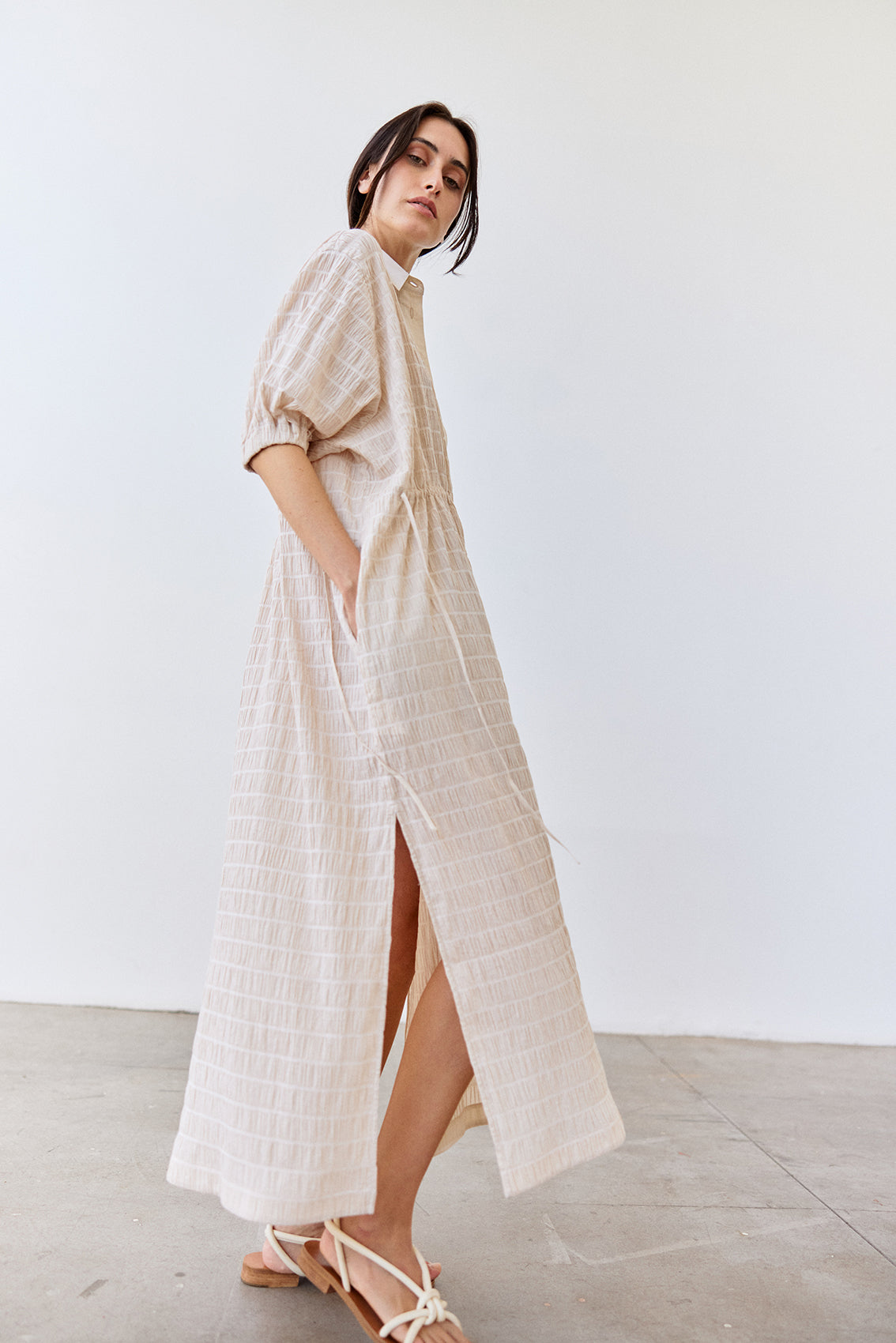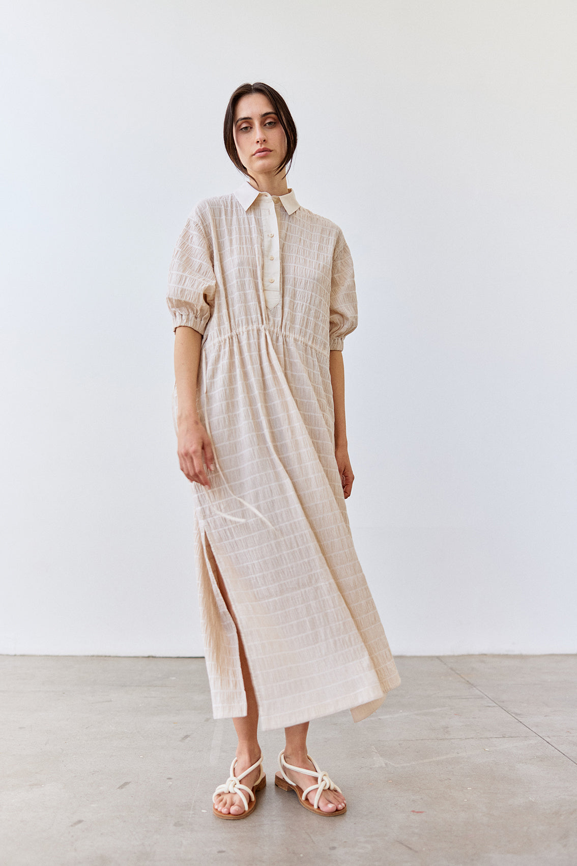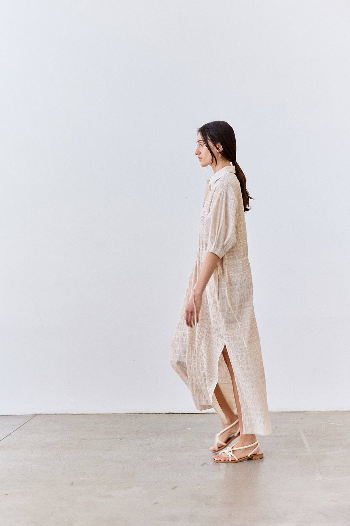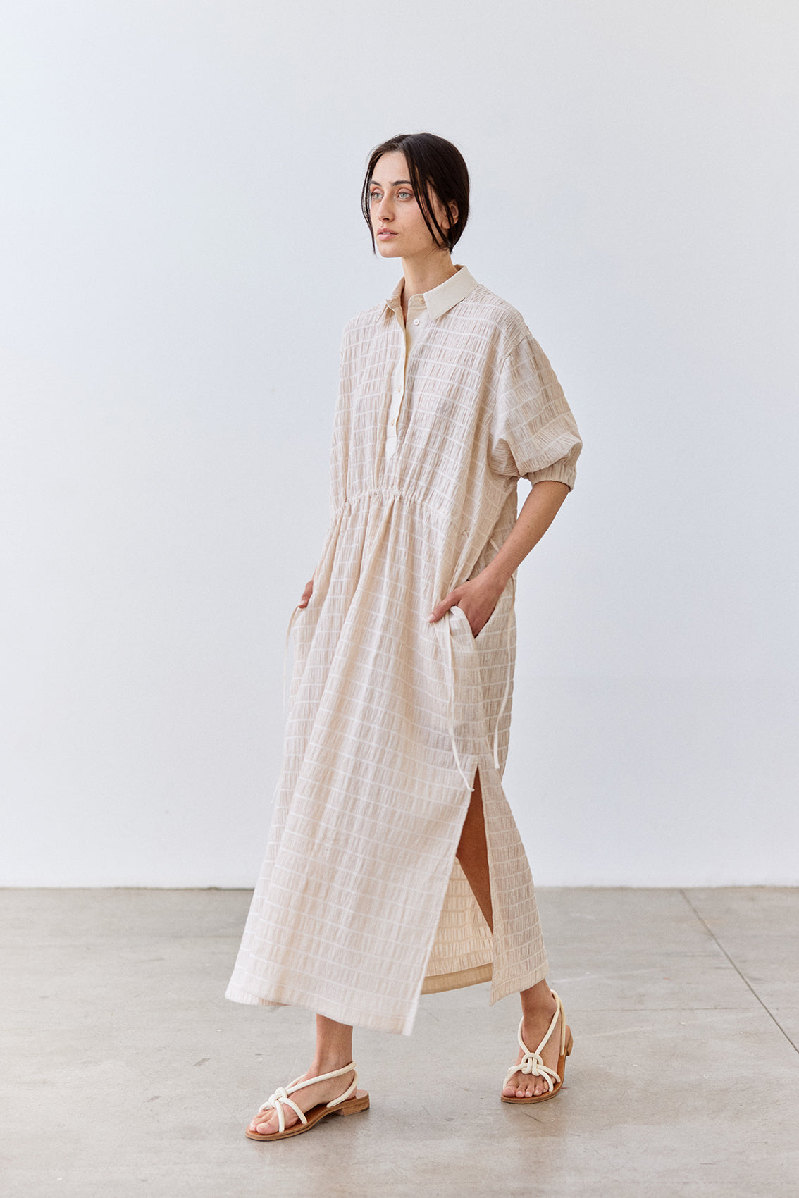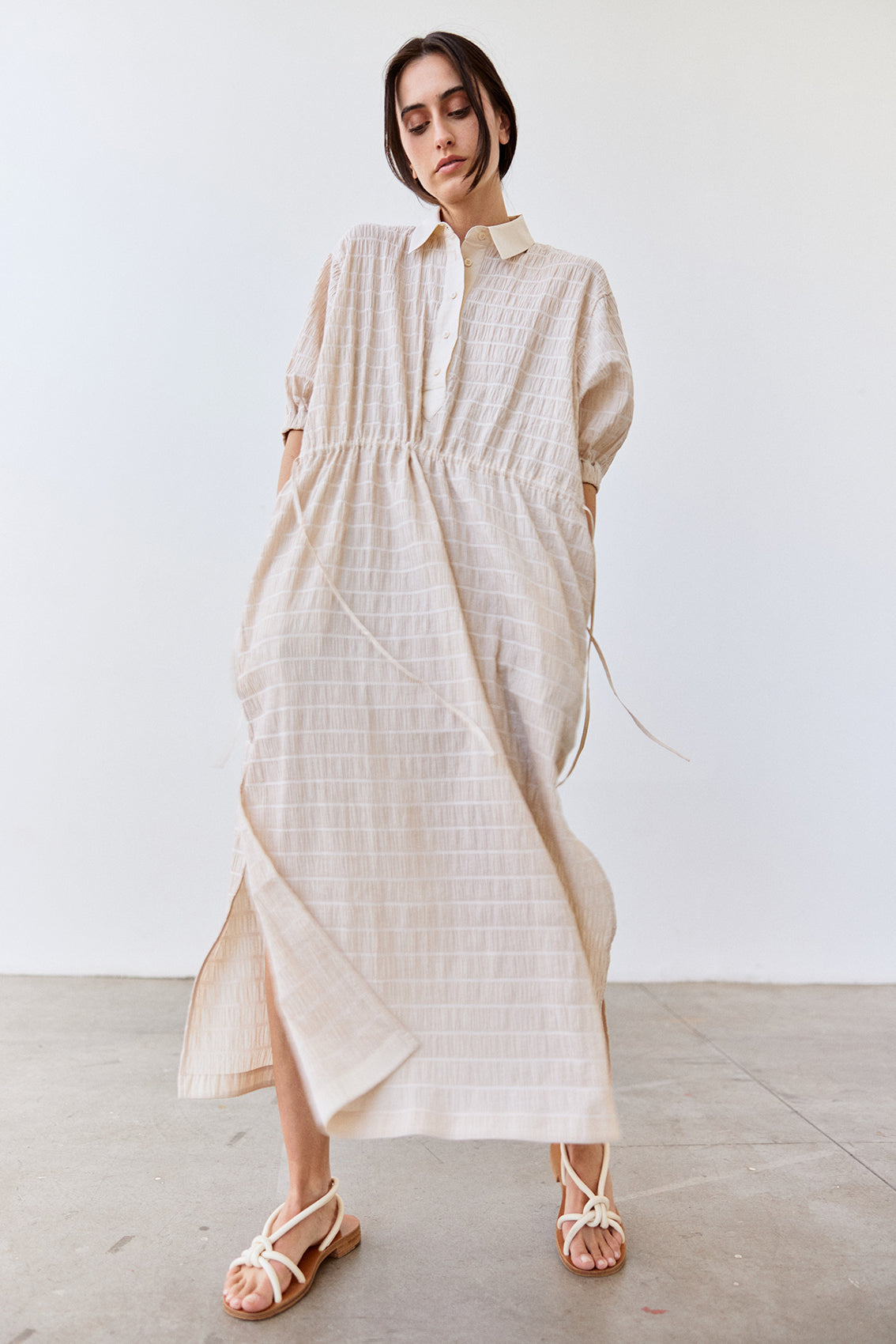 Long, smocked shirt dress, made in Peruvian cotton with delicately gathered fabric details that add dimension and texture. It features adjustable drawstrings at the waist and the back, and a smooth collar and top front button closure. With ample shoulders and comfortable sleeves. A versatile, adaptable shirt dress for every day.
