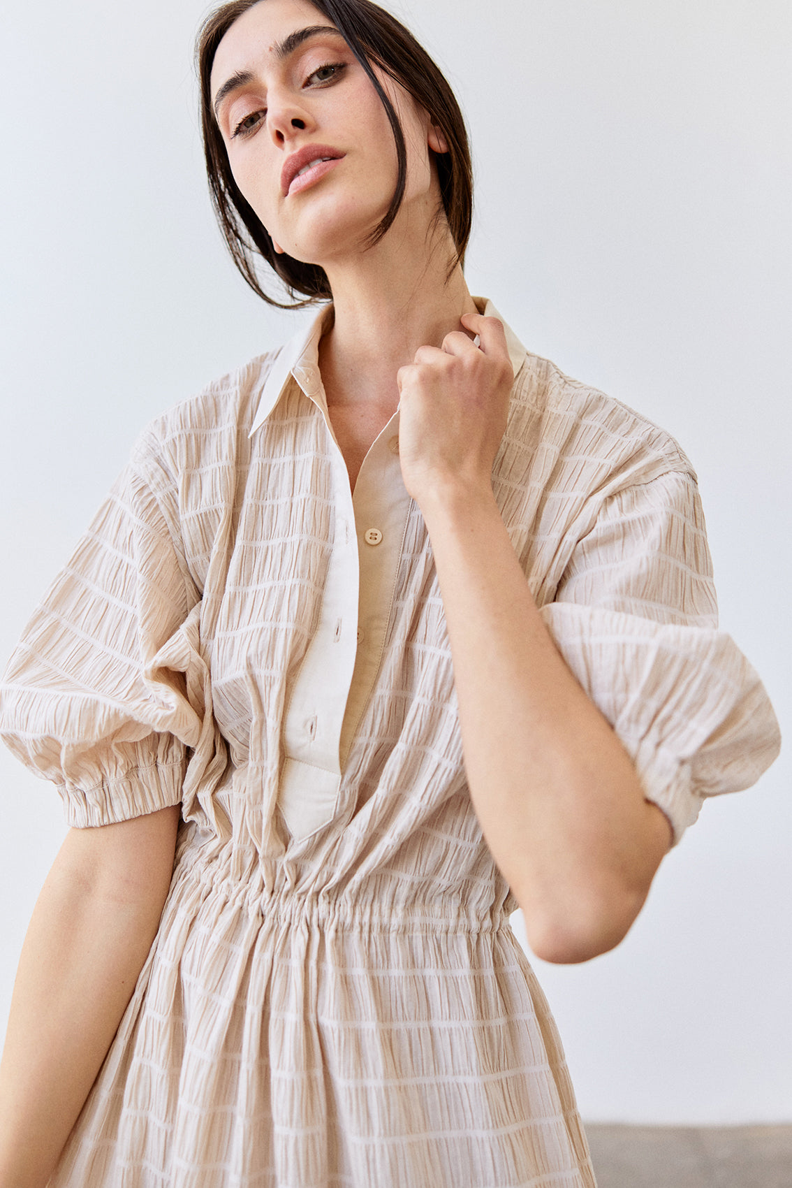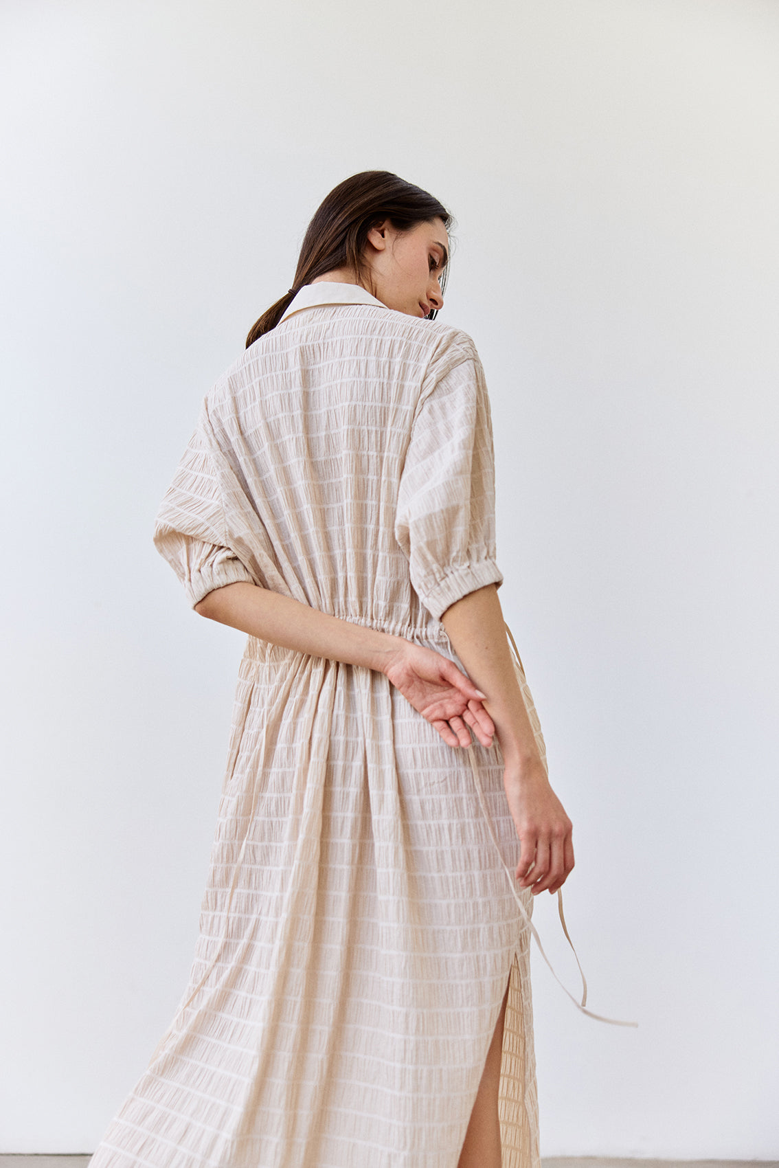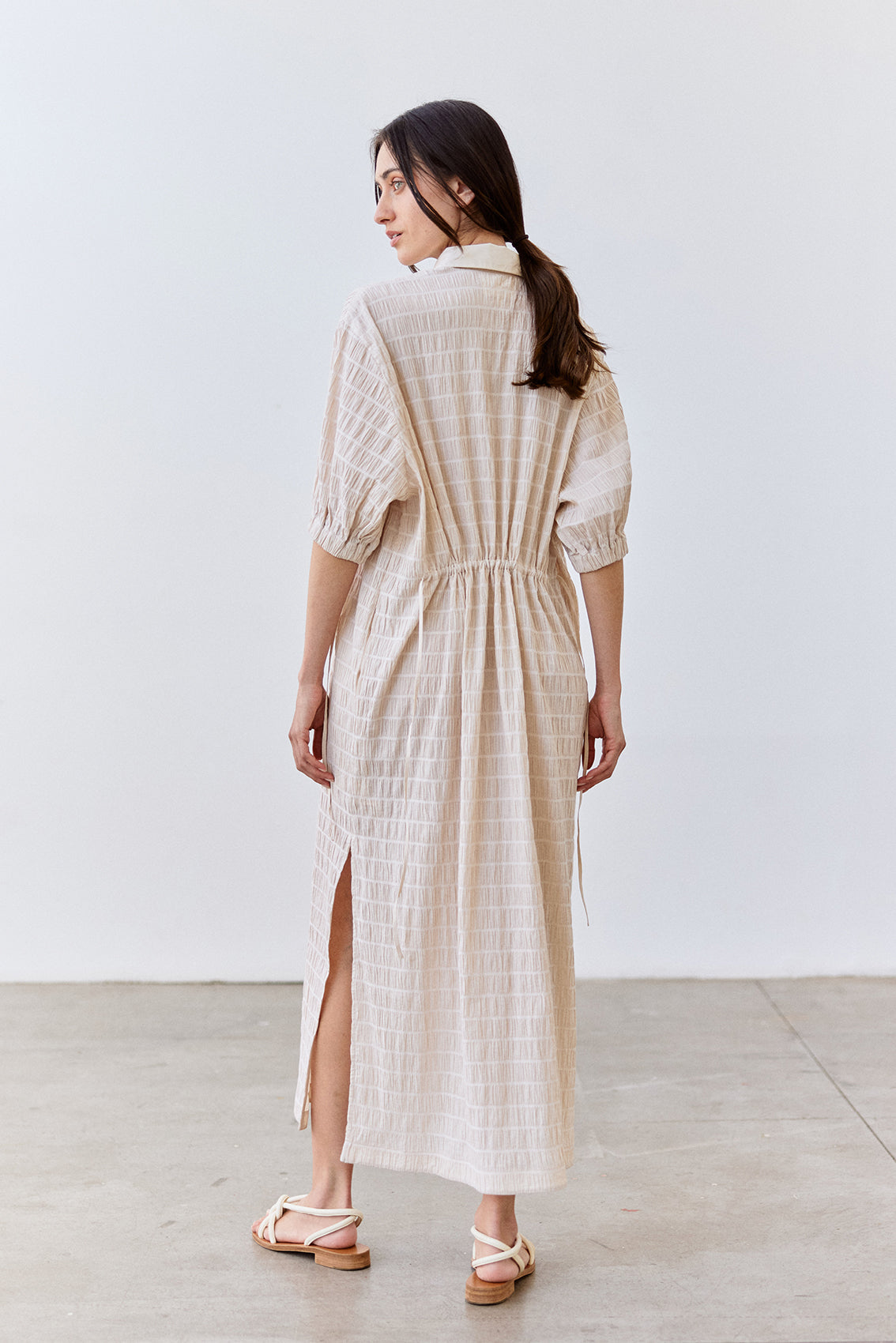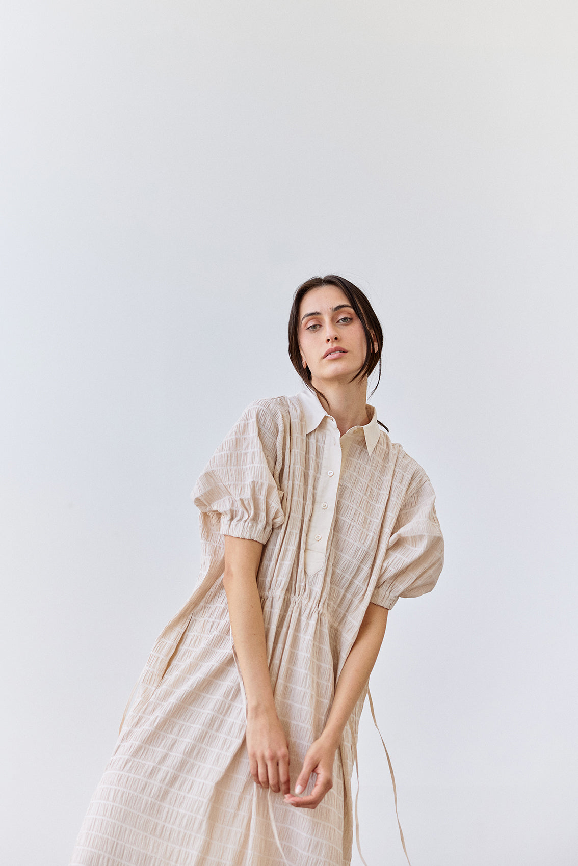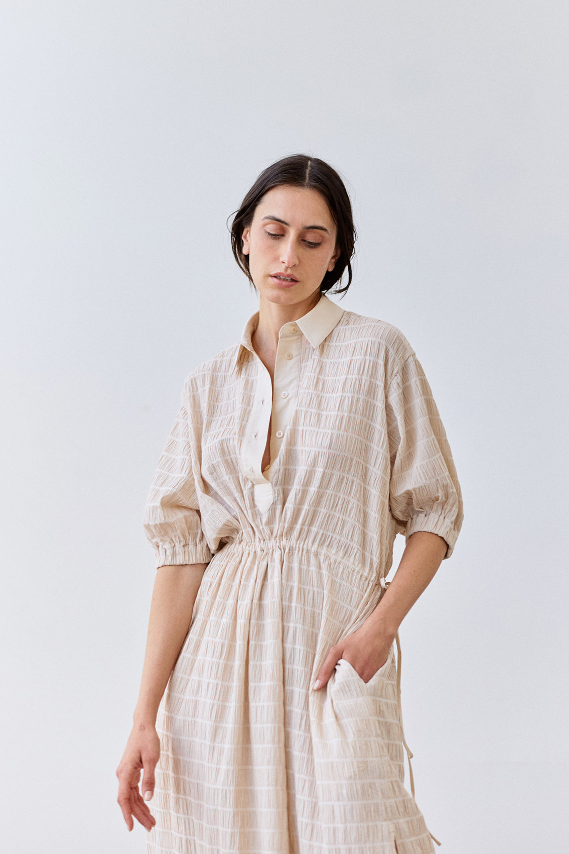 Long, smocked shirt dress, made in Peruvian cotton with delicately gathered fabric details that add dimension and texture. It features adjustable drawstrings at the waist and the back, and a smooth collar and top front button closure. With ample shoulders and comfortable sleeves. A versatile, adaptable shirt dress for every day.