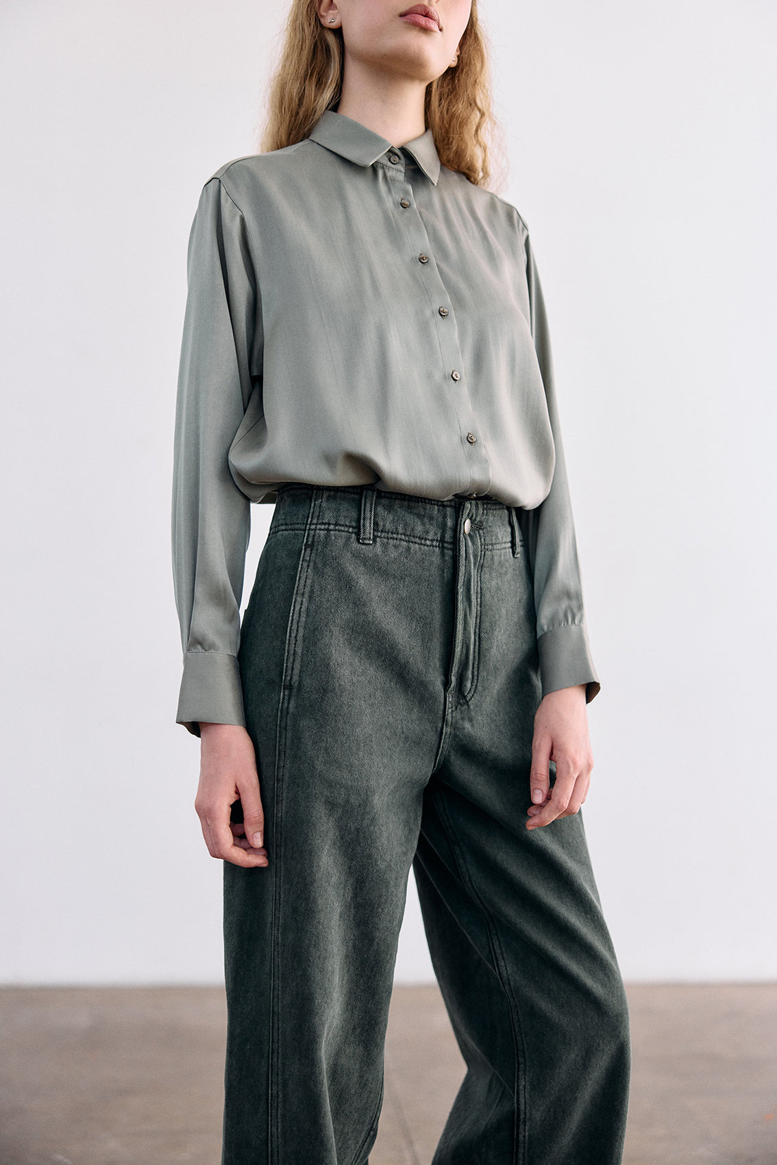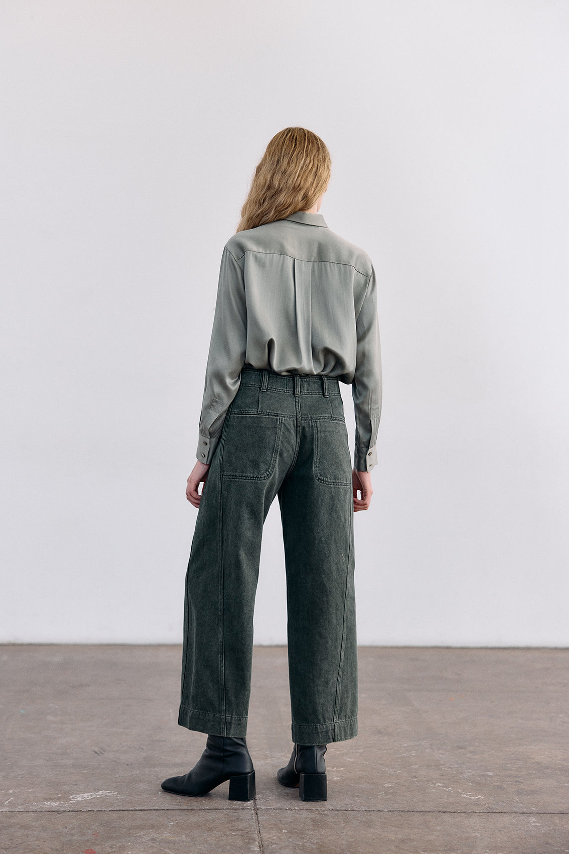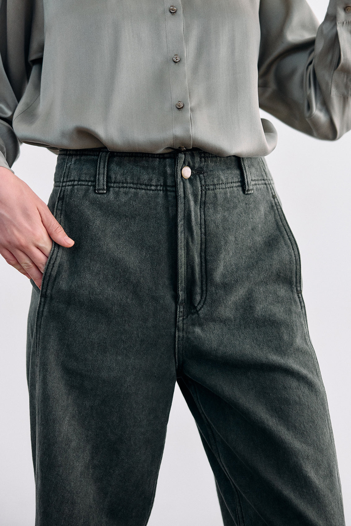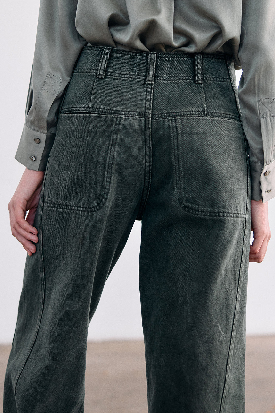 Straight-leg recycled denim jeans, made in 100% cotton. A timeless silhouette with unique design details. These jeans feature subtly displaced lateral cuts that form a flattering side panel where the front and integrated back pockets meet. Finished with classic denim double stitching and a washed denim effect.