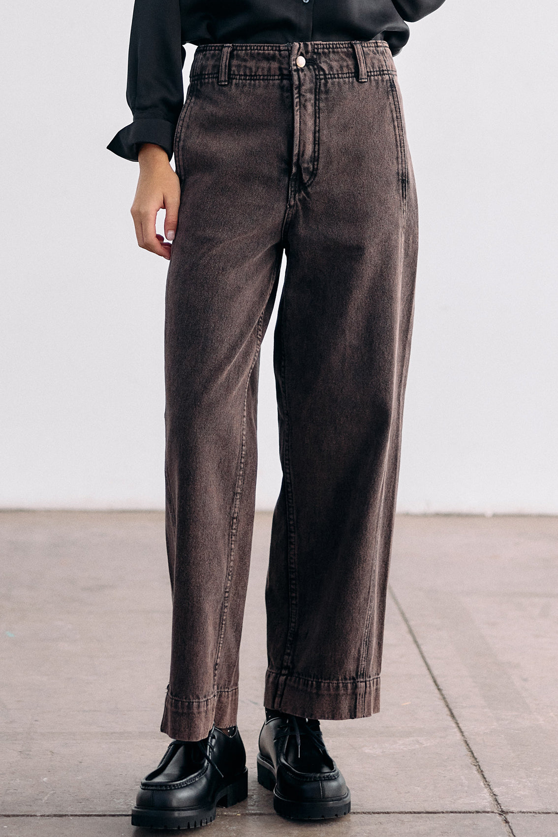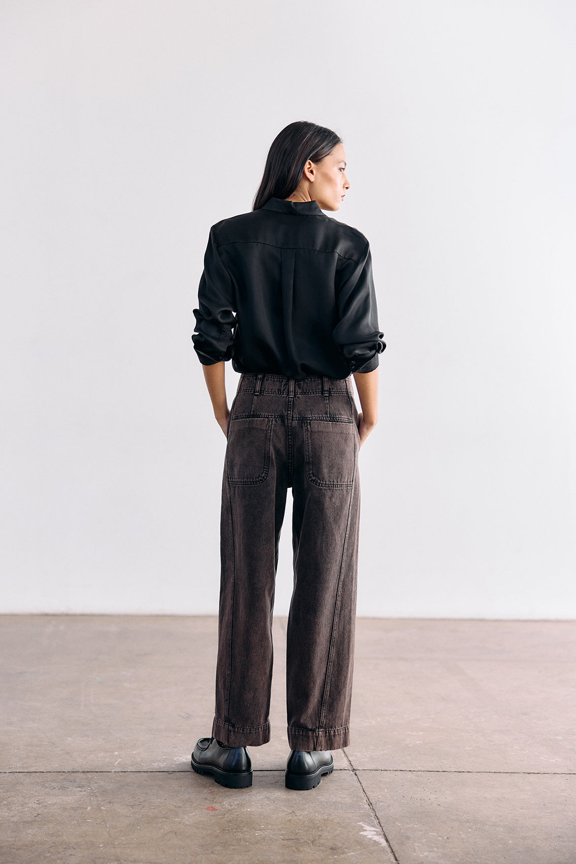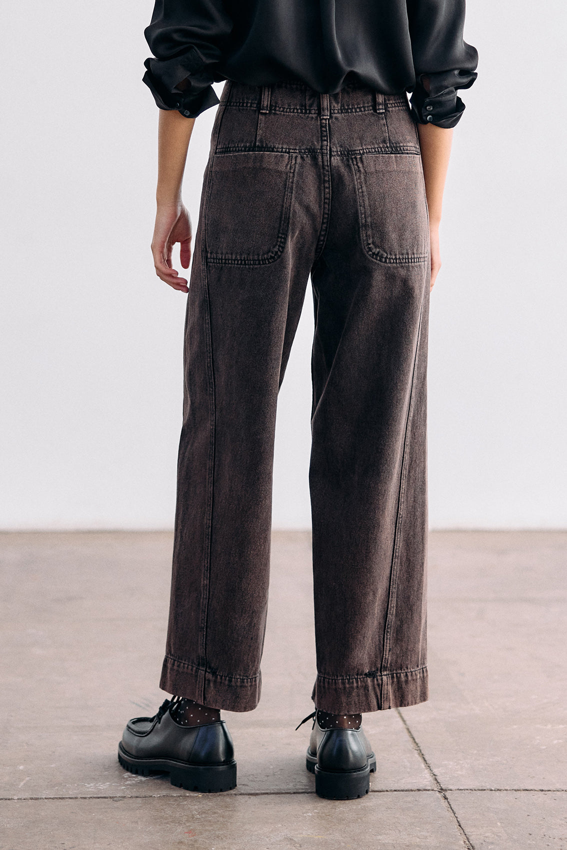 Straight-leg recycled denim jeans, made in 100% cotton. A timeless silhouette with unique design details. These jeans feature subtly displaced lateral cuts that form a flattering side panel where the front and integrated back pockets meet. Finished with classic denim double stitching and a washed denim effect.