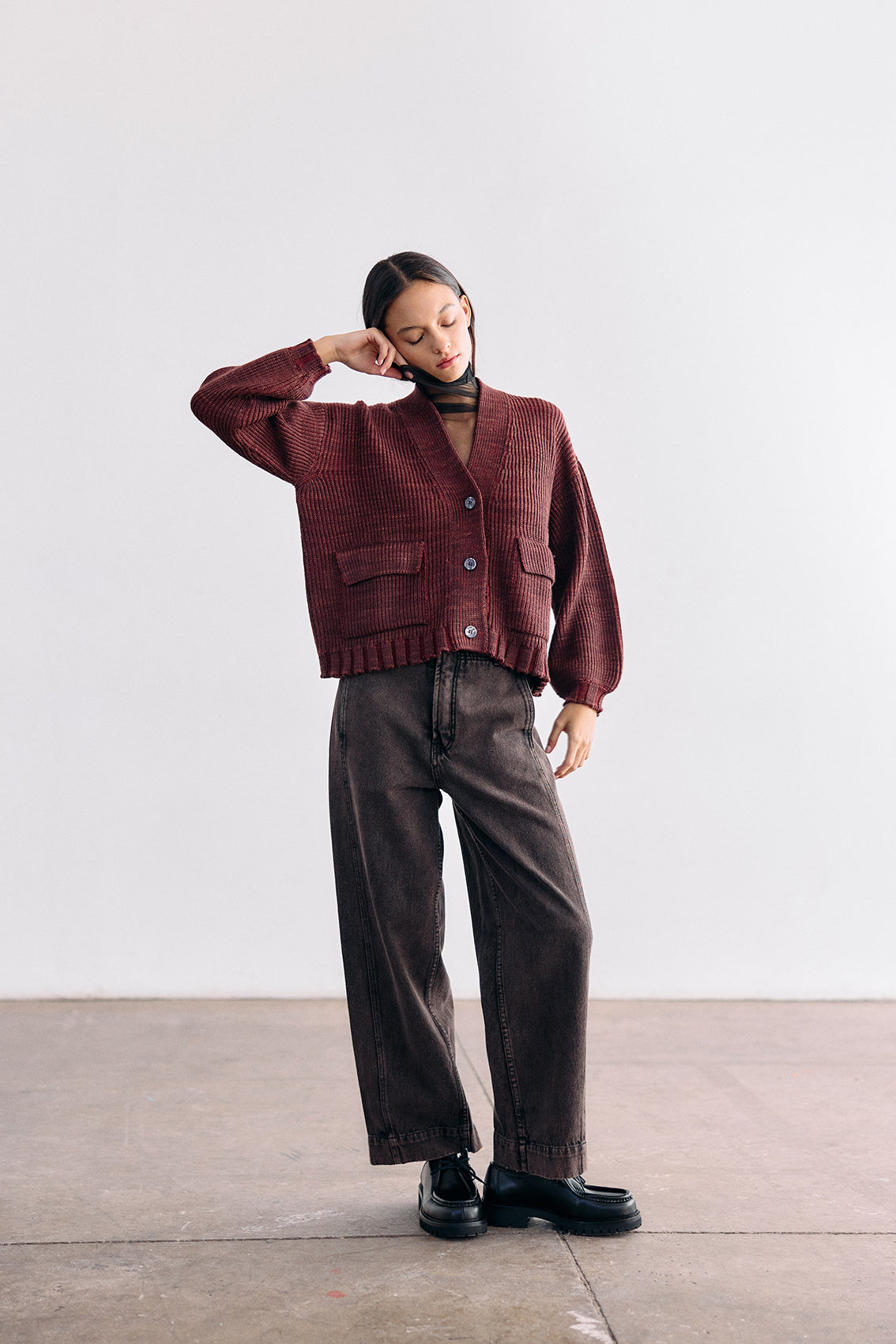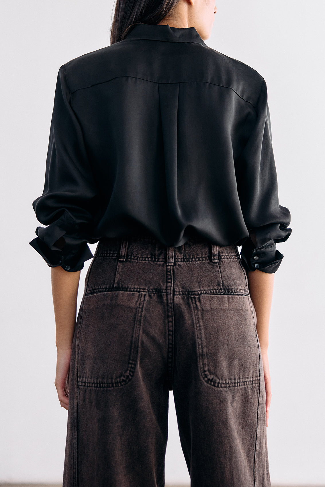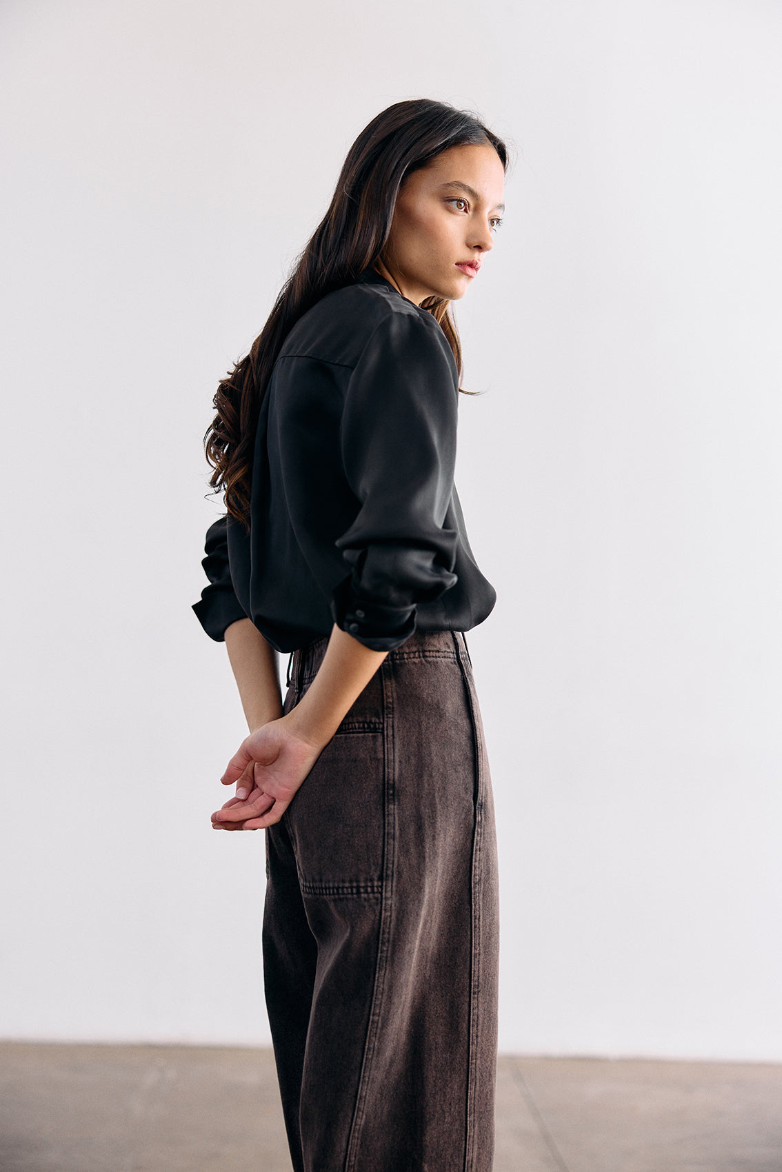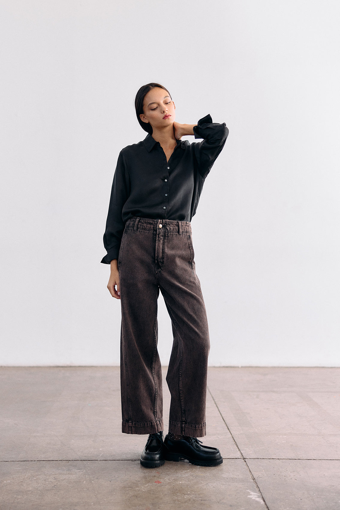 Straight-leg recycled denim jeans, made in 100% cotton. A timeless silhouette with unique design details. These jeans feature subtly displaced lateral cuts that form a flattering side panel where the front and integrated back pockets meet. Finished with classic denim double stitching and a washed denim effect.