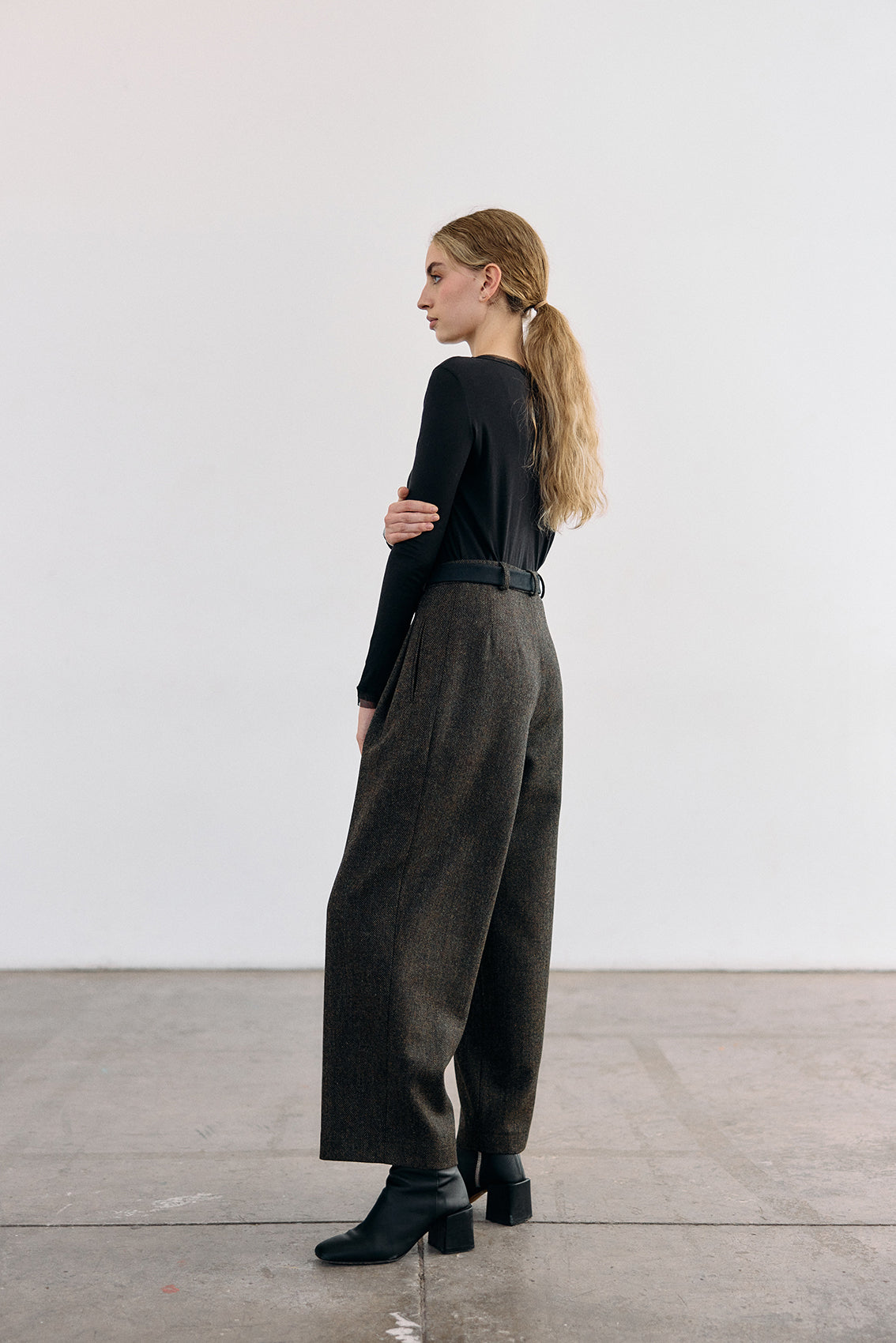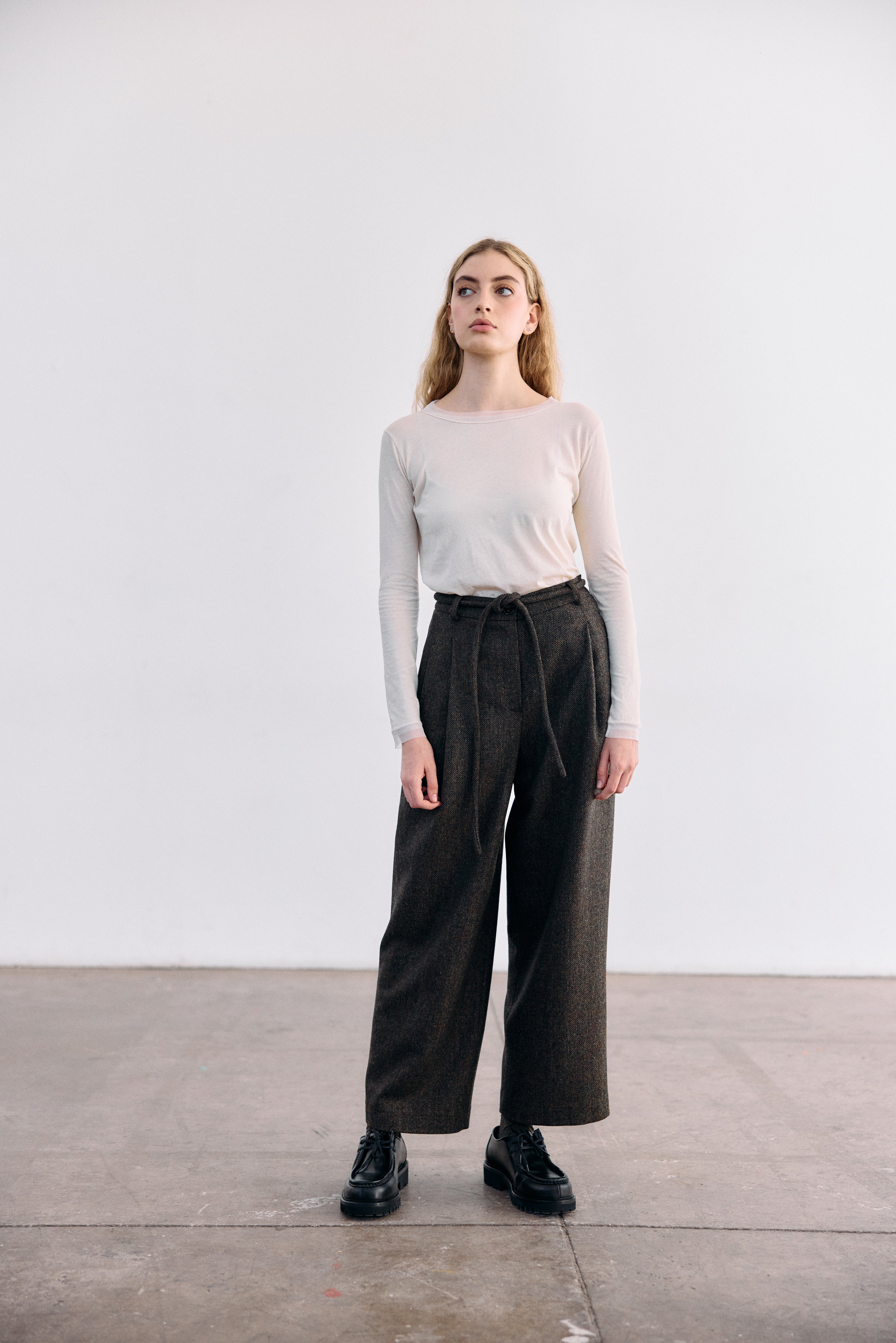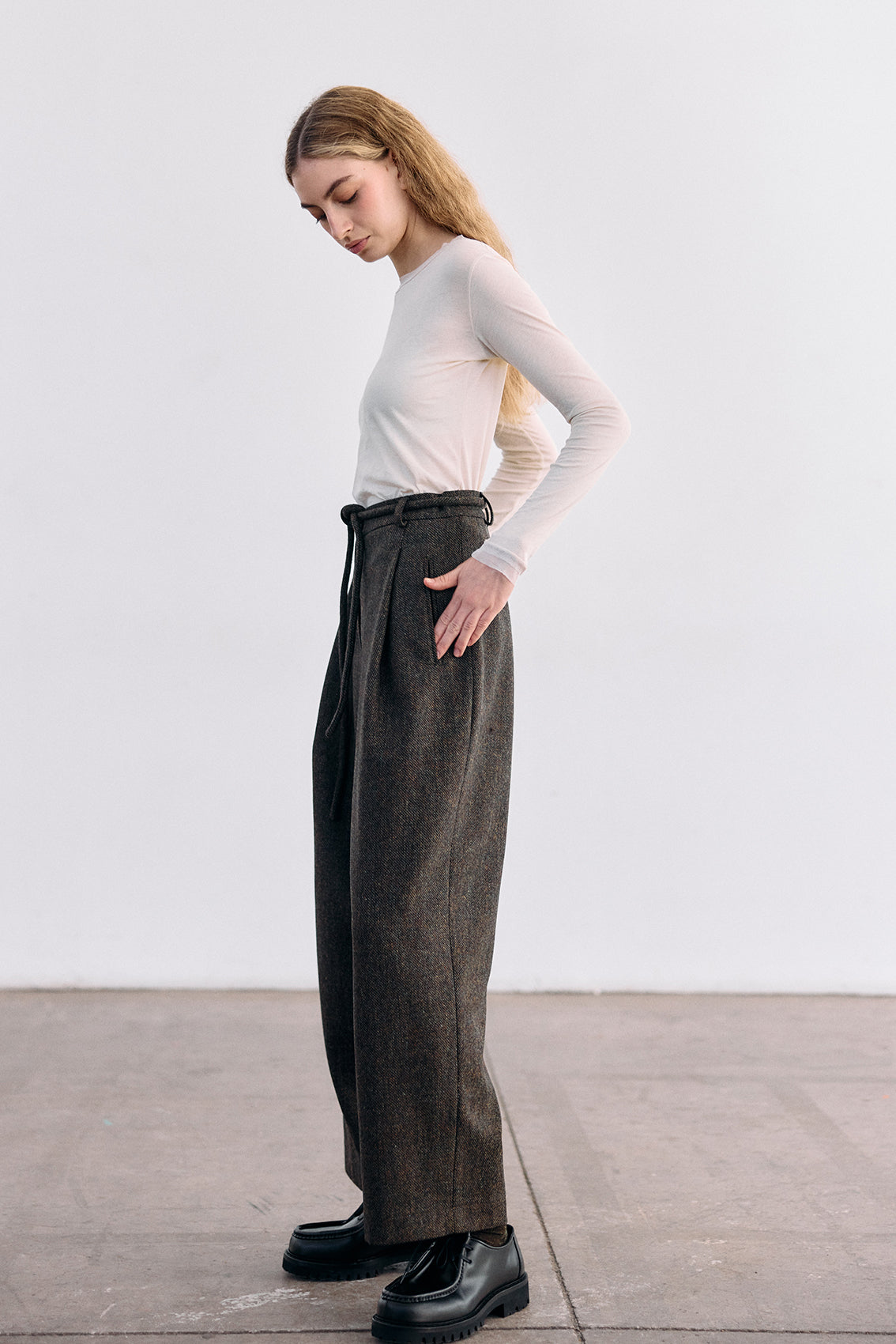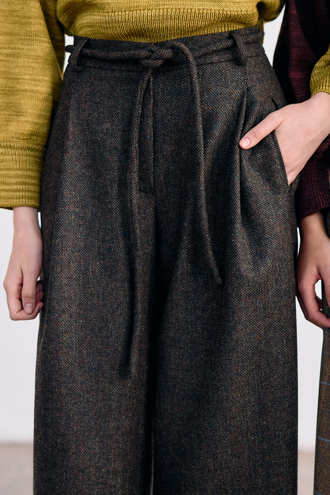 High-waisted straight-fit full-length trousers crafted in Portuguese 100% wool with a subtle plaid pattern. It features a pleat at the front and a matching tubular waist tie. Fully lined.