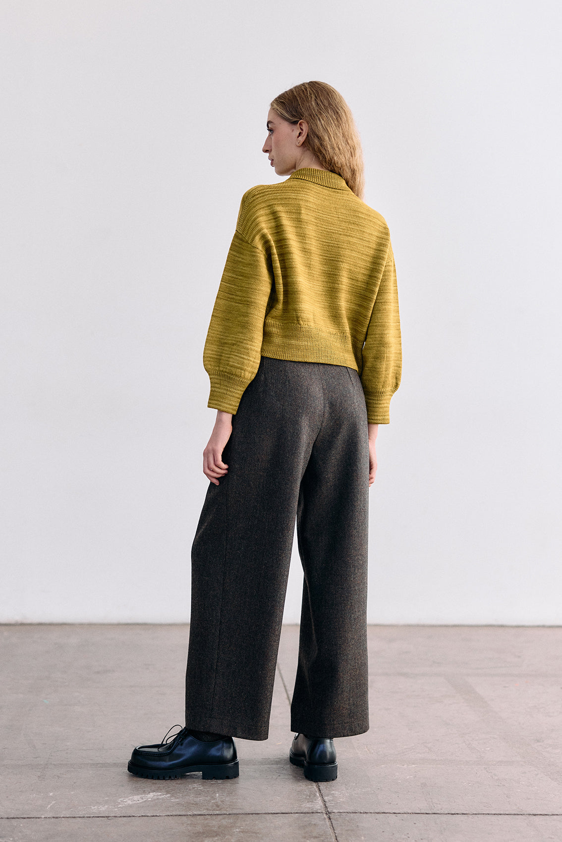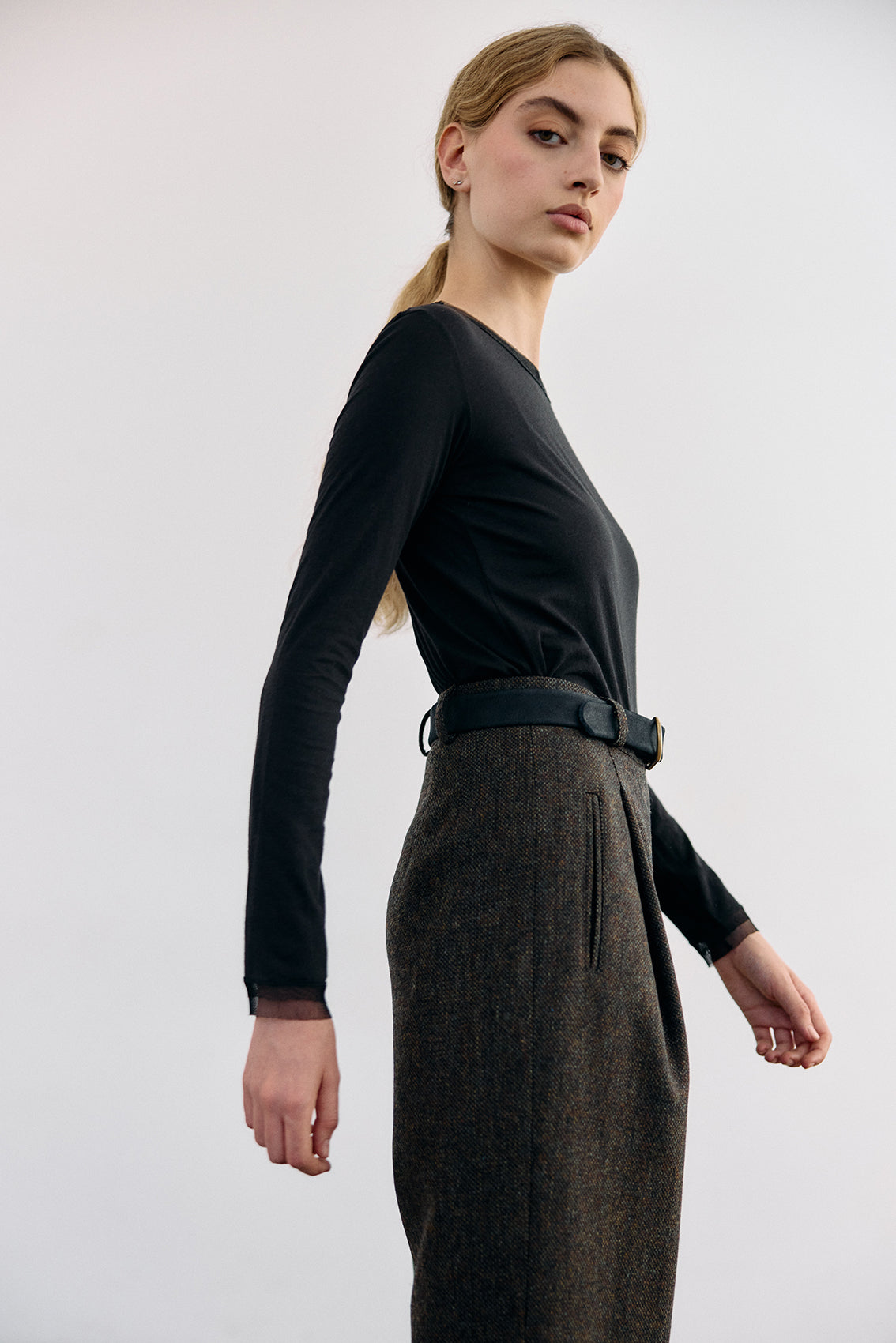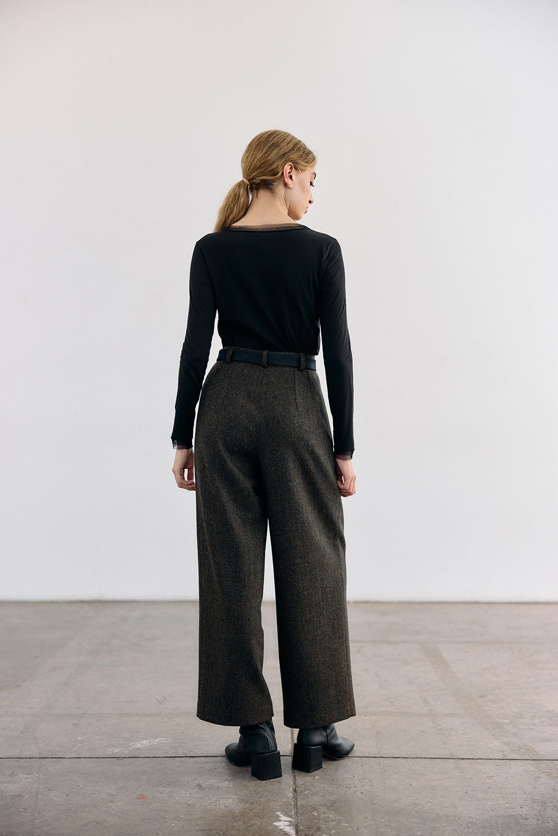 High-waisted straight-fit full-length trousers crafted in Portuguese 100% wool with a subtle plaid pattern. It features a pleat at the front and a matching tubular waist tie. Fully lined.
