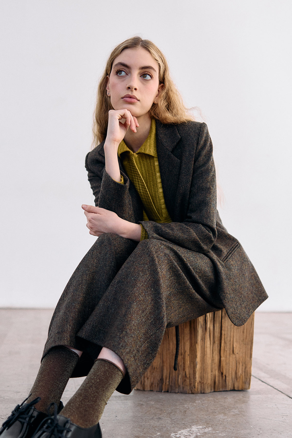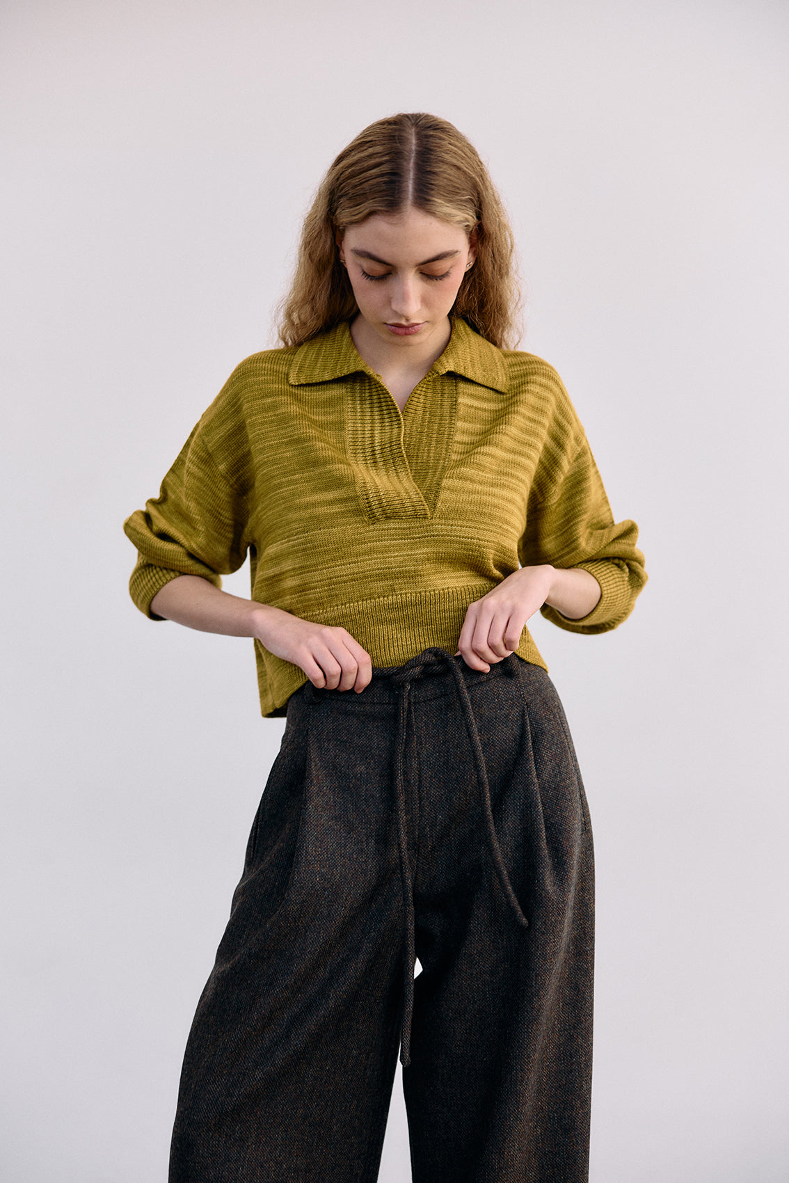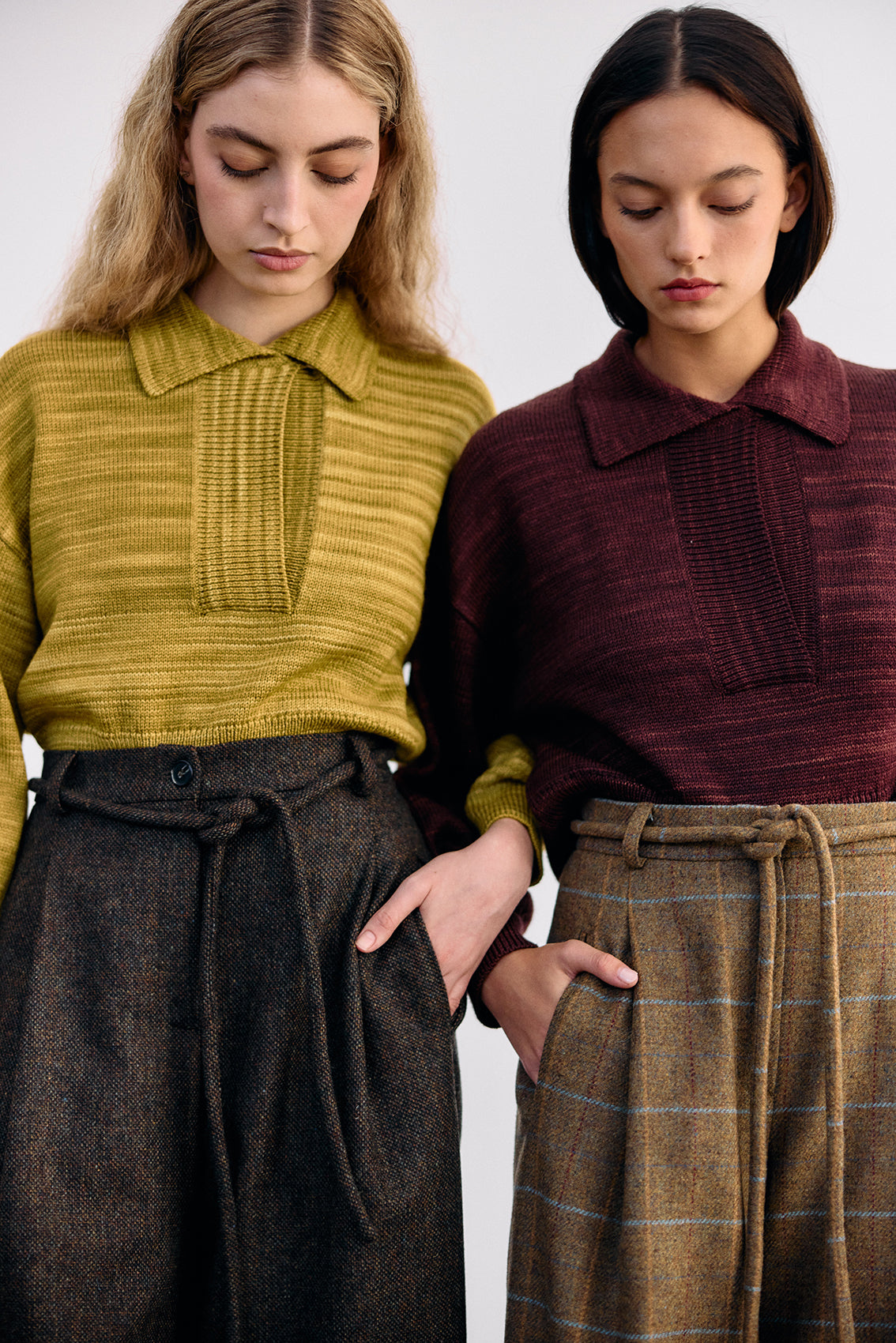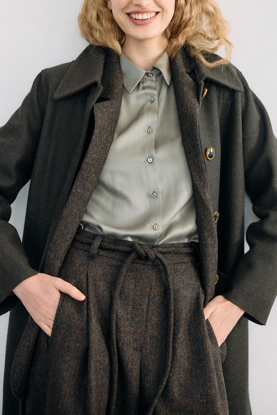 High-waisted straight-fit full-length trousers crafted in Portuguese 100% wool with a subtle plaid pattern. It features a pleat at the front and a matching tubular waist tie. Fully lined.