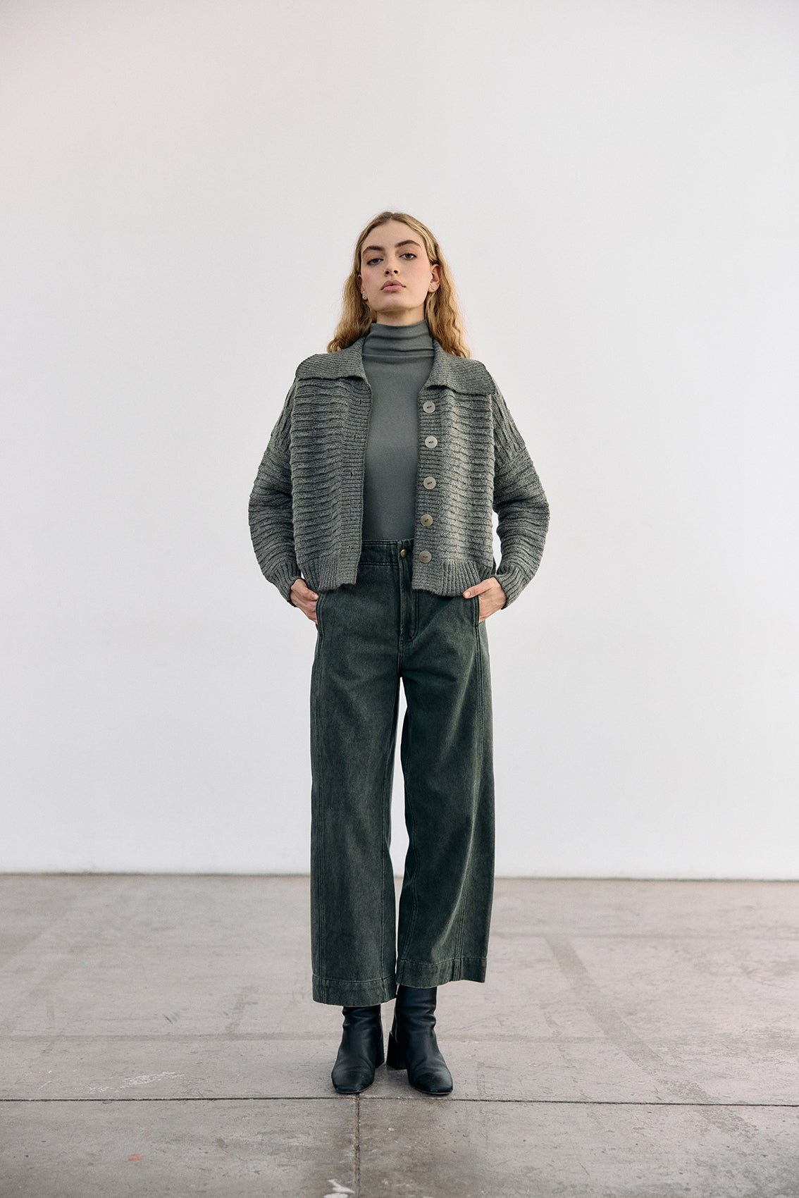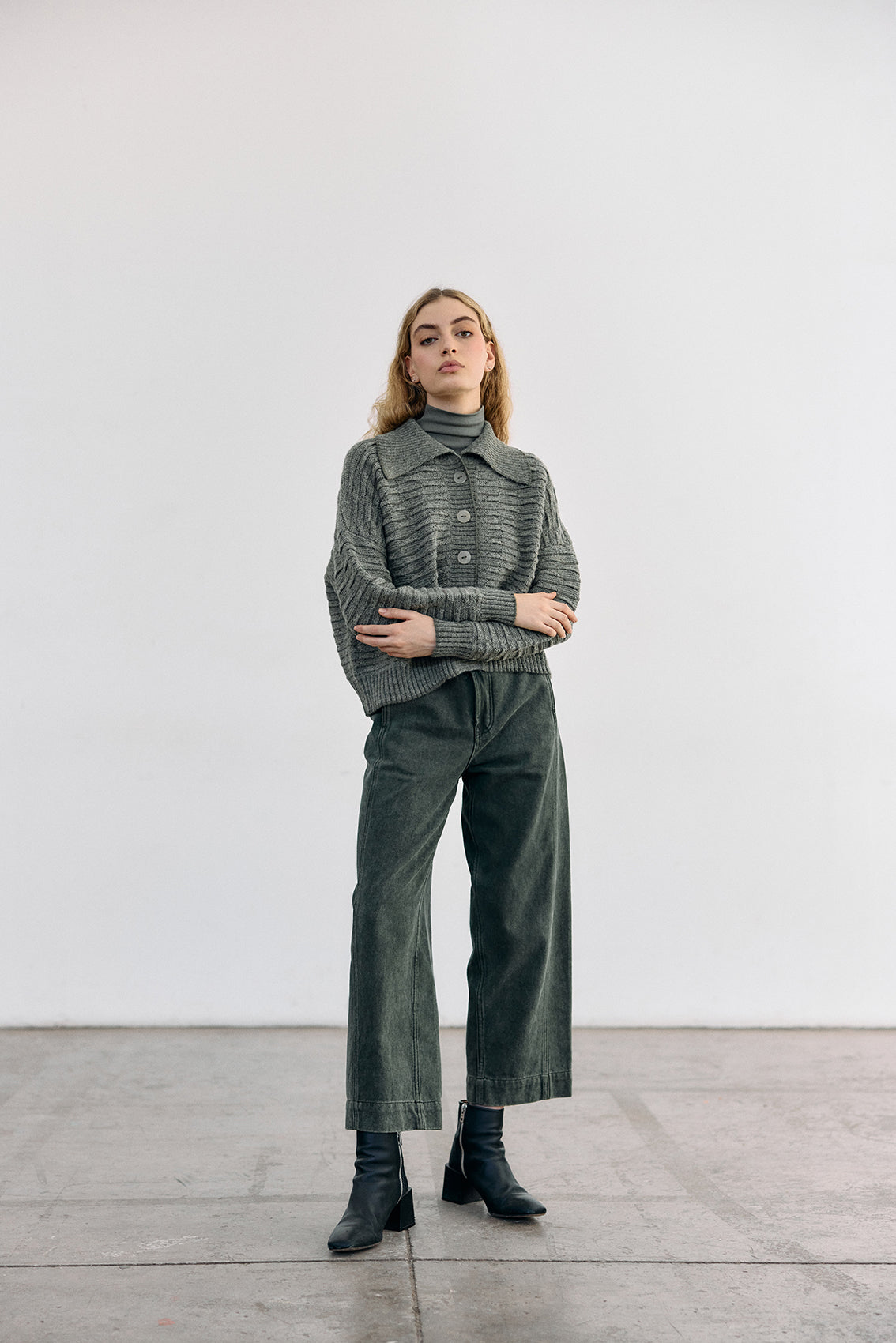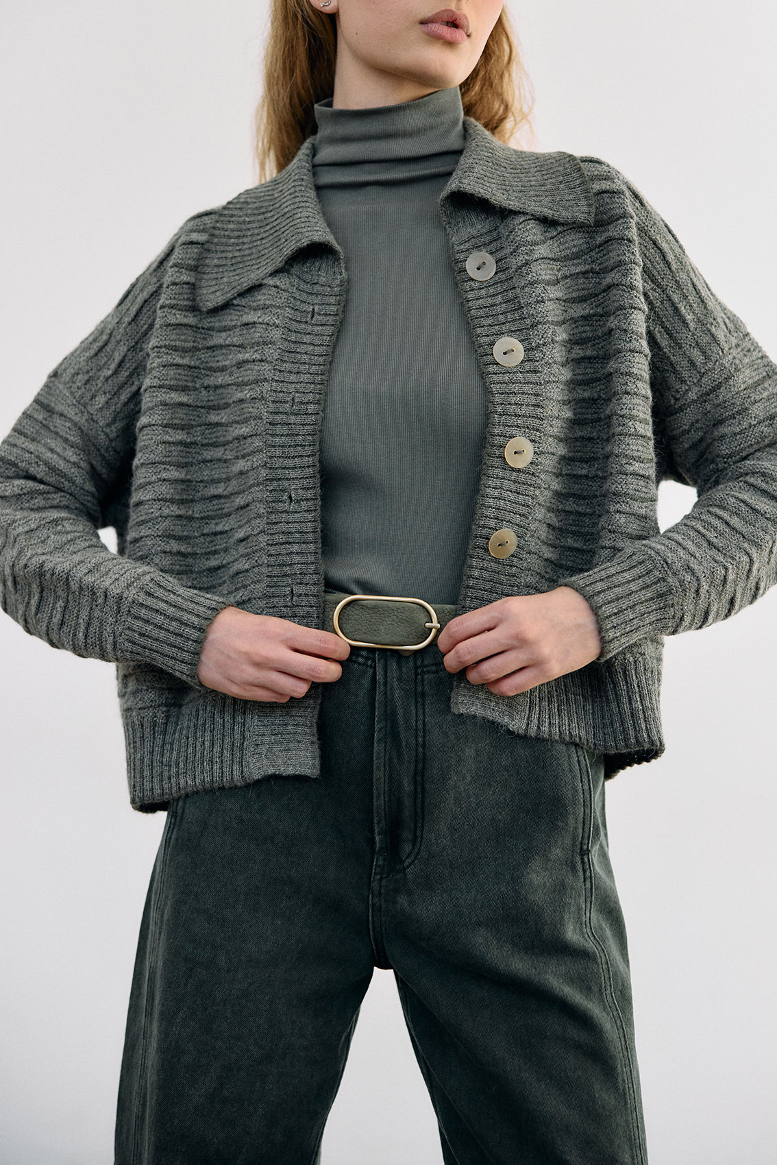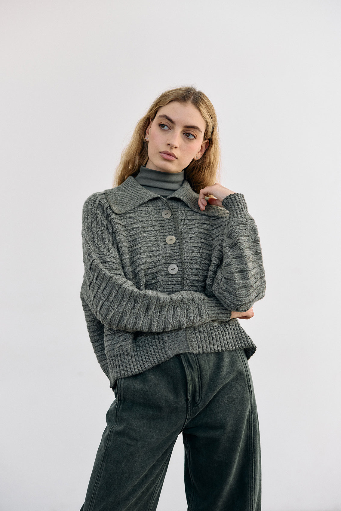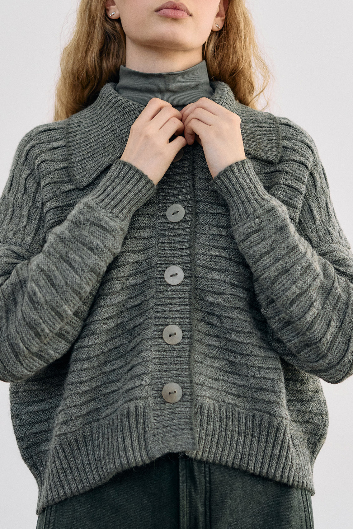 Textured Alpaca Knit Collar Cardigan - Musgo