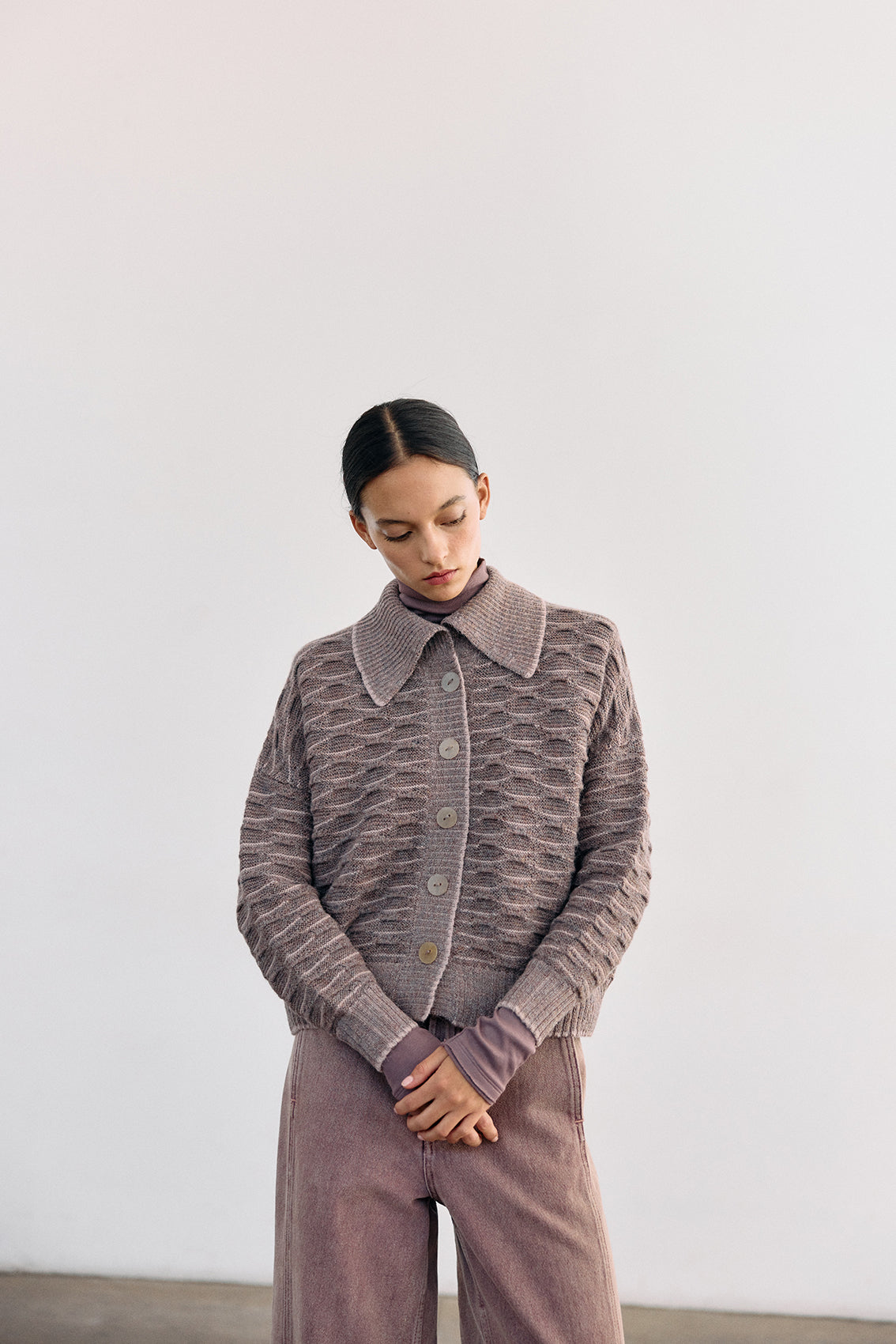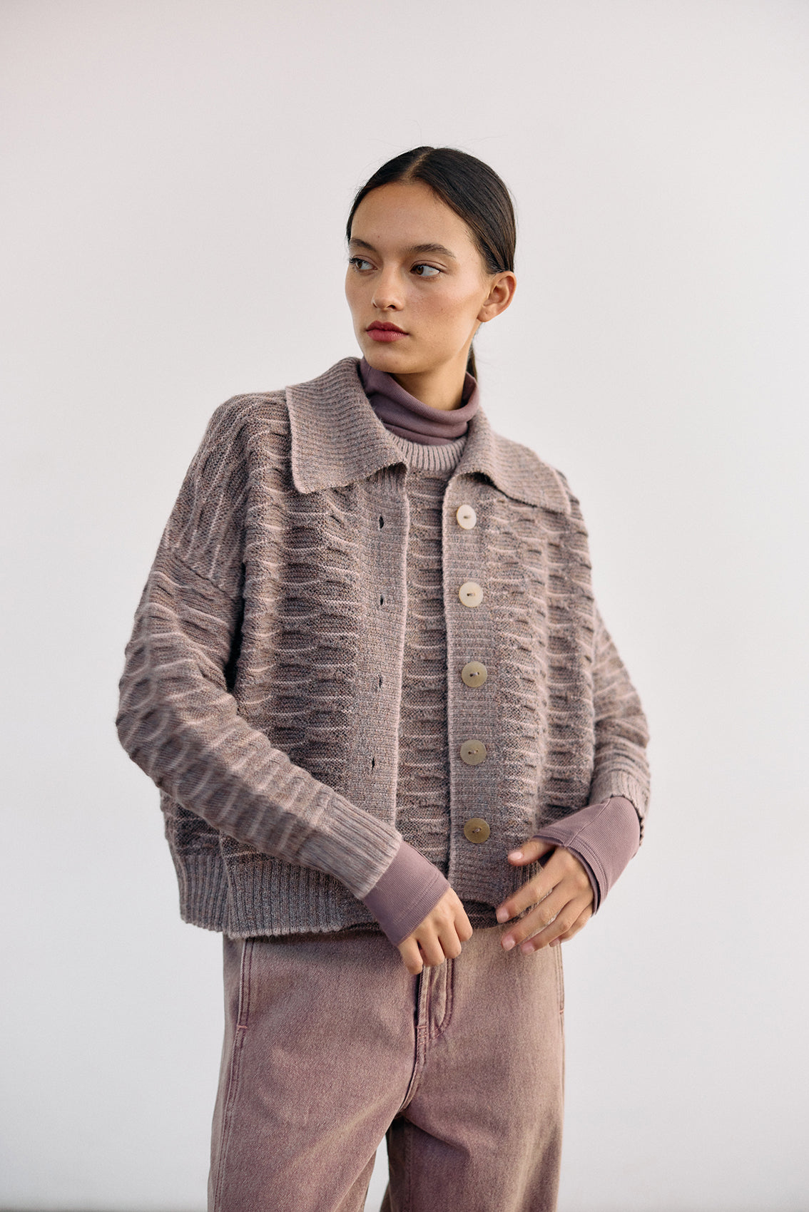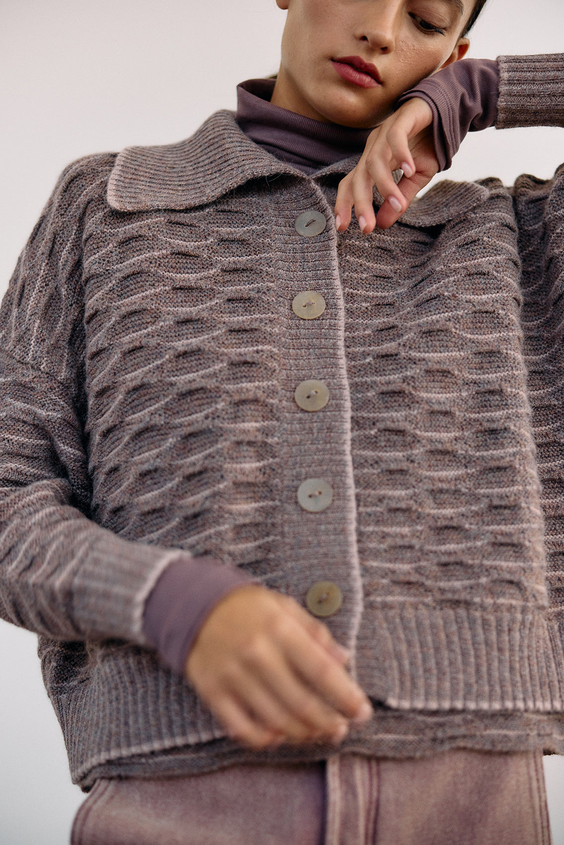 Unique oversized collared cardigan, woven in soft 100% alpaca. Designed with high-relief tubular textures on its surface, using special knitting techniques. A high-quality, carefully crafted, original knitted piece.