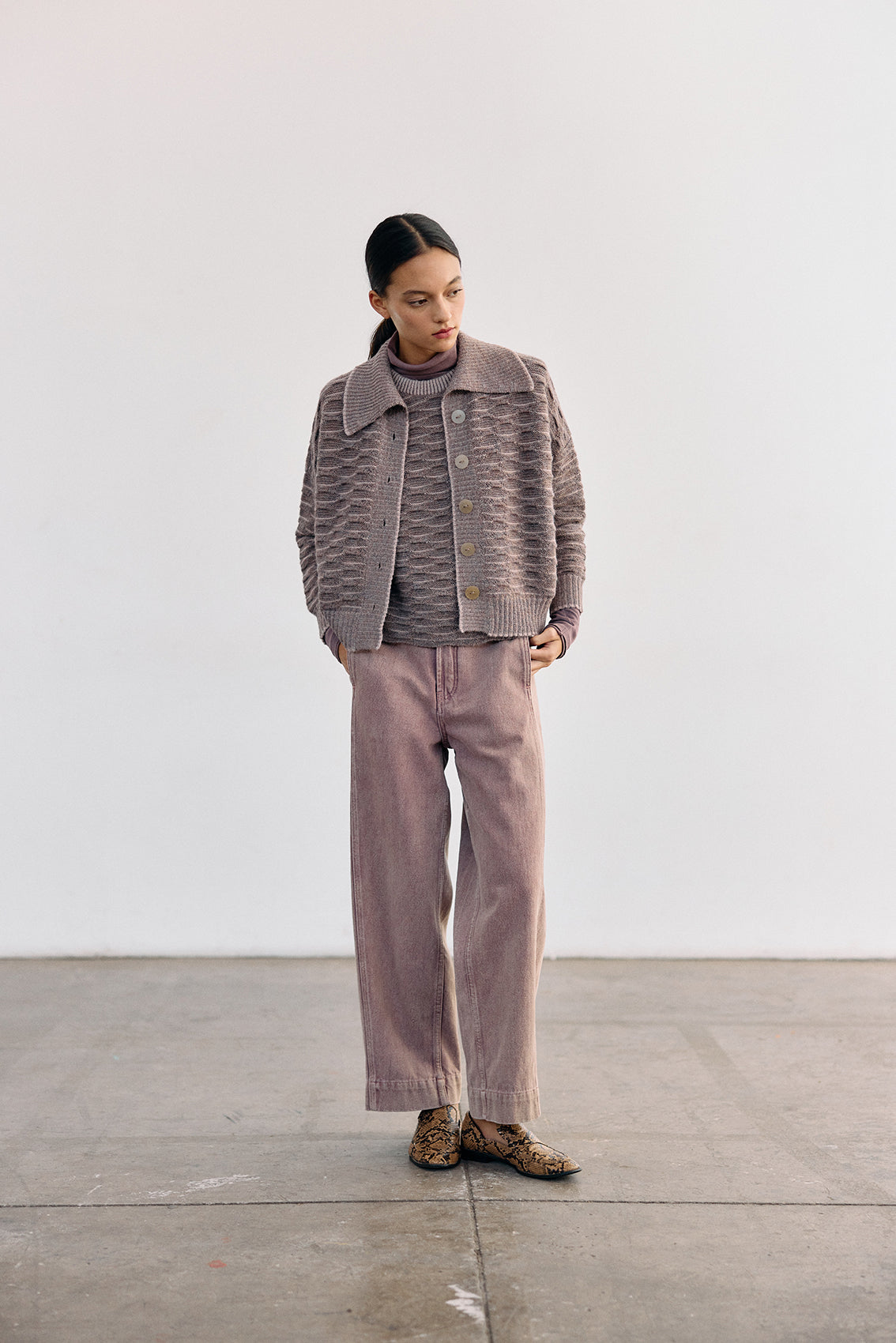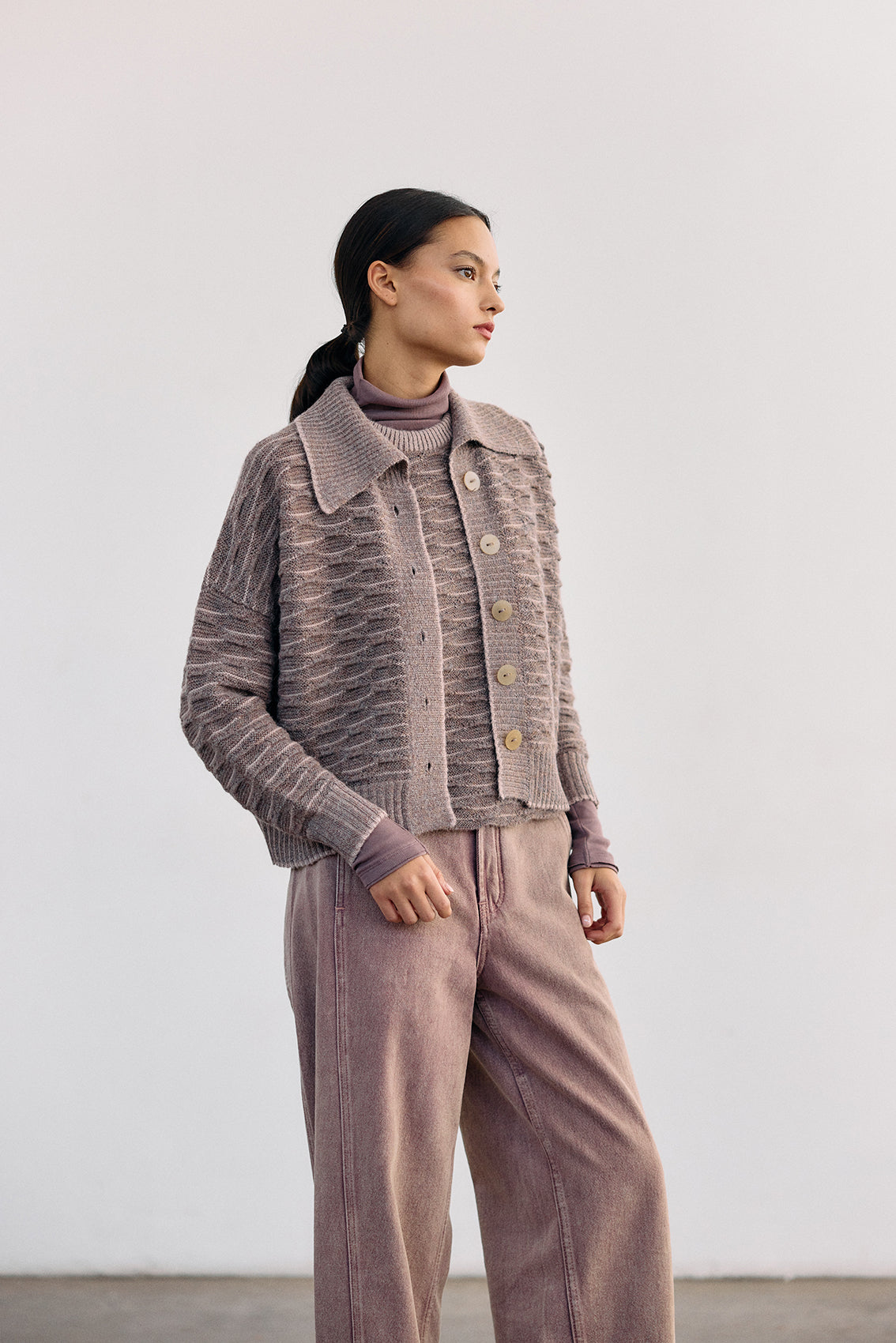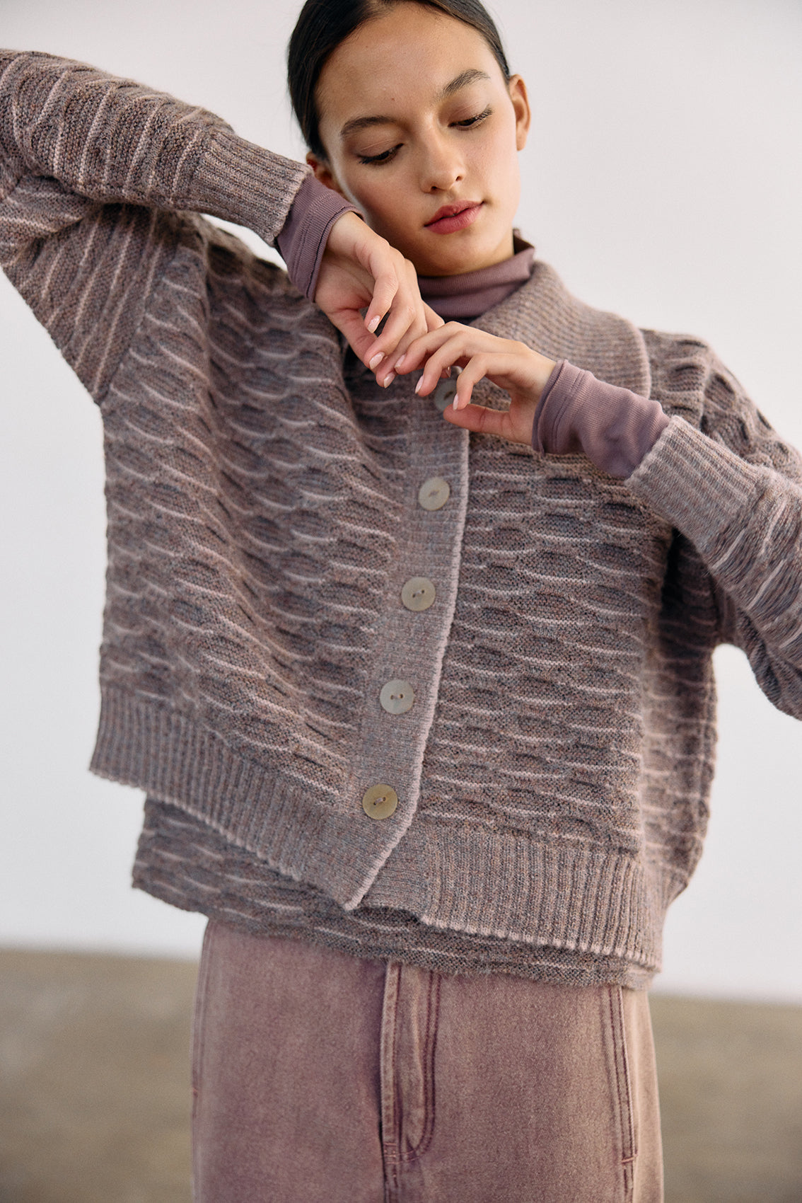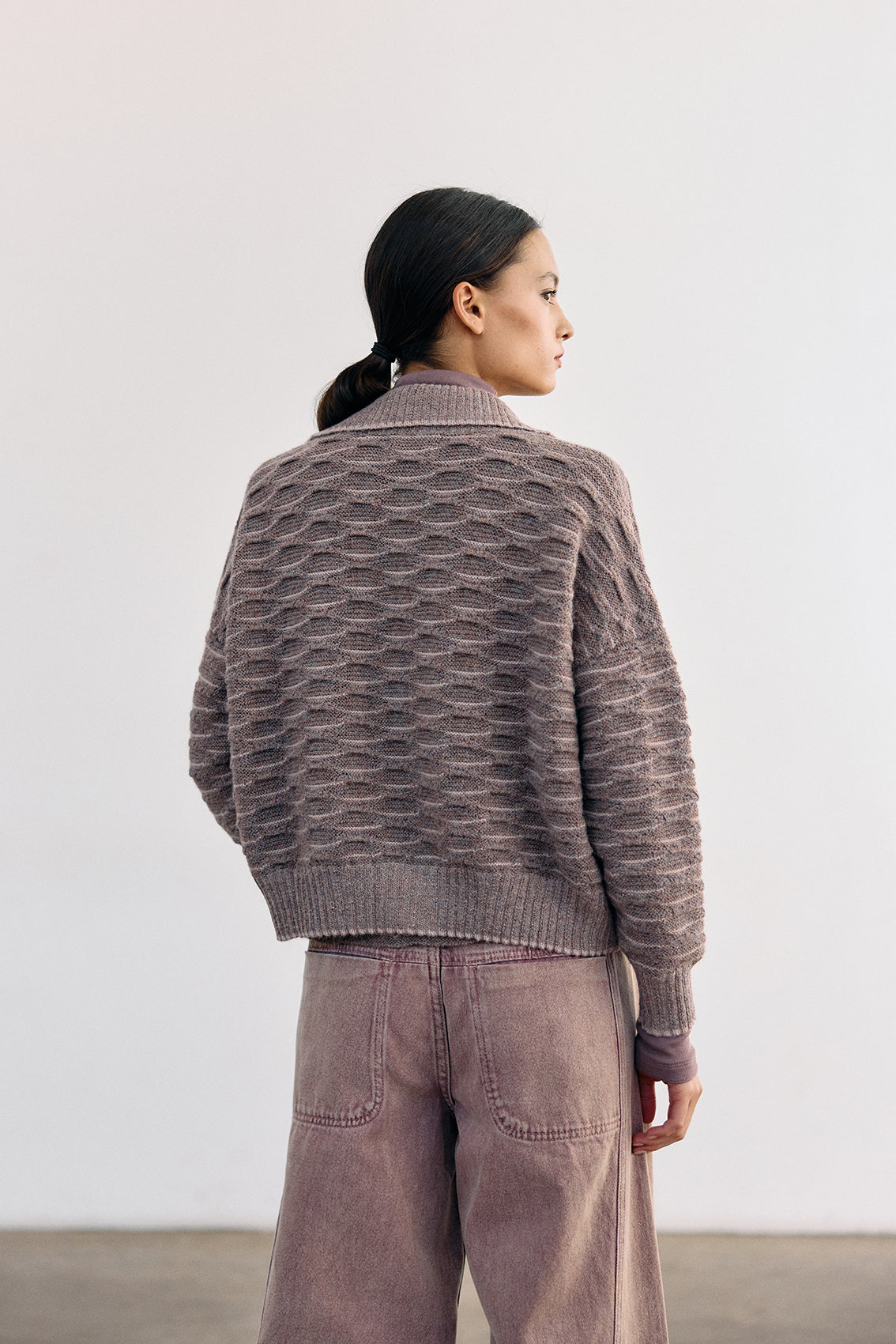 Unique oversized collared cardigan, woven in soft 100% alpaca. Designed with high-relief tubular textures on its surface, using special knitting techniques. A high-quality, carefully crafted, original knitted piece.