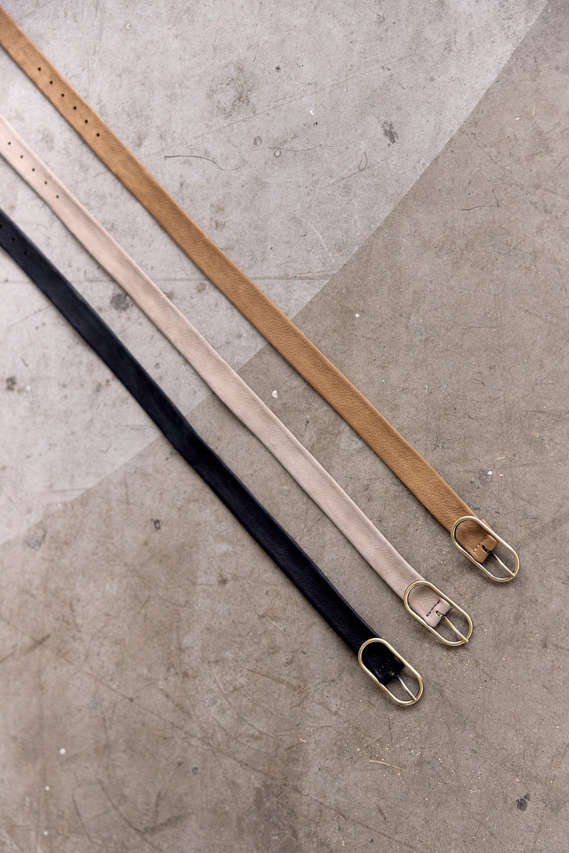 Cinturón de cuero flexible, con hebilla metálica hecha artesanalmente. Cosido y trabajado enteramente a mano en Chile.