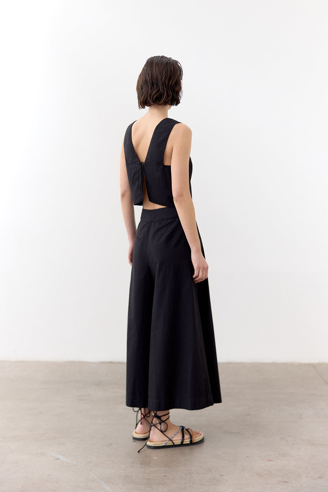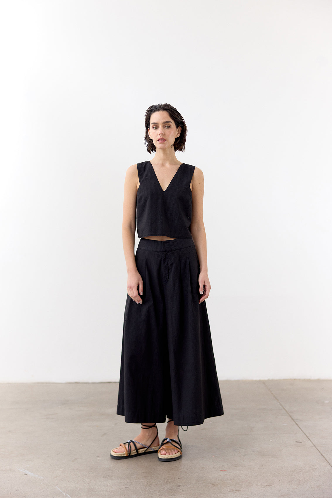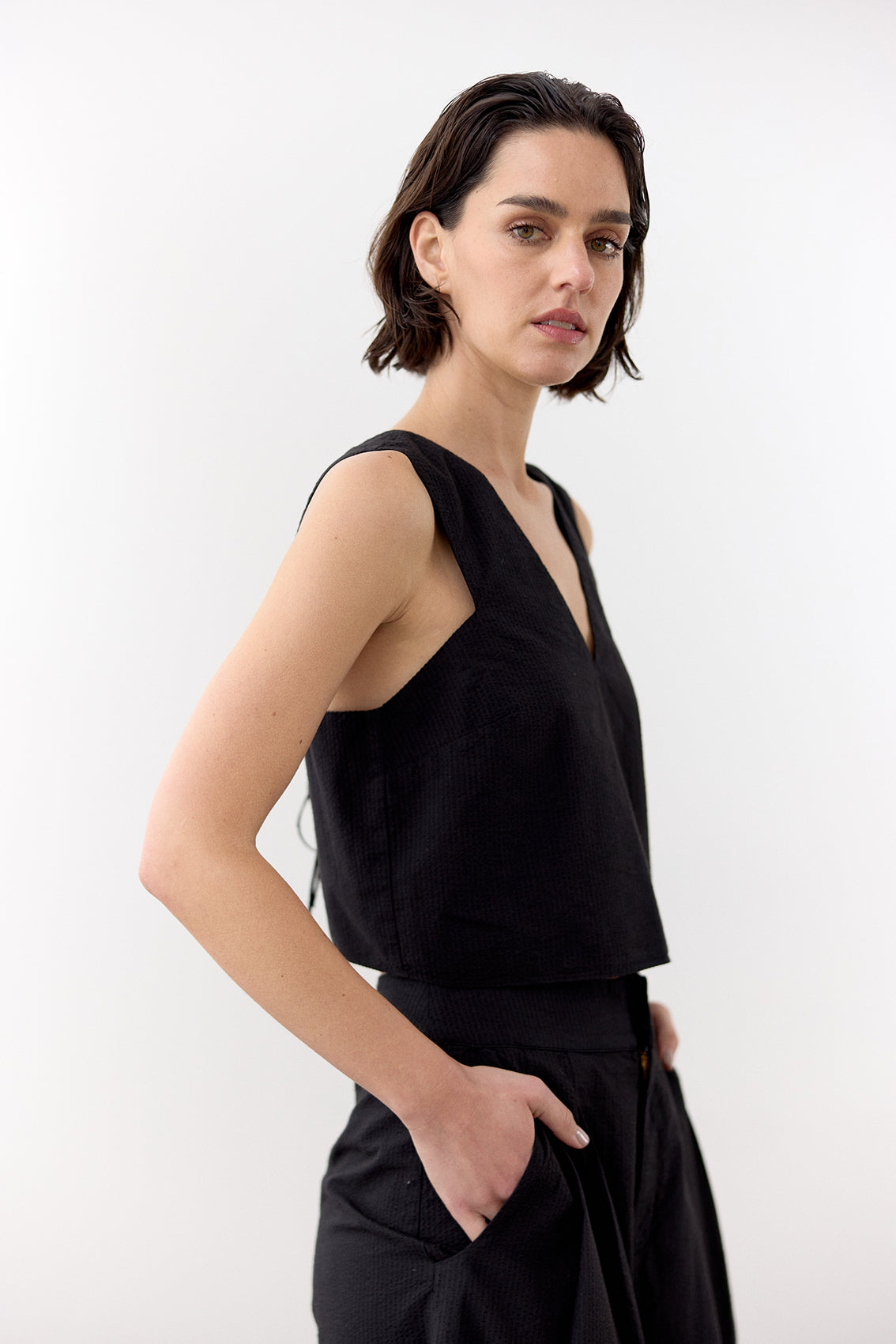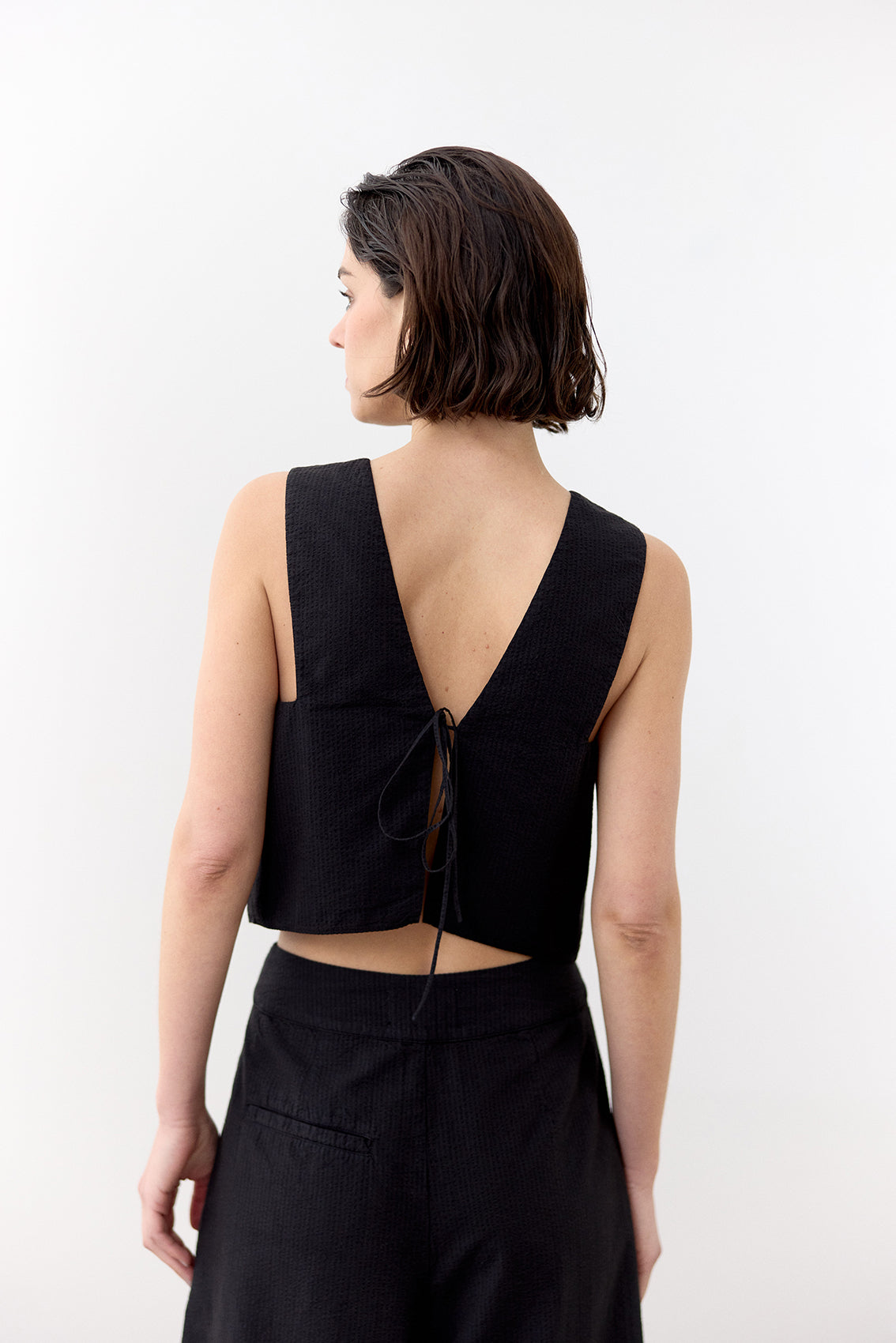 Lightweight sleeveless top with a v-neck in the front and a tied adjustable back. Crafted in 100% cotton with a seersucker effect. An everyday summer essential.