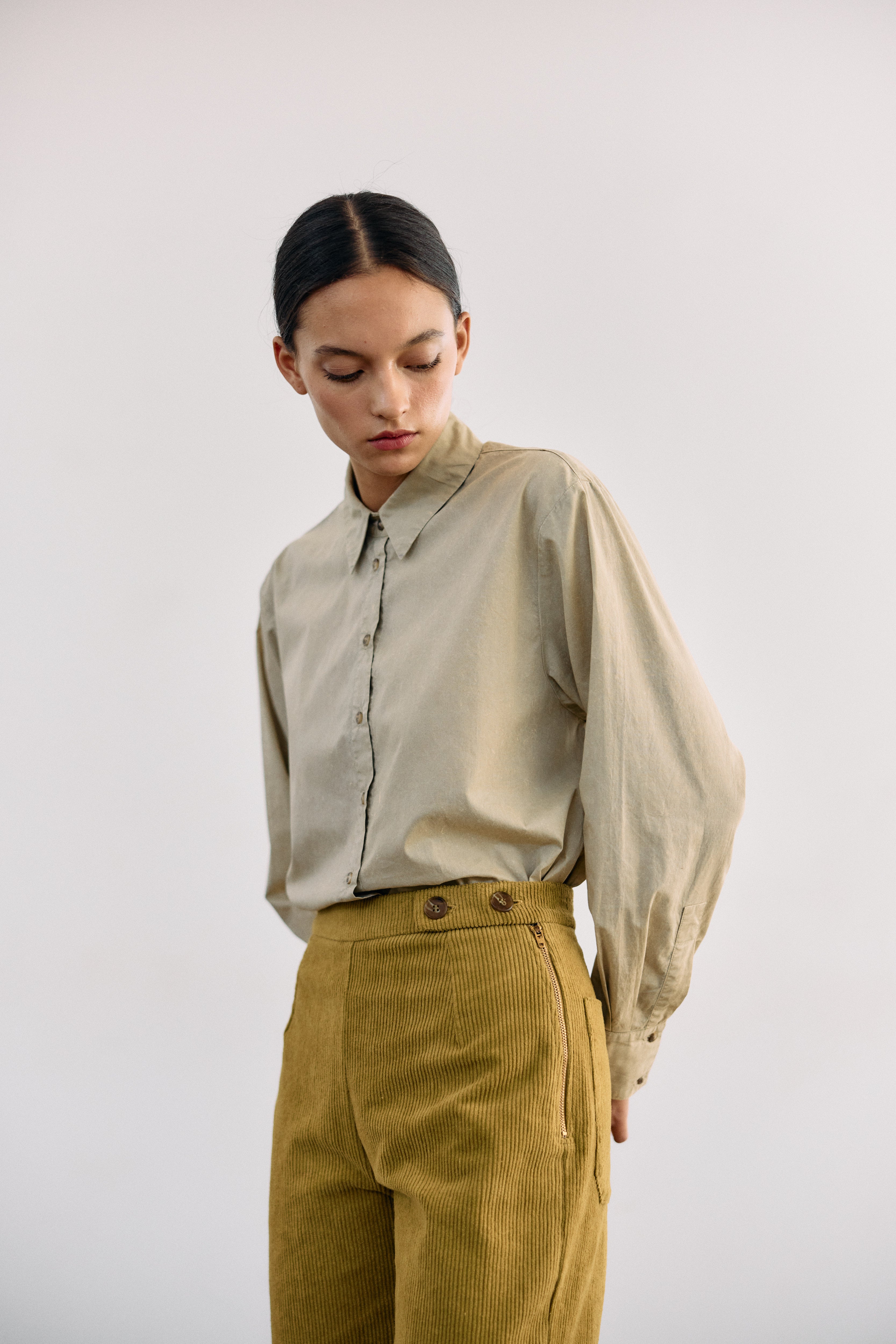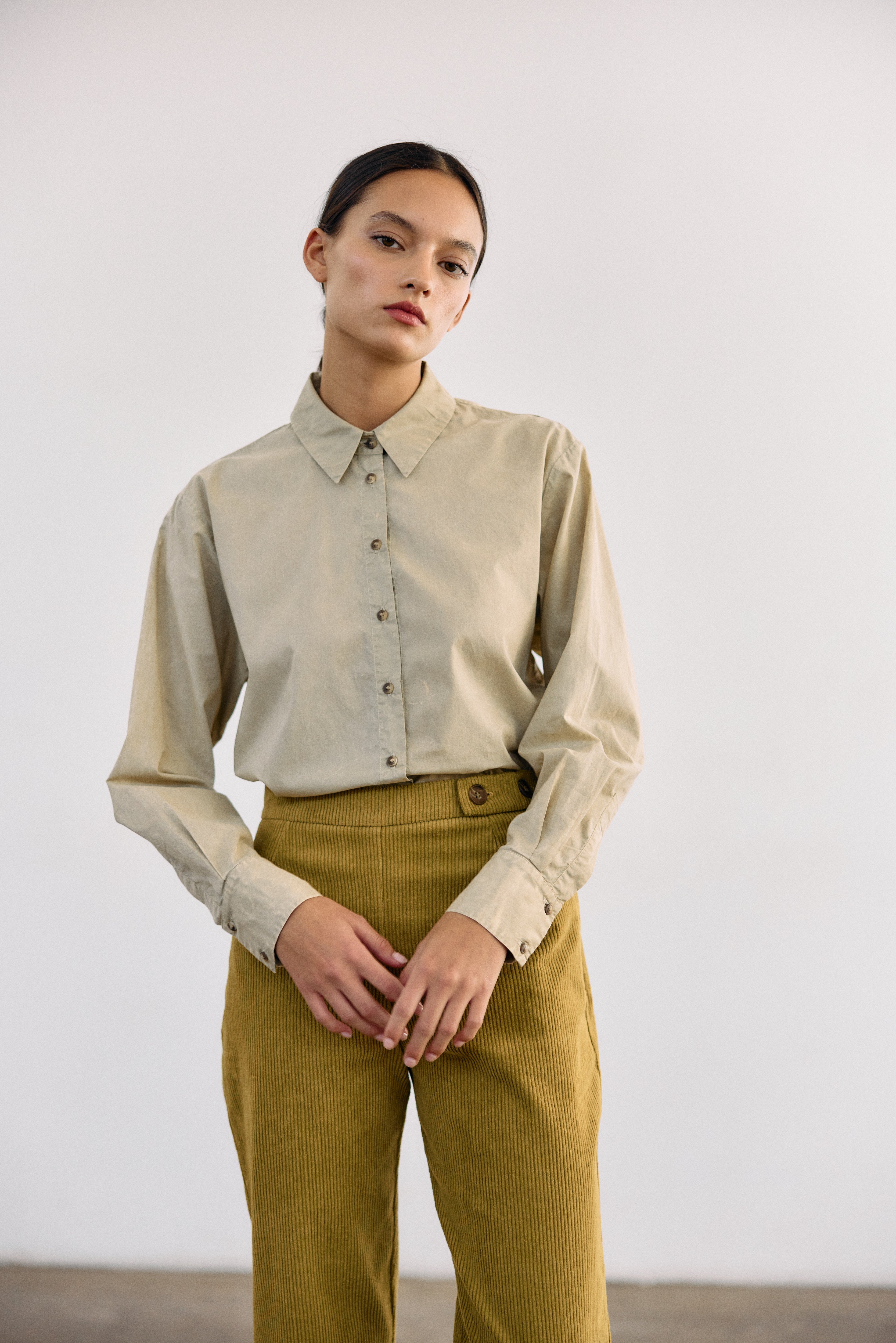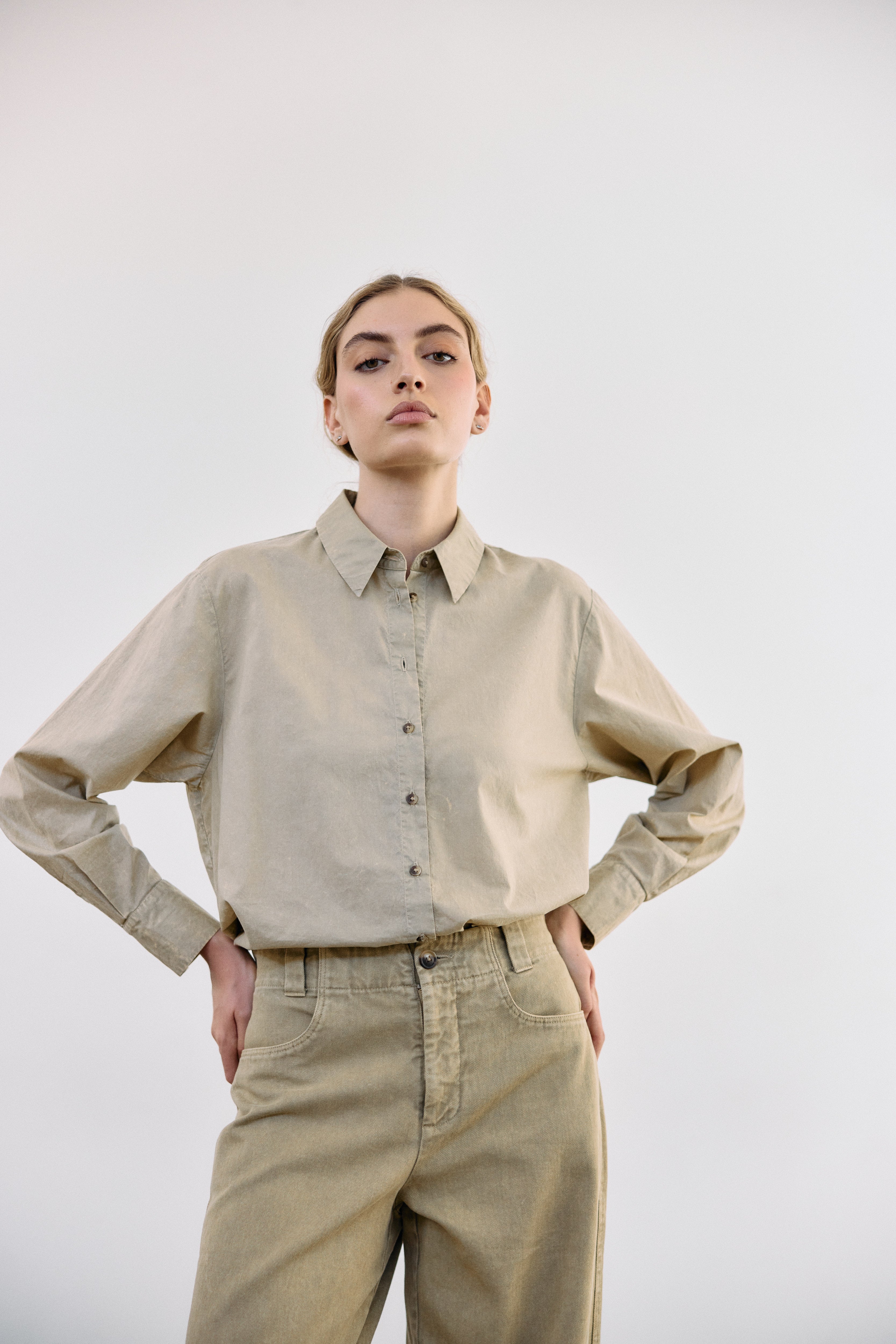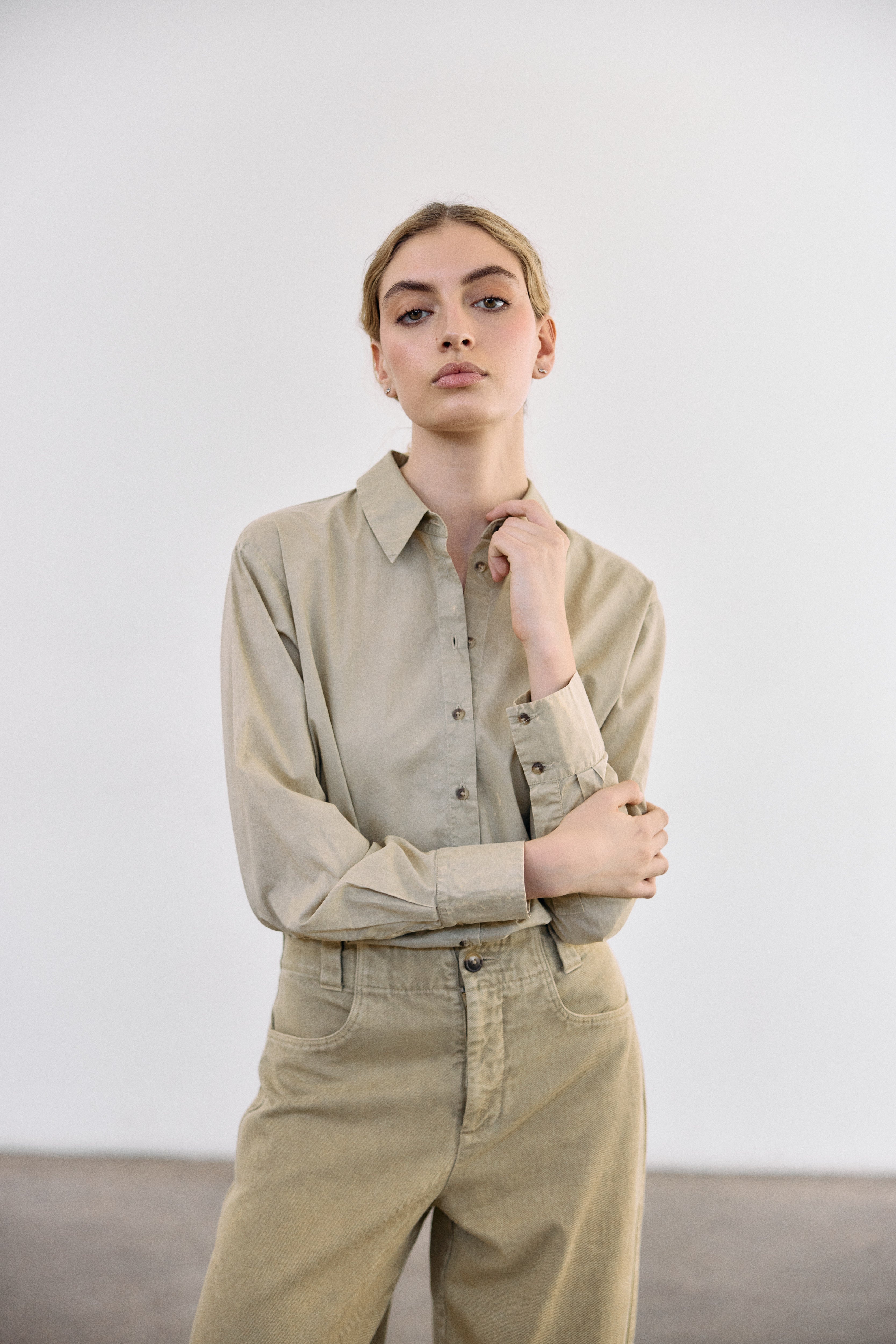 Essential shirt made in 100% pima cotton with a subtle washed effect. This blouse features a classic collar and cuffs, a front button closure, and a slightly oversized silhouette.