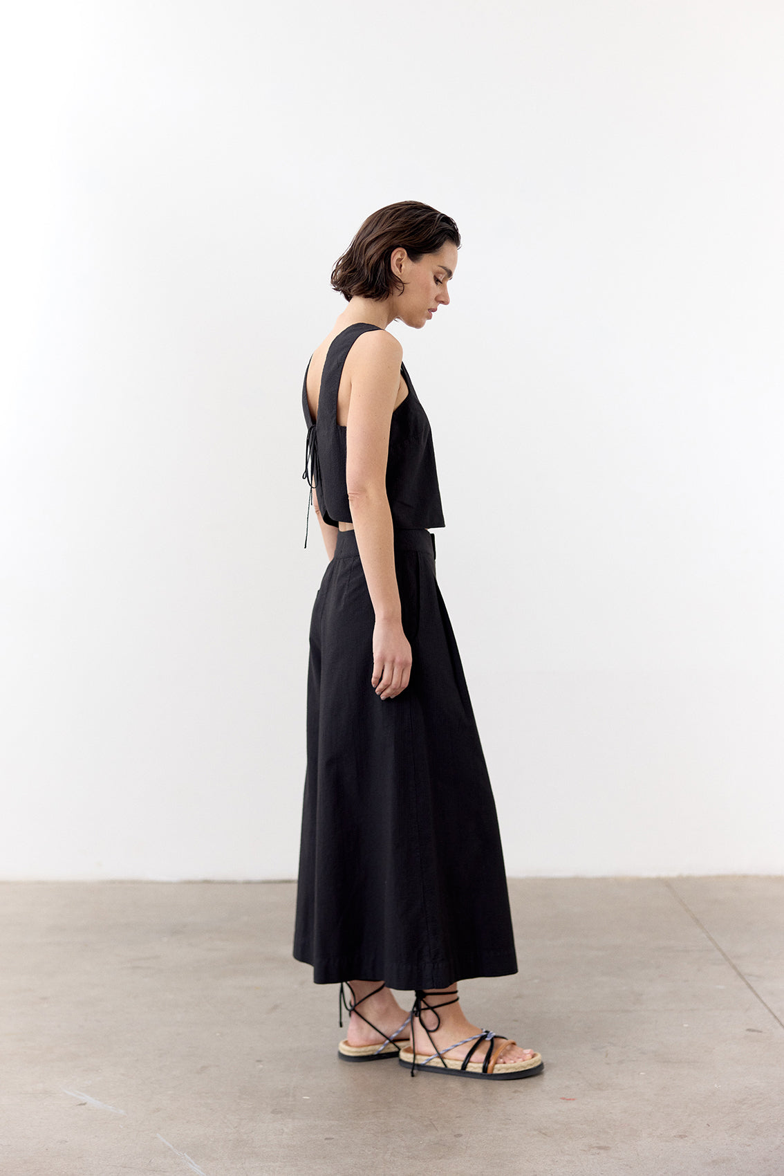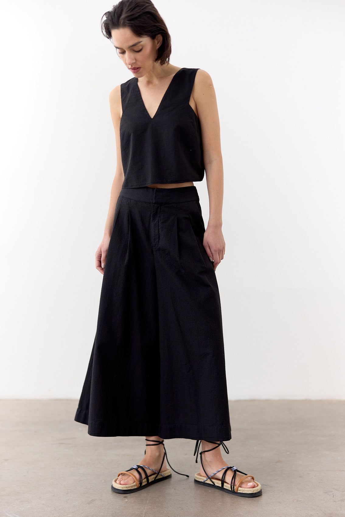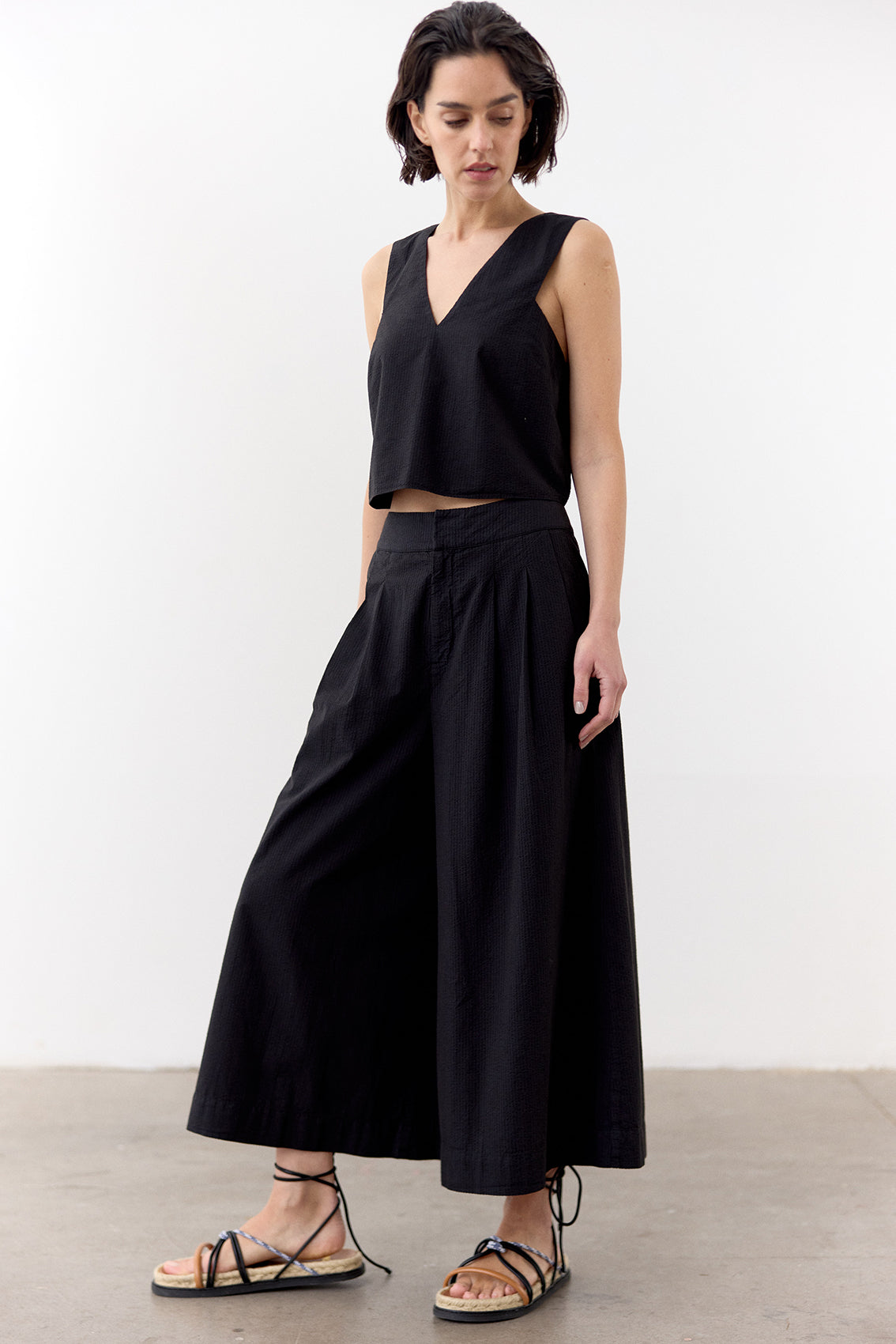 Wide-leg lightweight summer trousers made in 100% cotton with a soft seersucker effect. These high-waisted poplin pants feature front pleats, functional side pockets, a comfortable waistband, and a single back pocket. A relaxed silhouette designed for every day.